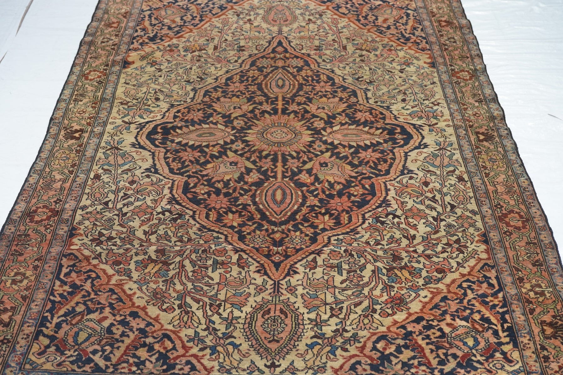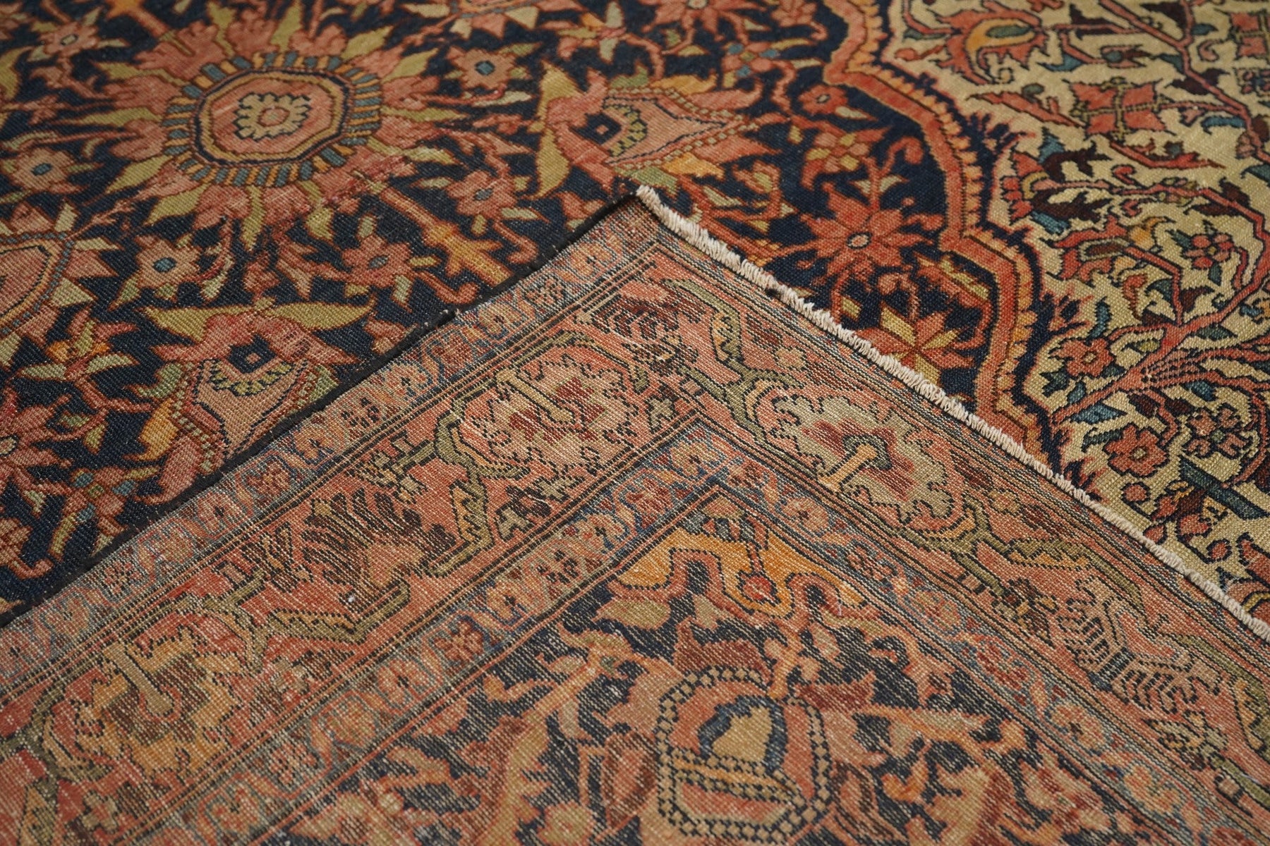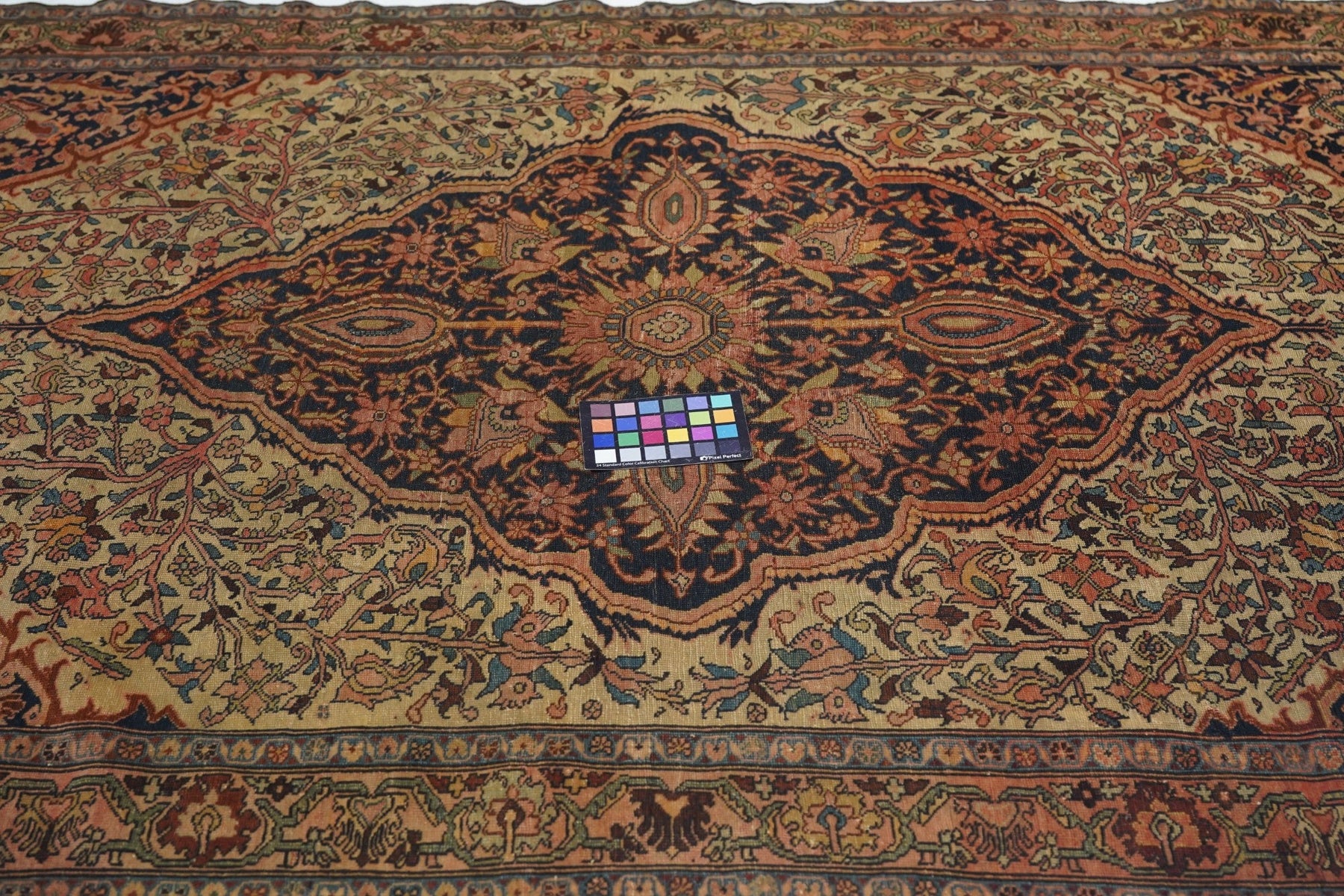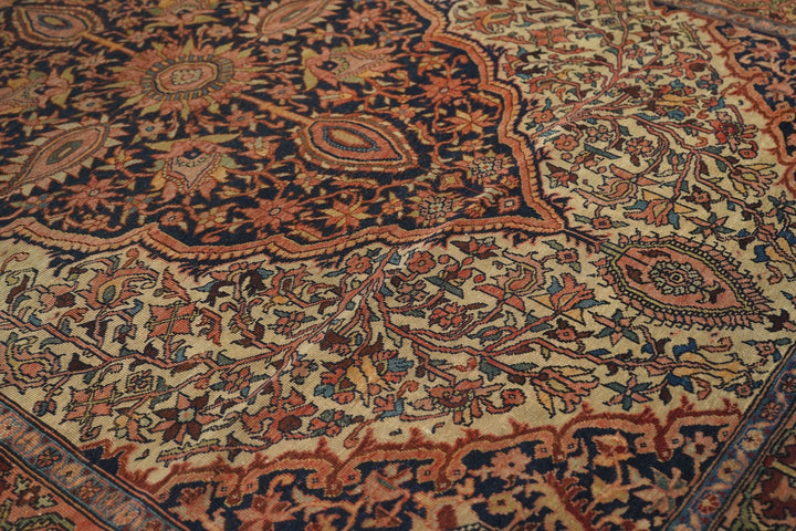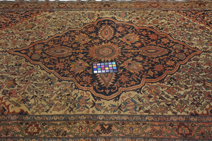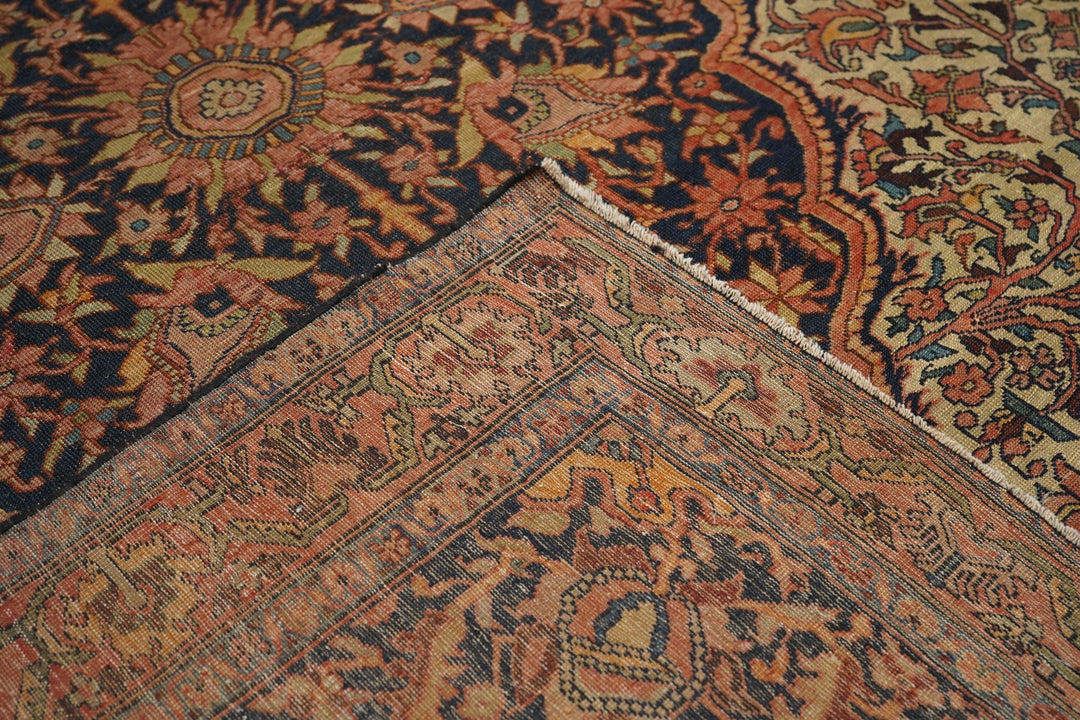 This is a “Mishan”, i.e. urban style, west Persian Malayer, with a palmette pendanted navy medallion with a scalloped edge, and a dominant sunburst rosette and radiating palmette cruciform centre. Ecru-straw field filled with flowers and curvy stems, and navy corners with arabesques. Light rose-tan border with triangular palmettes developing from a meander. Fine weave on cotton, thin and flexible.