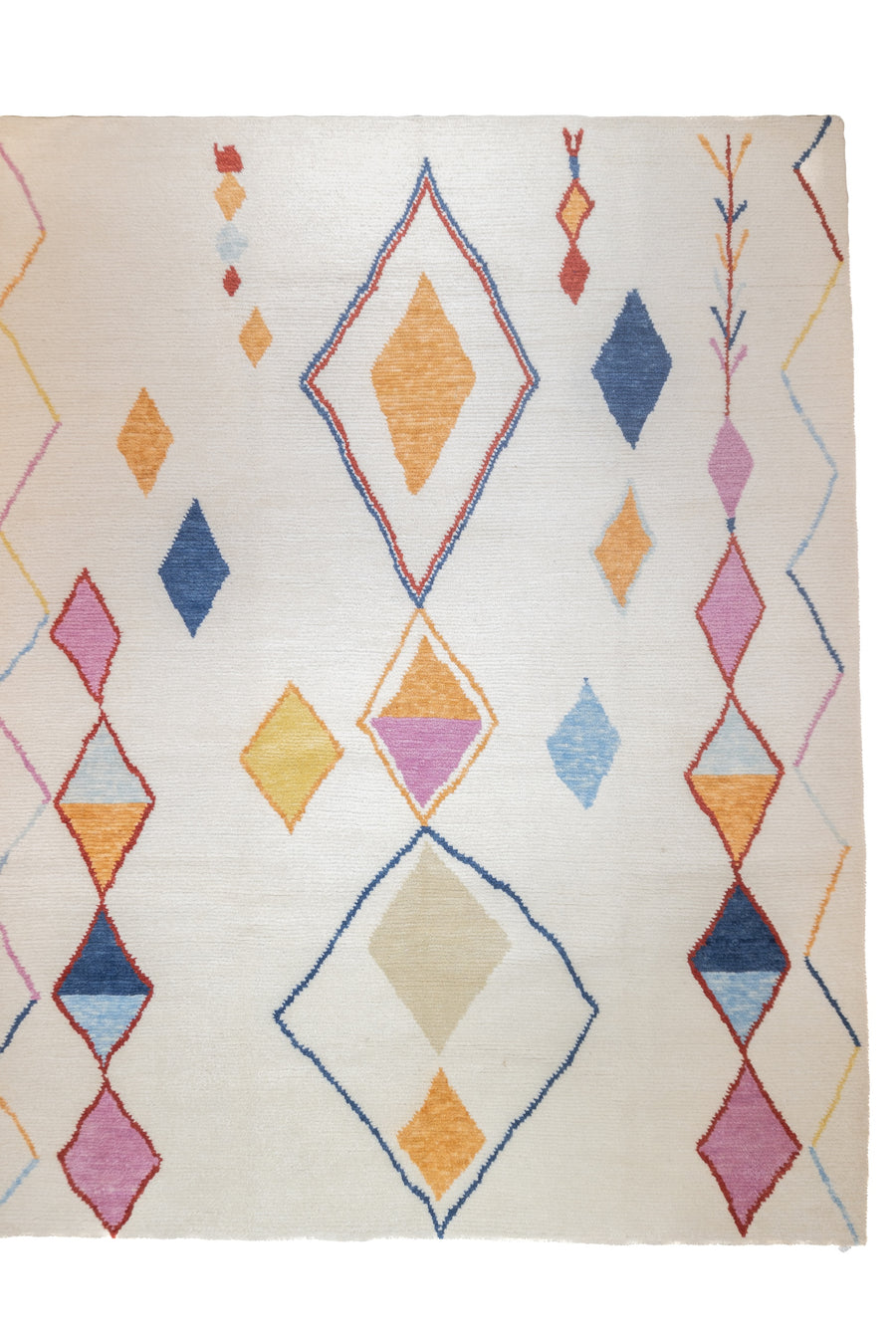 Comprising both the nomadic Berber rugs of the Atlas Mountains, with very thick piles, coarse knotting and limited palettes, and the more colorful, coarse to moderate rugs woven around Rabat, often with Anatolian patterns. Generic type also includes mixed technique rustic pieces. Long rugs, also runners and scatters.