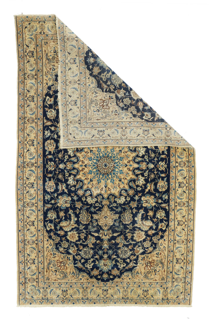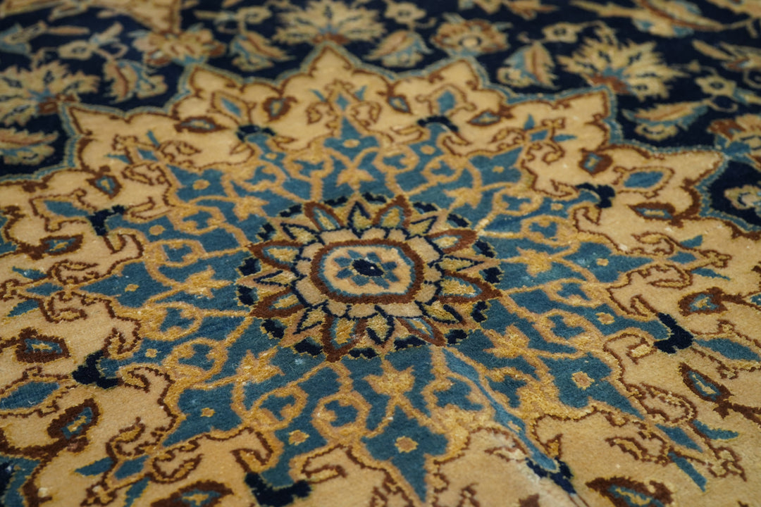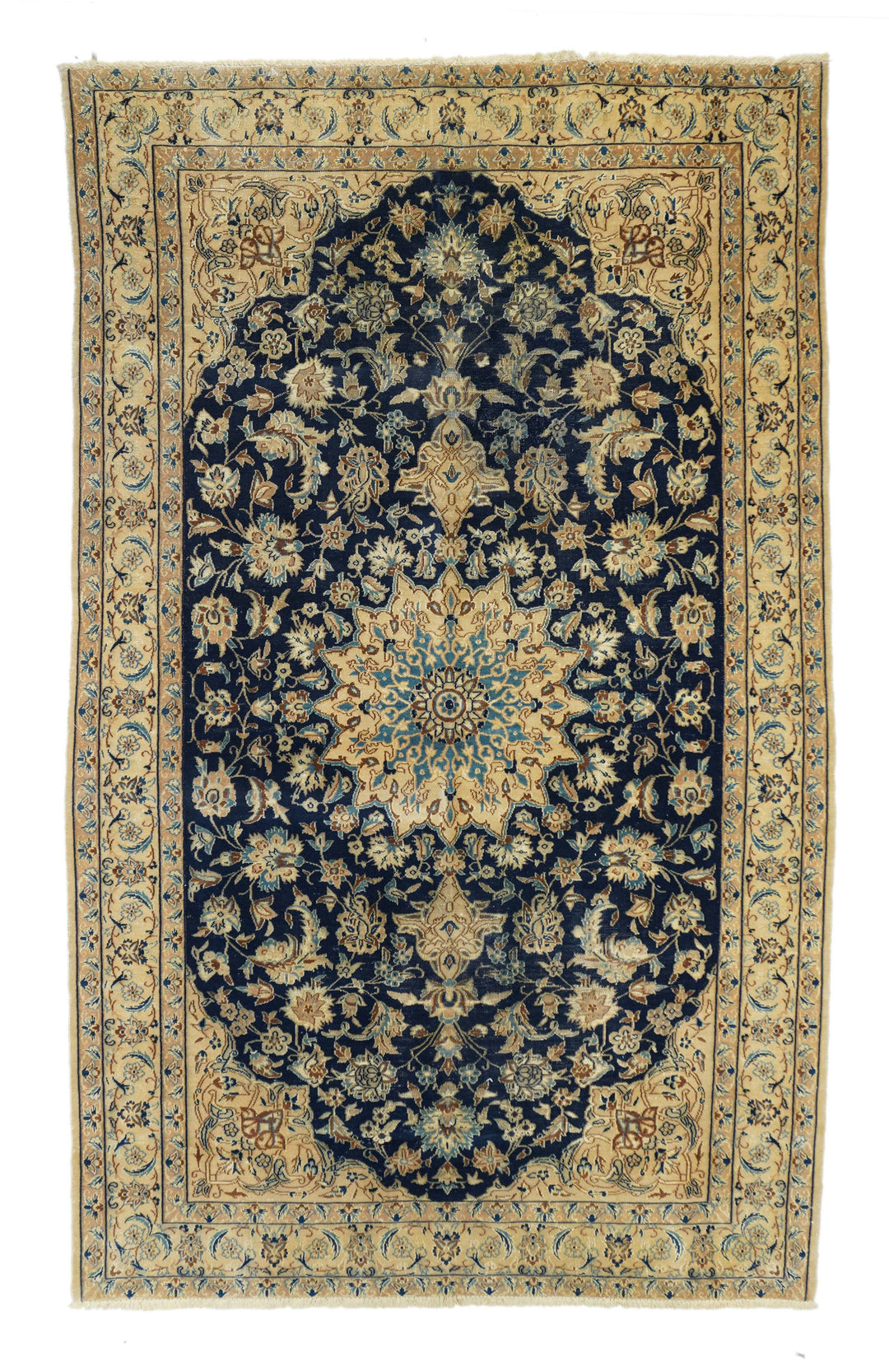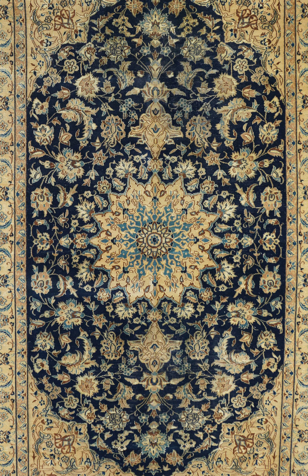 A finely knotted central Persian city scatter at a very reasonable price! The navy field centres a round straw 16-point medallion with escutcheon pendants, and a medium blue conformal sub-medallion. The palmettes and leaves of the field are kept in check by the straw corners patterned with forking arabesques. Straw border with small rosettes and equally petit petal palmettes. Vintage. Good condition.