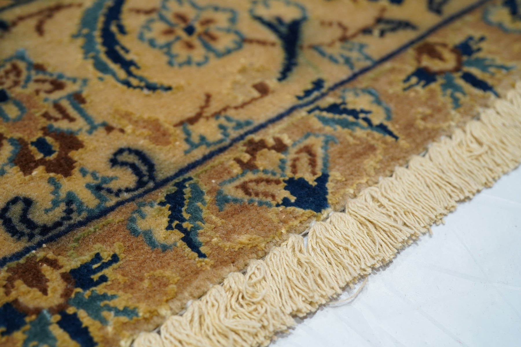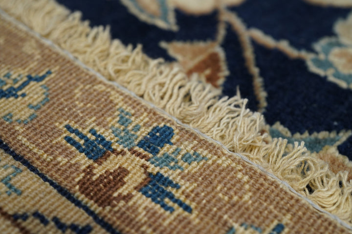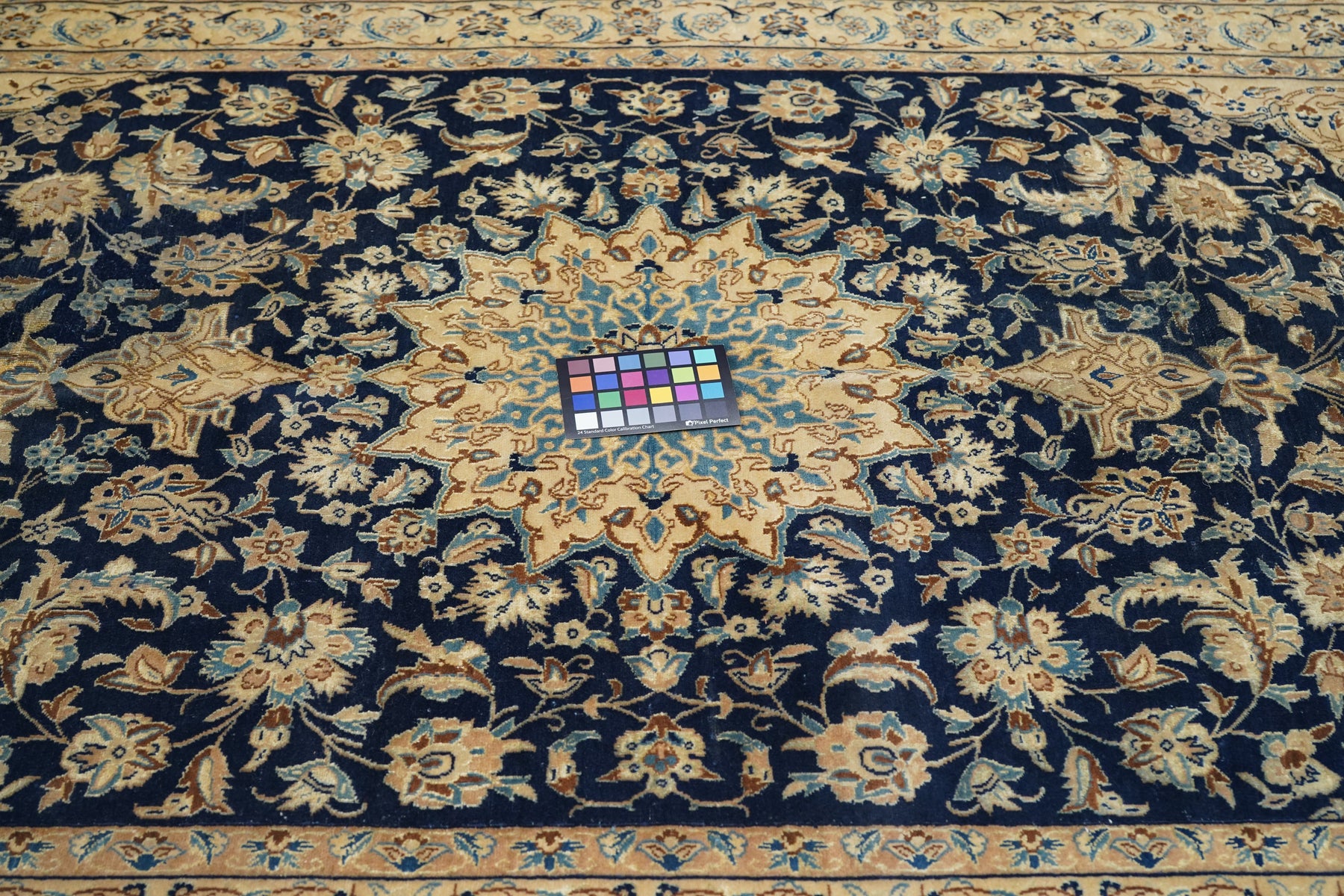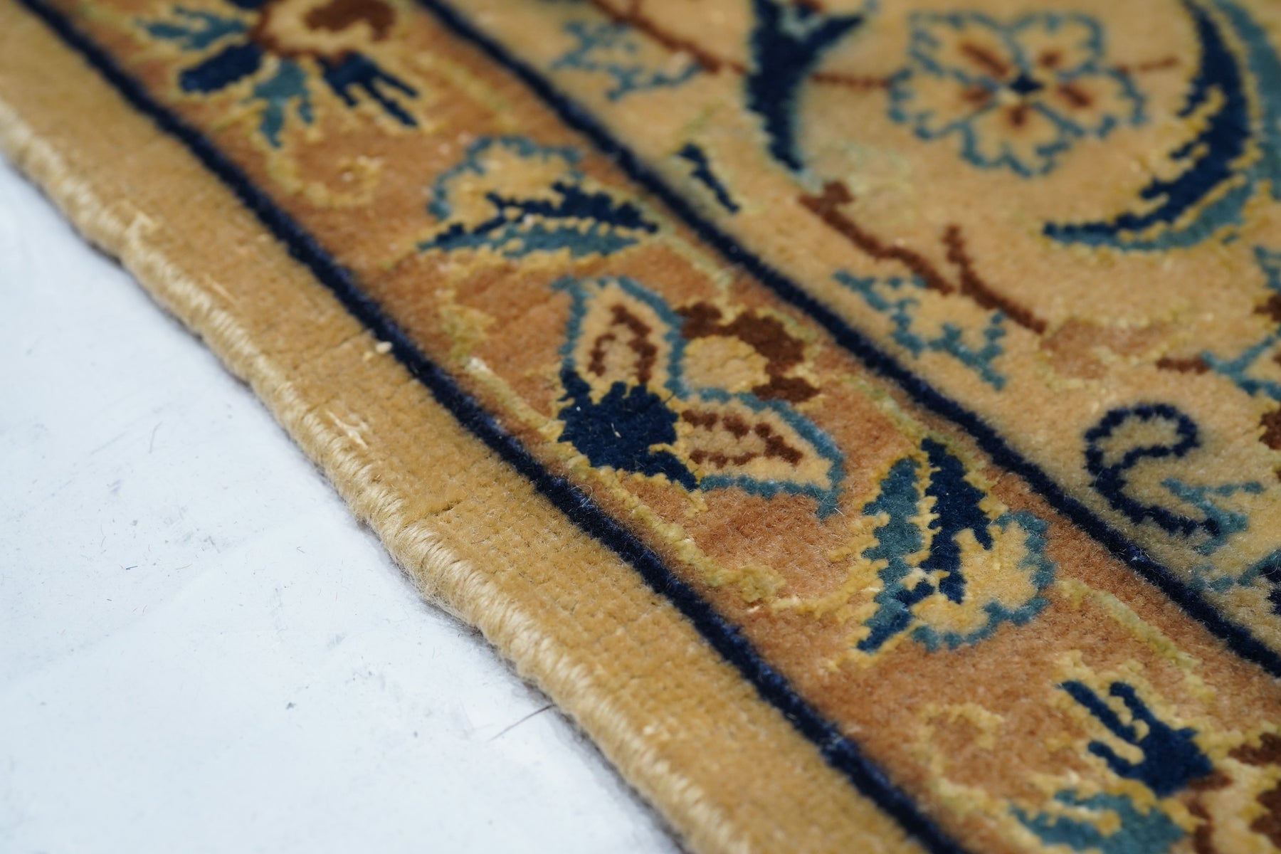 A finely knotted central Persian city scatter at a very reasonable price! The navy field centres a round straw 16-point medallion with escutcheon pendants, and a medium blue conformal sub-medallion. The palmettes and leaves of the field are kept in check by the straw corners patterned with forking arabesques. Straw border with small rosettes and equally petit petal palmettes. Vintage. Good condition.