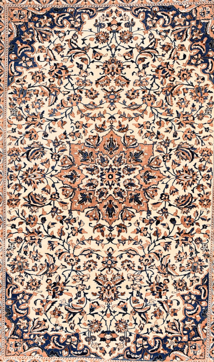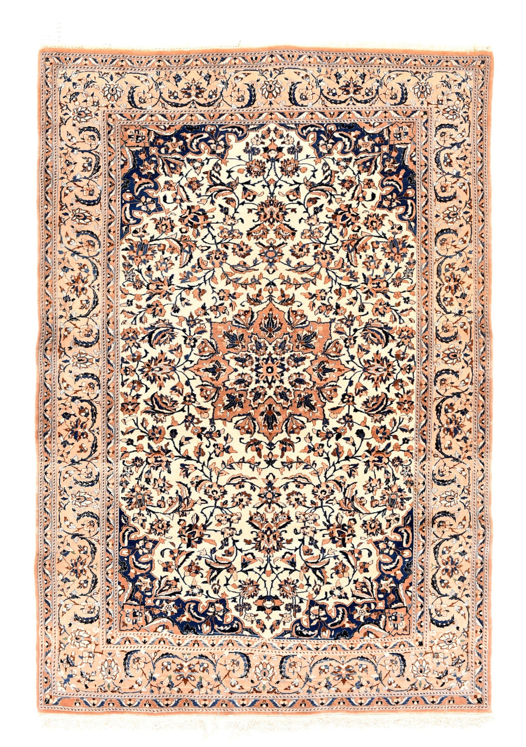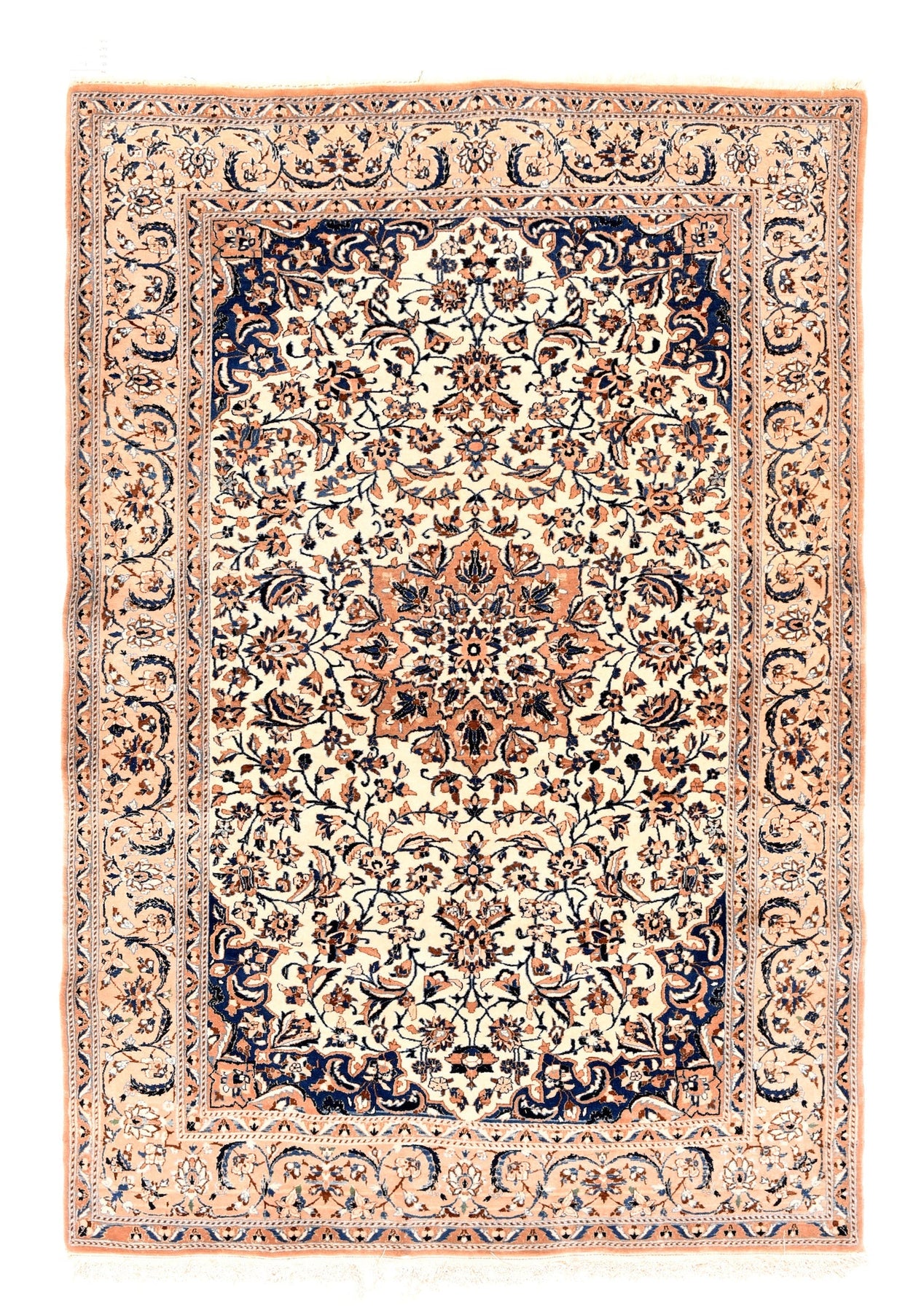 Production began in the 1930’s in the central Persian town of Nain, and this small scatter is characteristic of the very fine pieces from the 1960’s. The soft salmon-rose round octogramme medallion centres an ecru eight bud octogramme sub medallion, all on the ecru field symmetrically covered with palmettes and barbed leaves, some in a quasi-three dimensional style. Navy-black corners and putty border with many barbed leaves and smaller palmettes. Very fine weave on cotton.