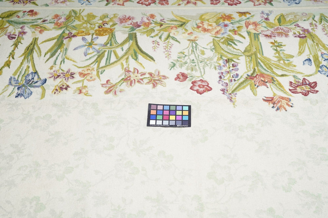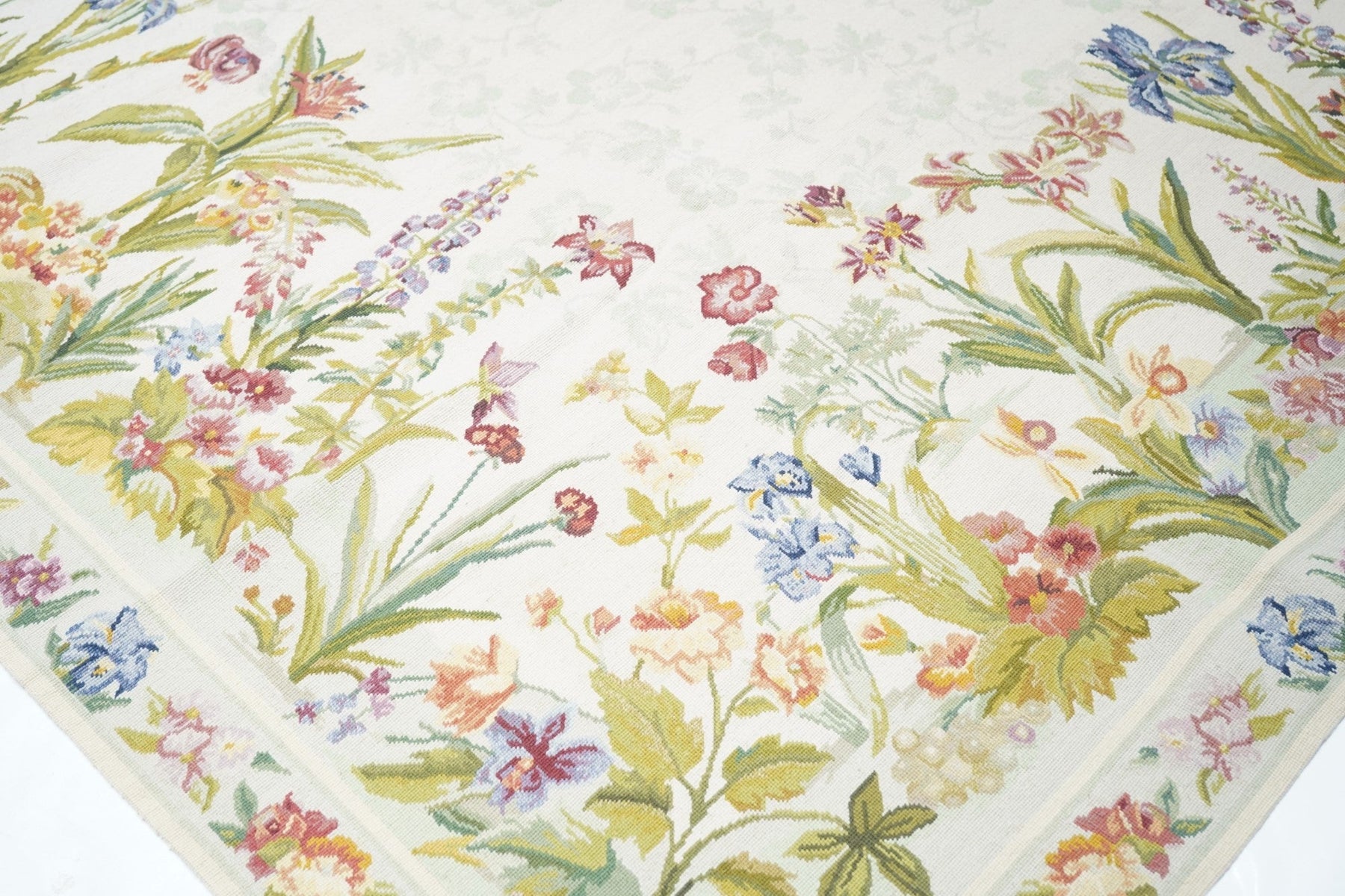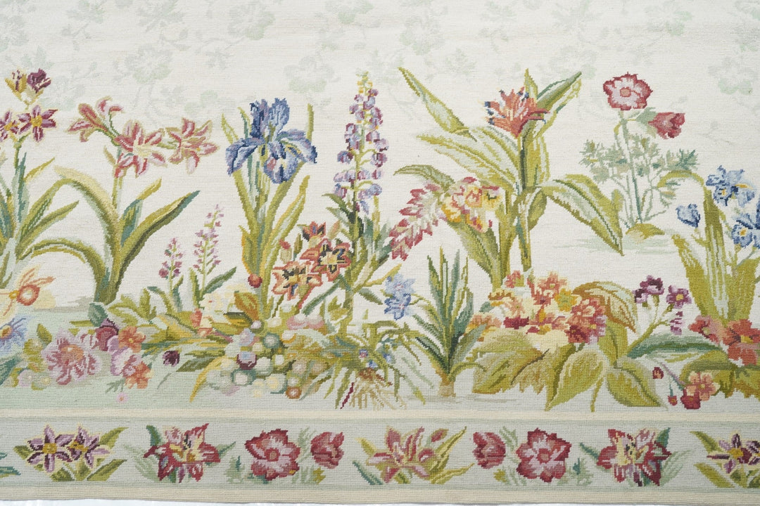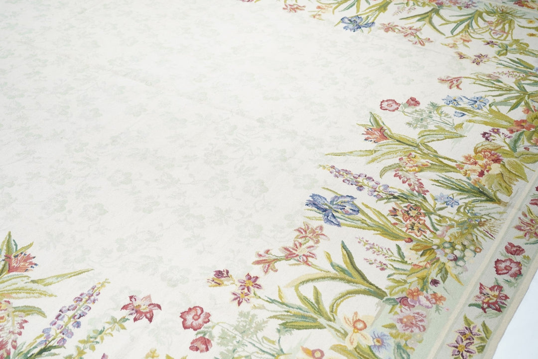 The sand field shows a shadow pattern, within an open border of inward pointing, realistically rendered. irises and other flowers. Narrow border with strewn flowers. Recent. As new condition. Wool stitchery.