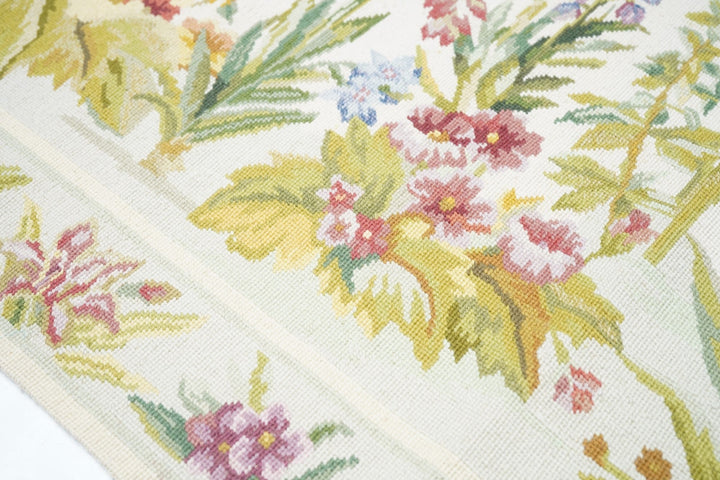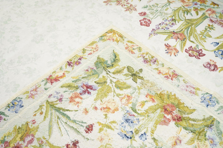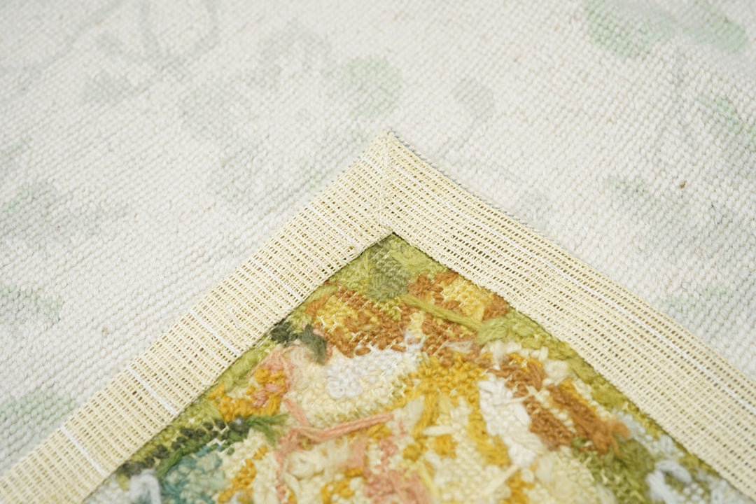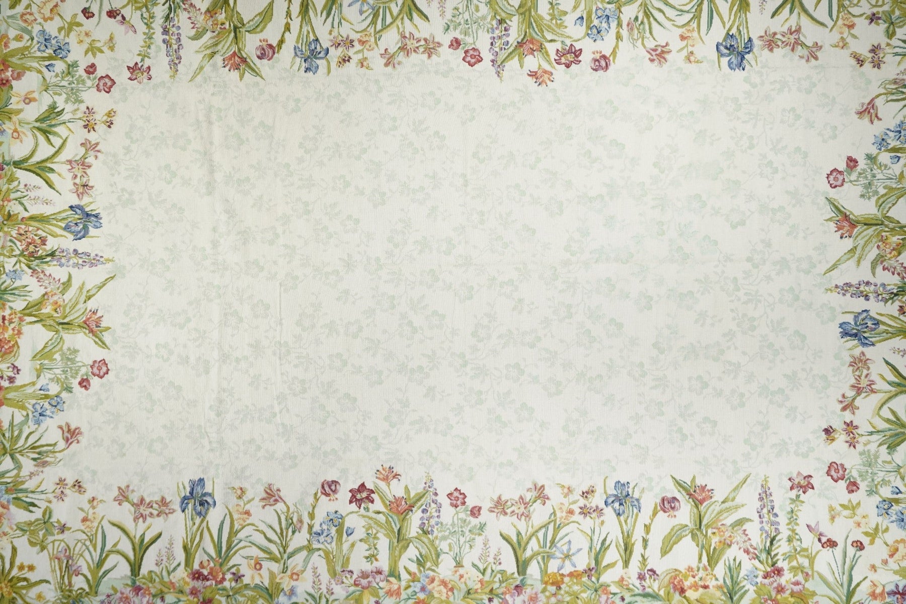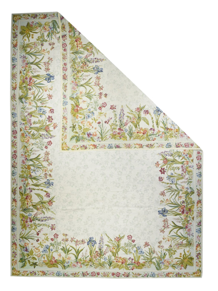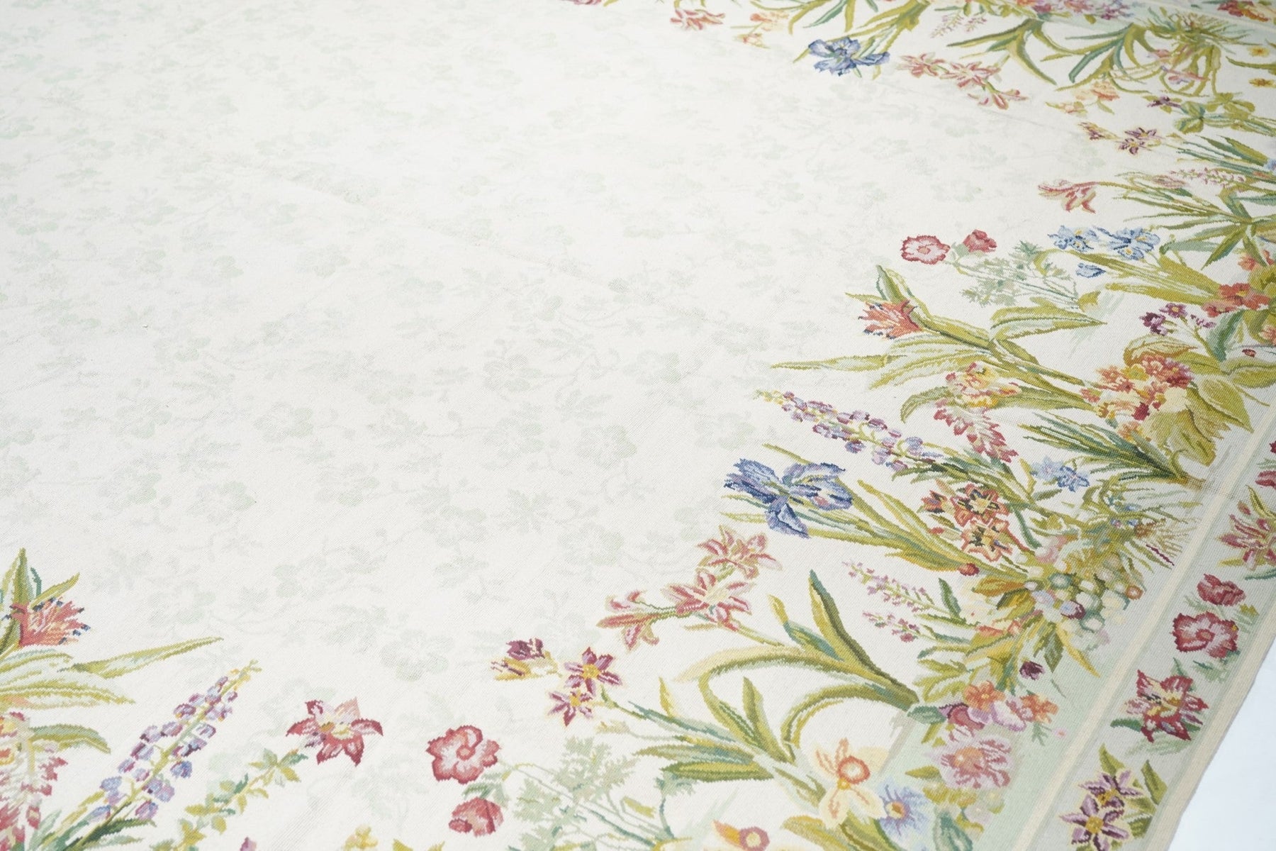 The sand field shows a shadow pattern, within an open border of inward pointing, realistically rendered. irises and other flowers. Narrow border with strewn flowers. Recent. As new condition. Wool stitchery.