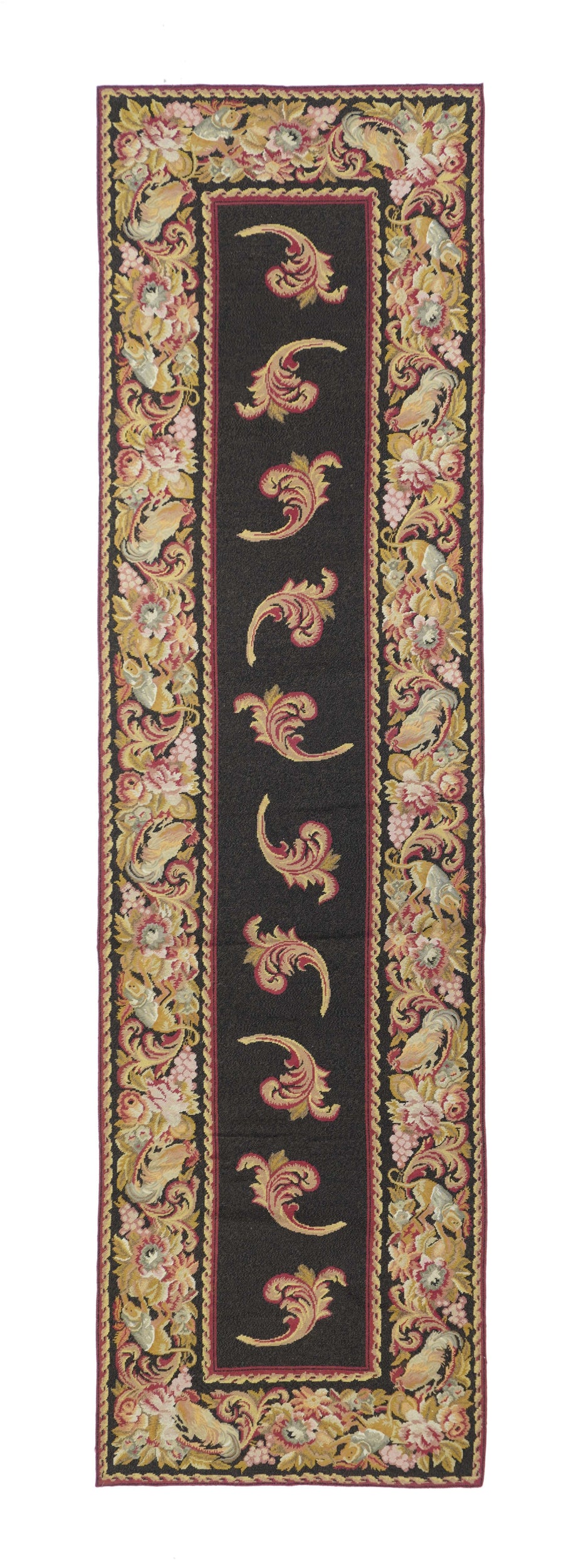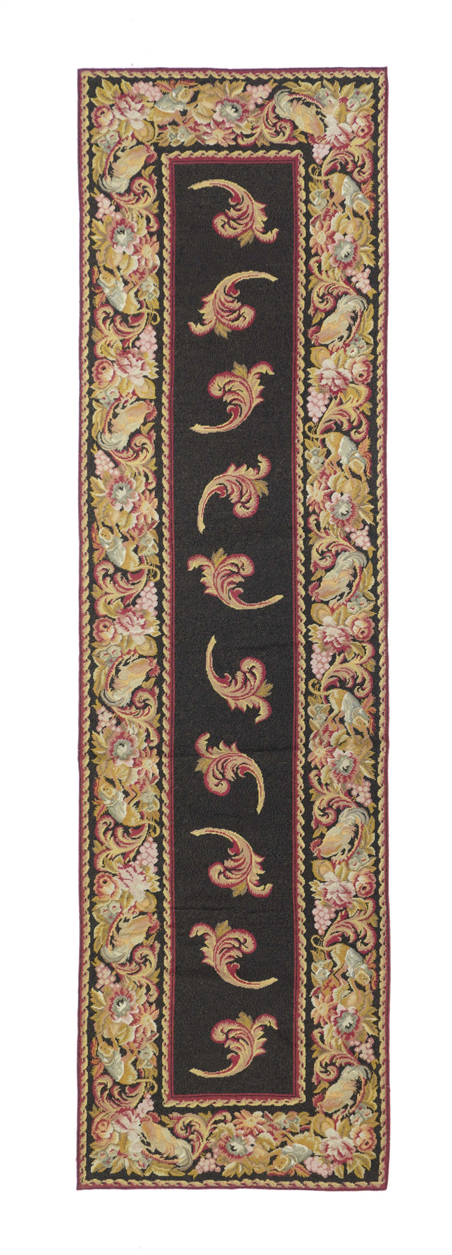 Usually English or French, often with repeating allover designs executed with wool cross-stitches. Larger carpets are workshop productions, smaller pieces have a single artisan author. Flat-weave texture, without elevated pile. Best are 19th century although recent examples are frequent. Patterns of bouquets, single flowers, domestic animals and plants. Moderate to expensive.