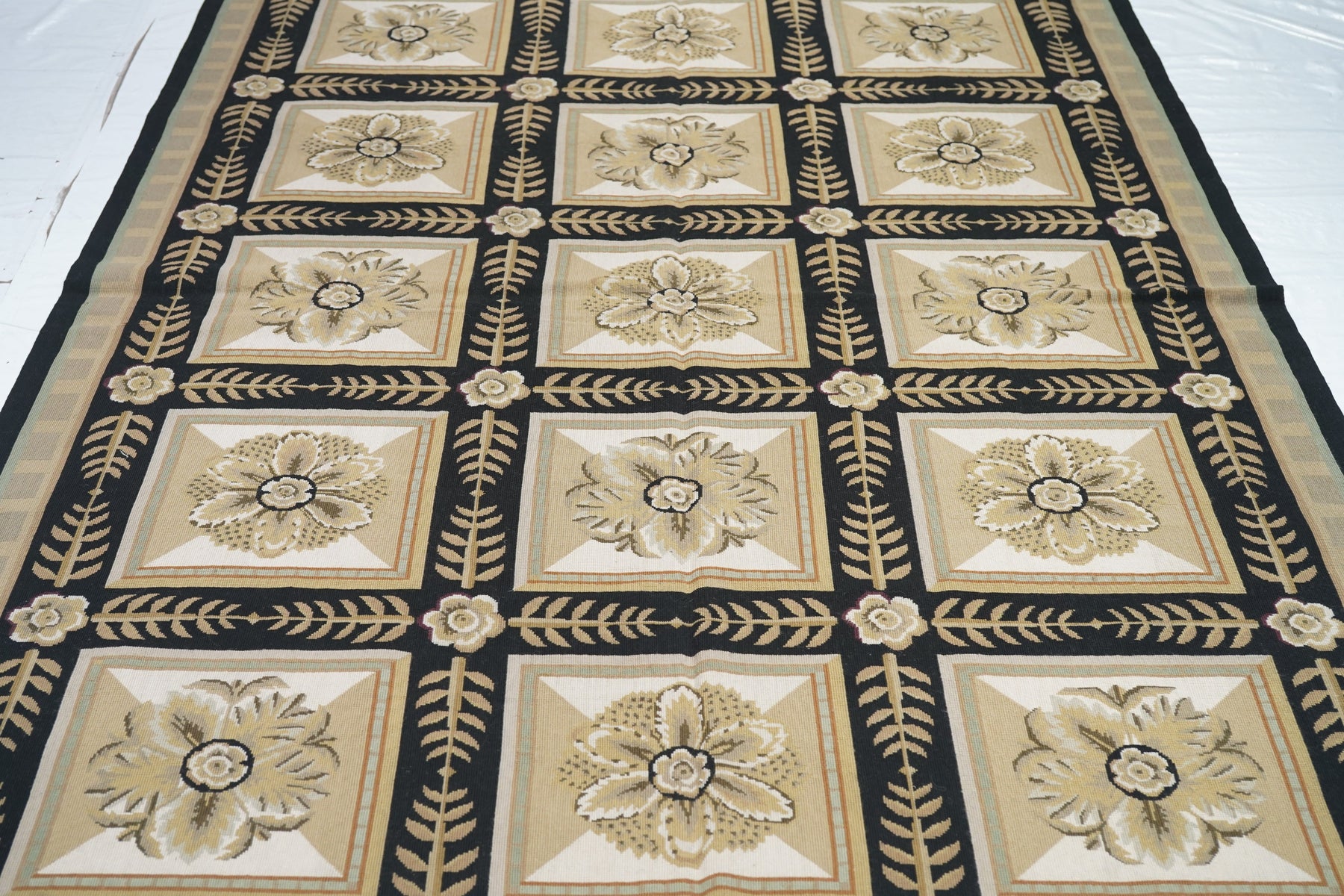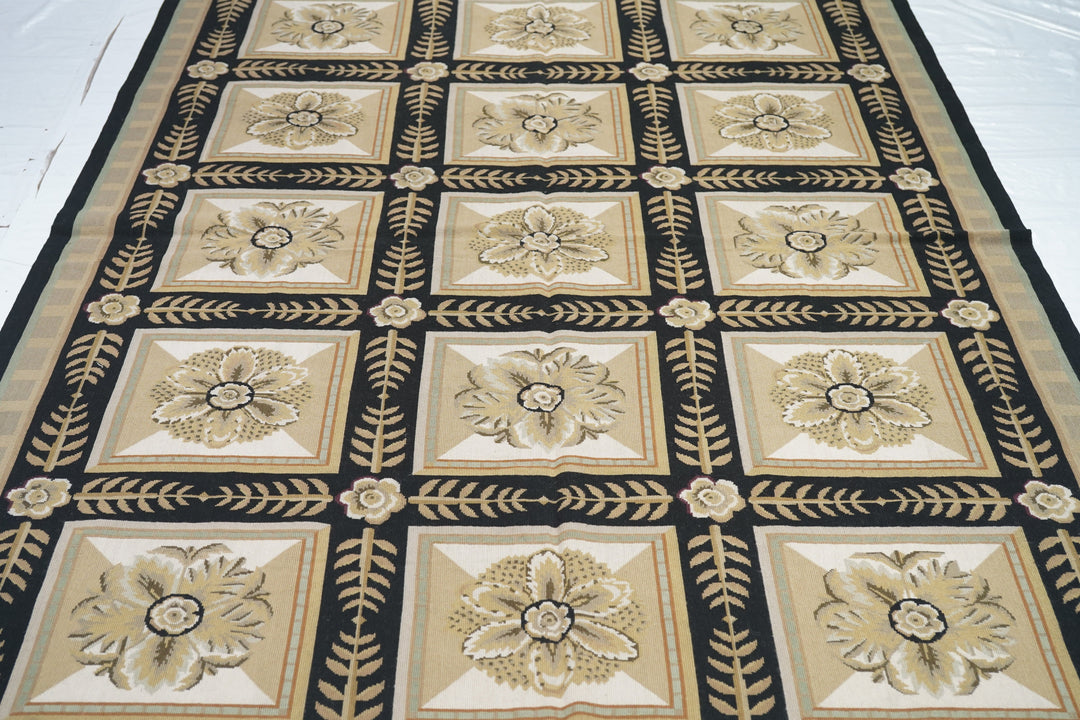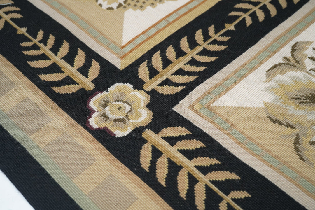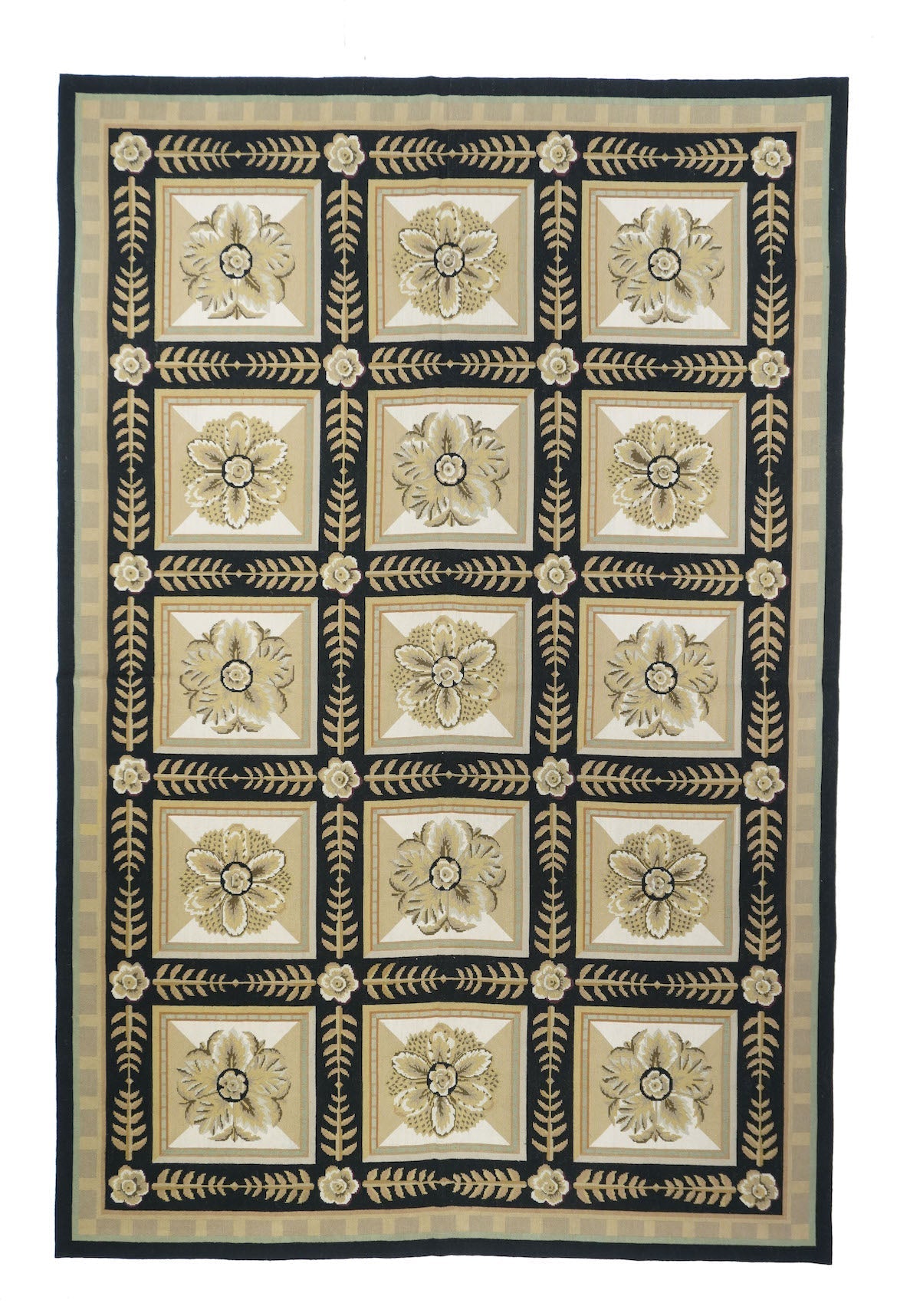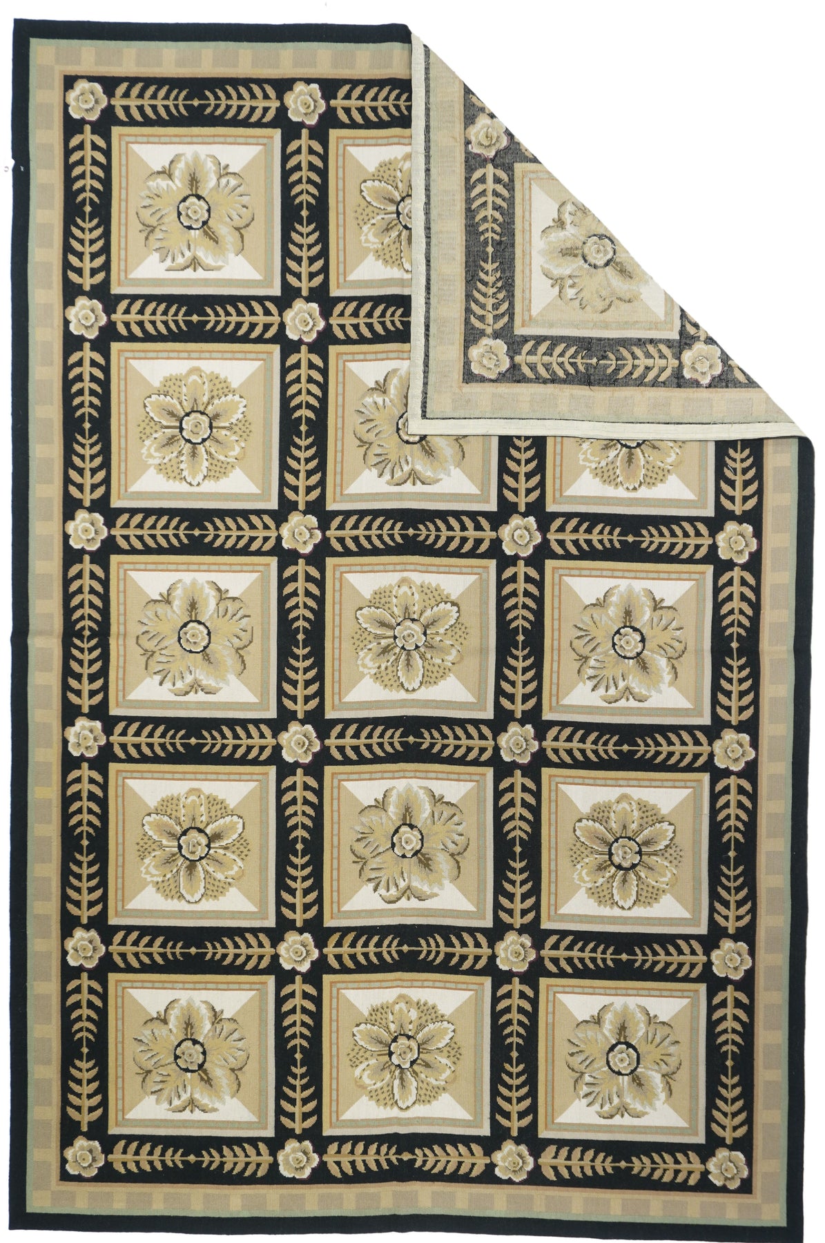 Refers generally to recent carpets in tapestry technique and inspired by French Aubusson designs of the 18th and later centuries. Geometric or semi-floral. Scatters to room sizes. Recent pieces are usually Indian. Wool pattern wefts. Inexpensive to moderate