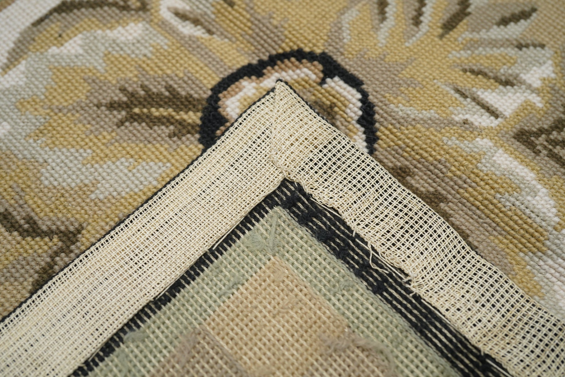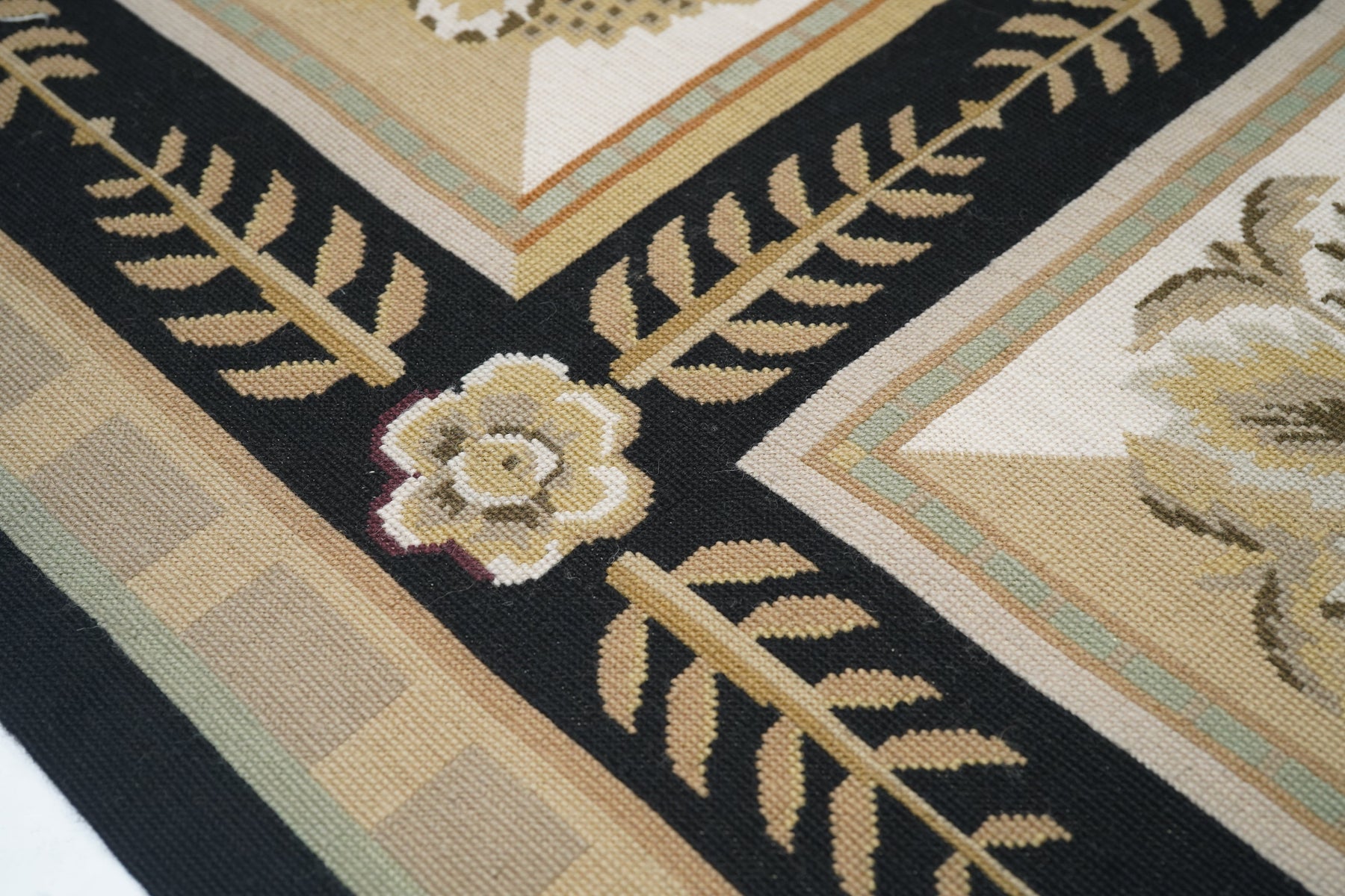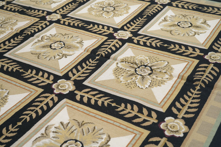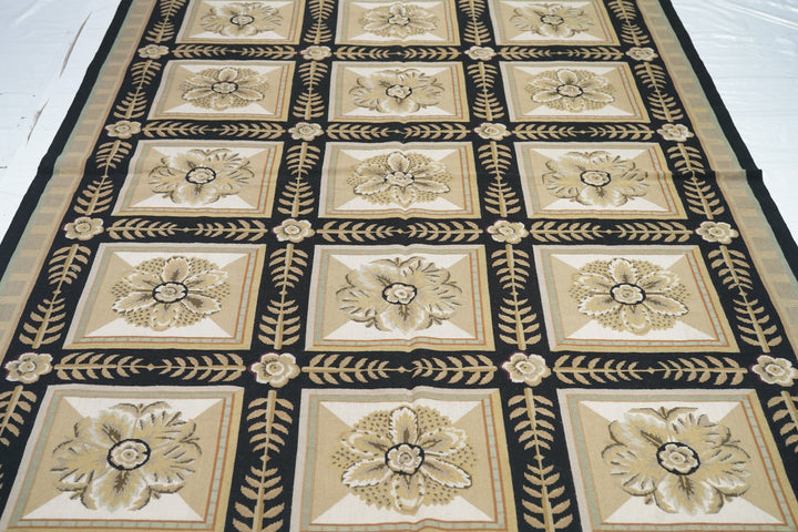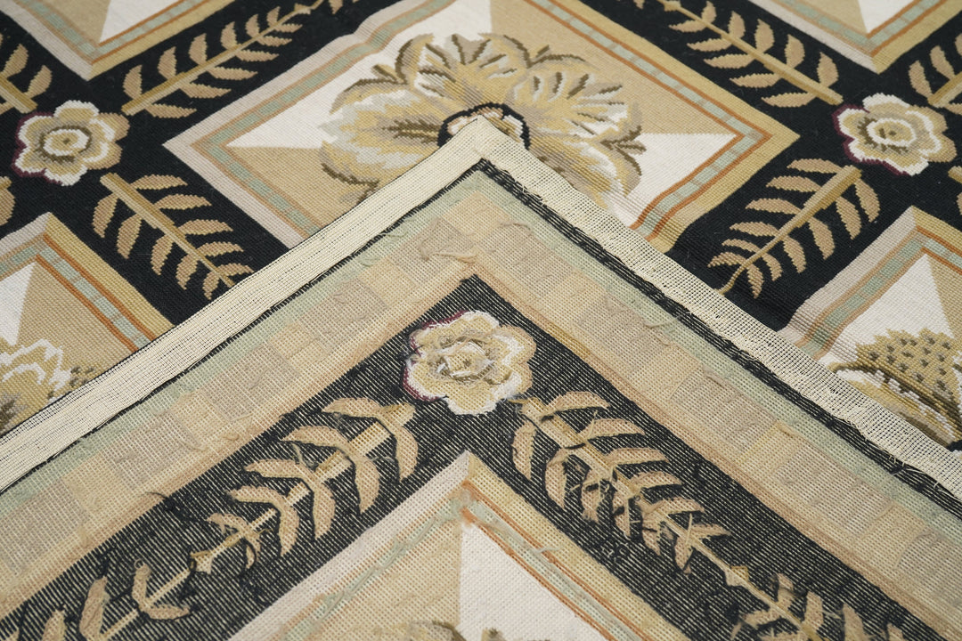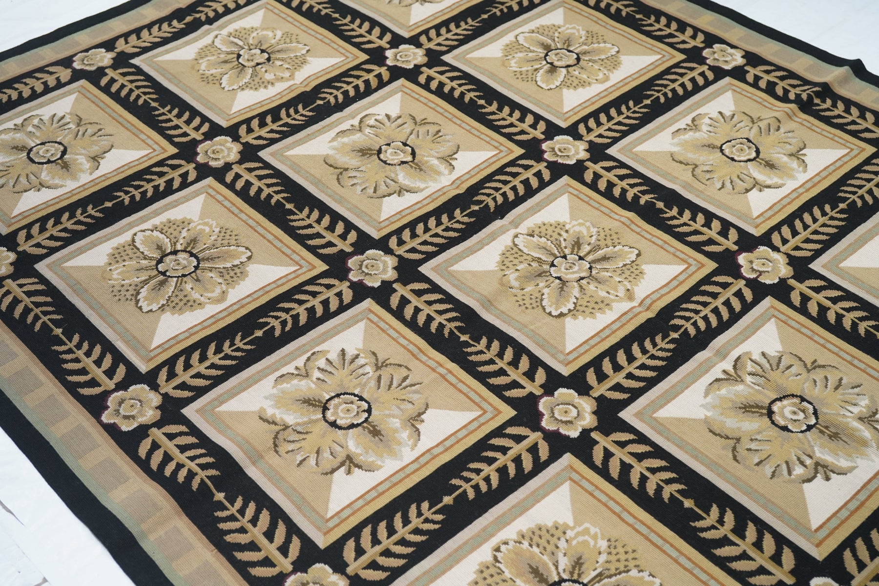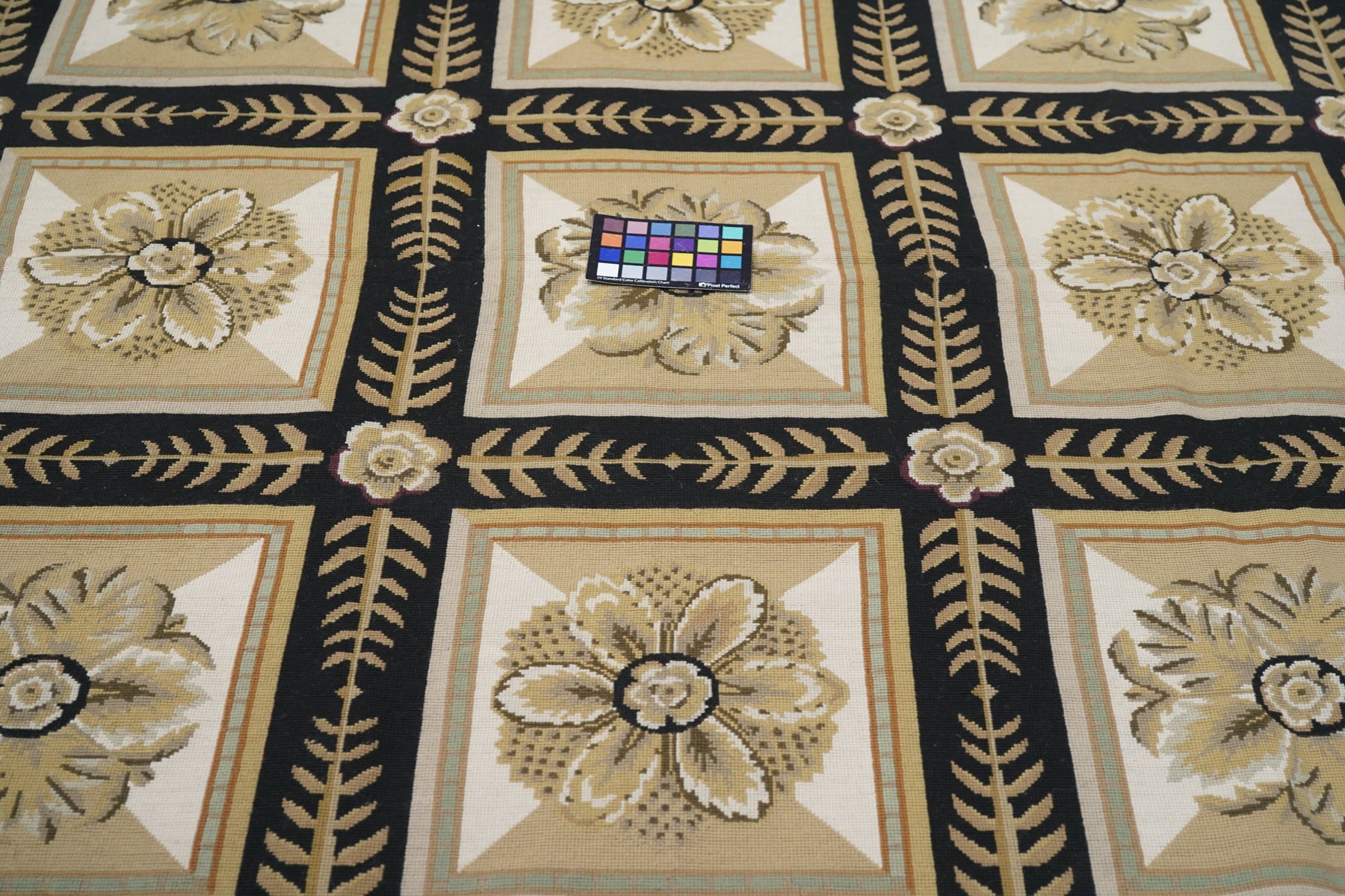Refers generally to recent carpets in tapestry technique and inspired by French Aubusson designs of the 18th and later centuries. Geometric or semi-floral. Scatters to room sizes. Recent pieces are usually Indian. Wool pattern wefts. Inexpensive to moderate