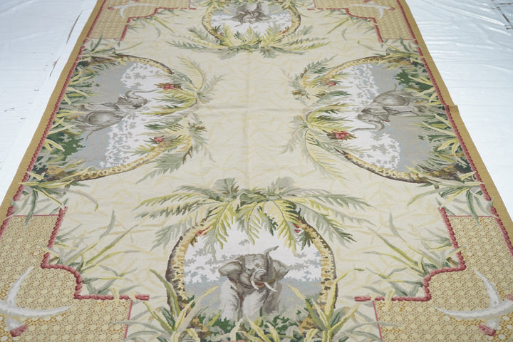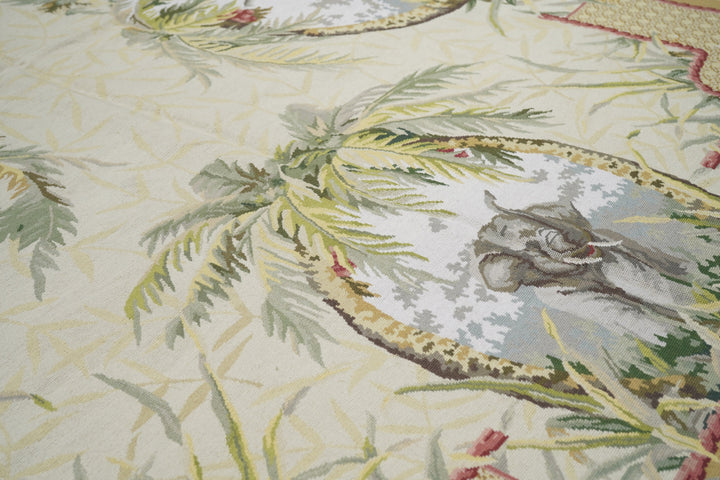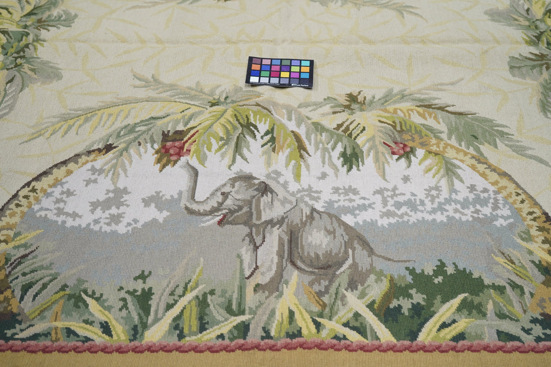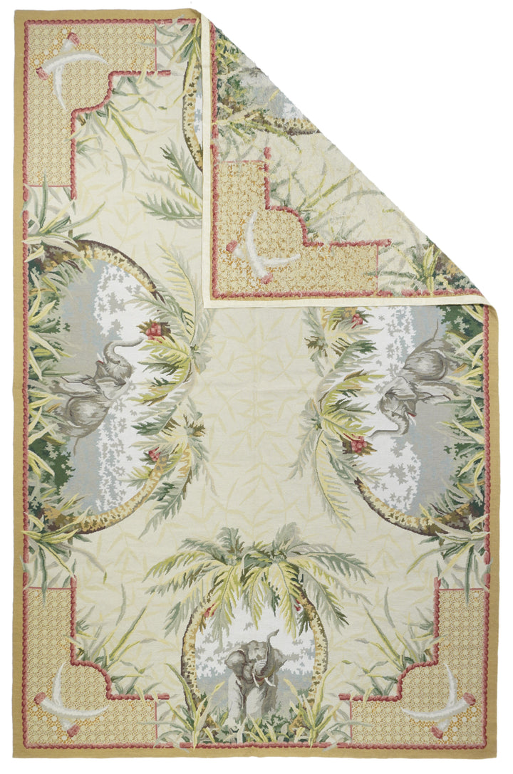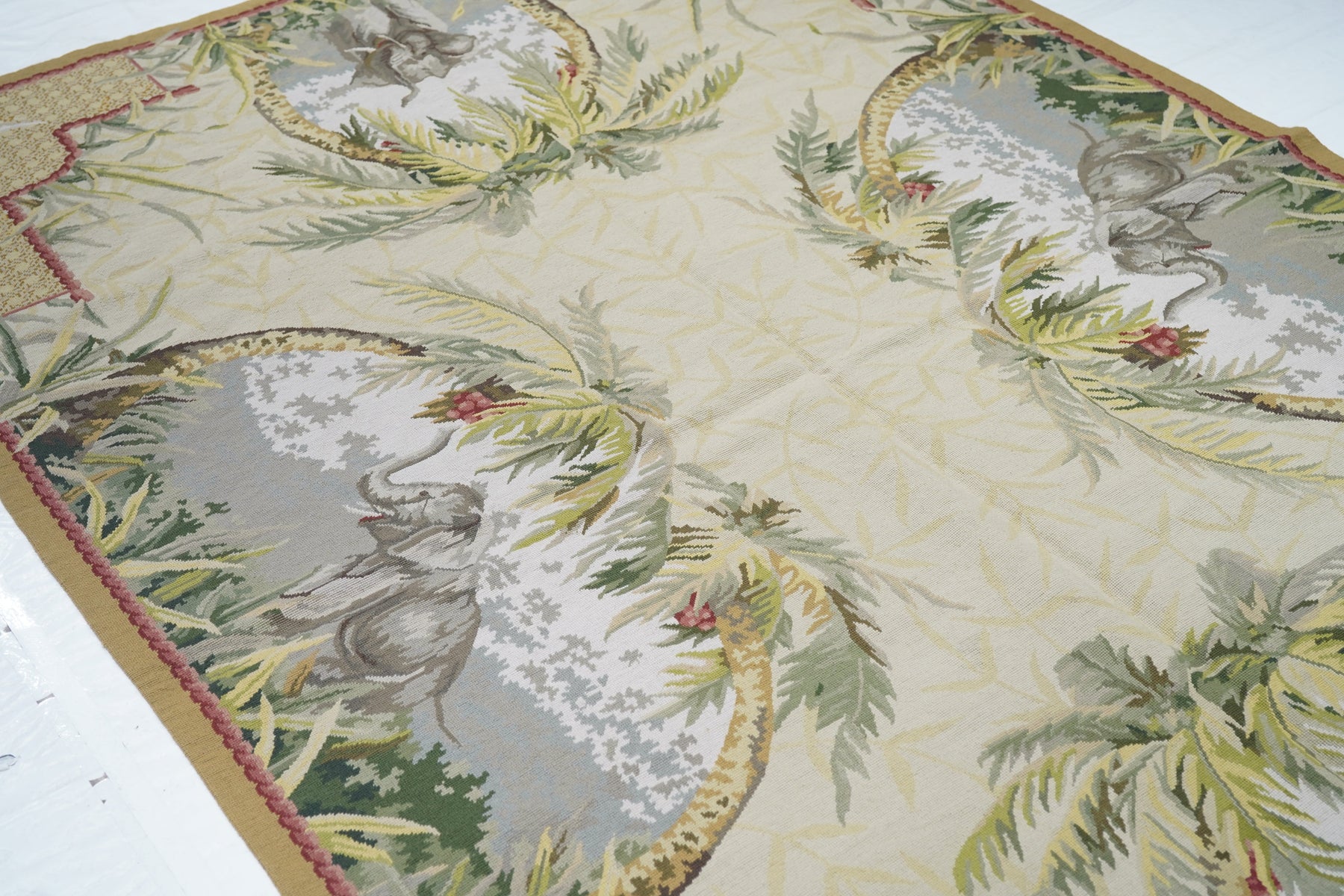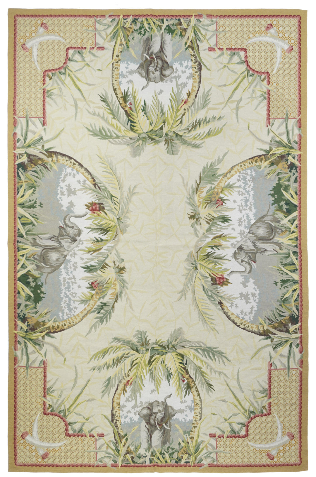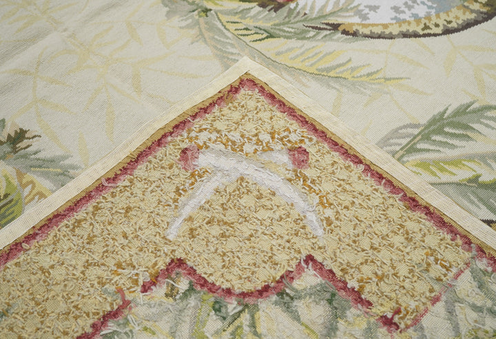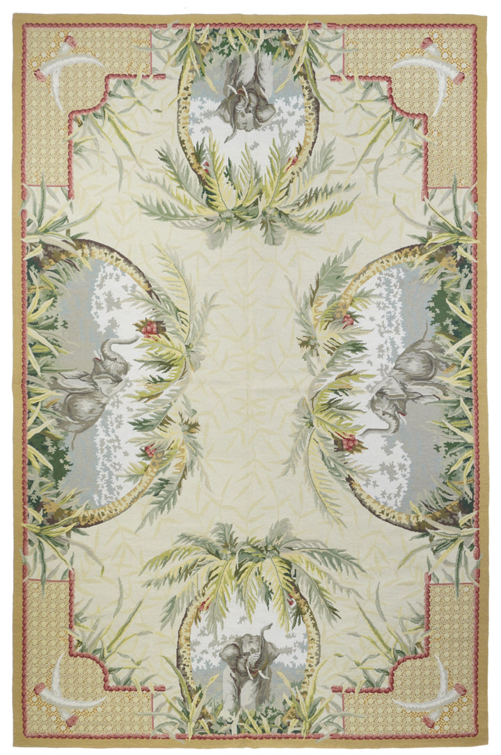 Refers generally to recent carpets in tapestry technique and inspired by French Aubusson designs of the 18th and later centuries. Geometric or semi-floral. Scatters to room sizes. Recent pieces are usually Indian. Wool pattern wefts. Inexpensive to moderate