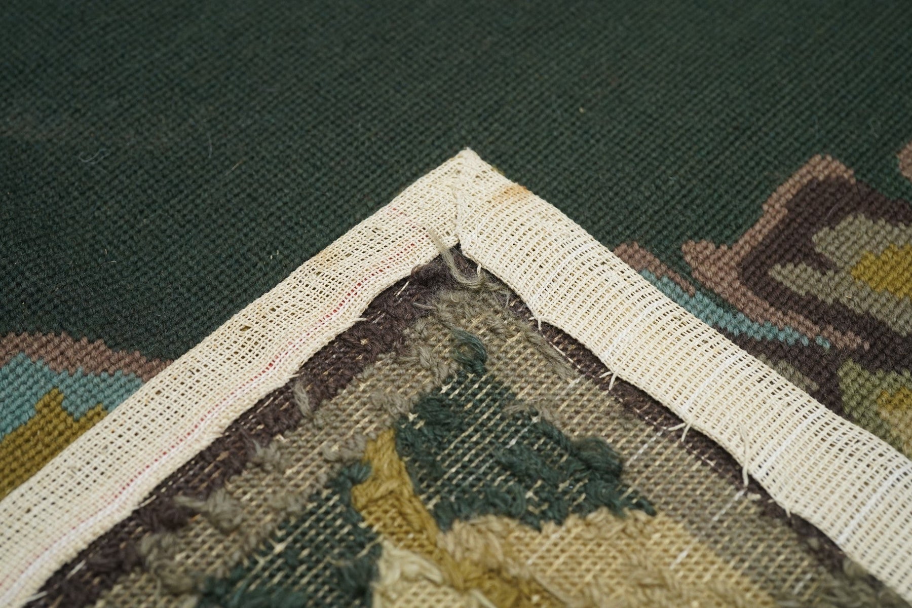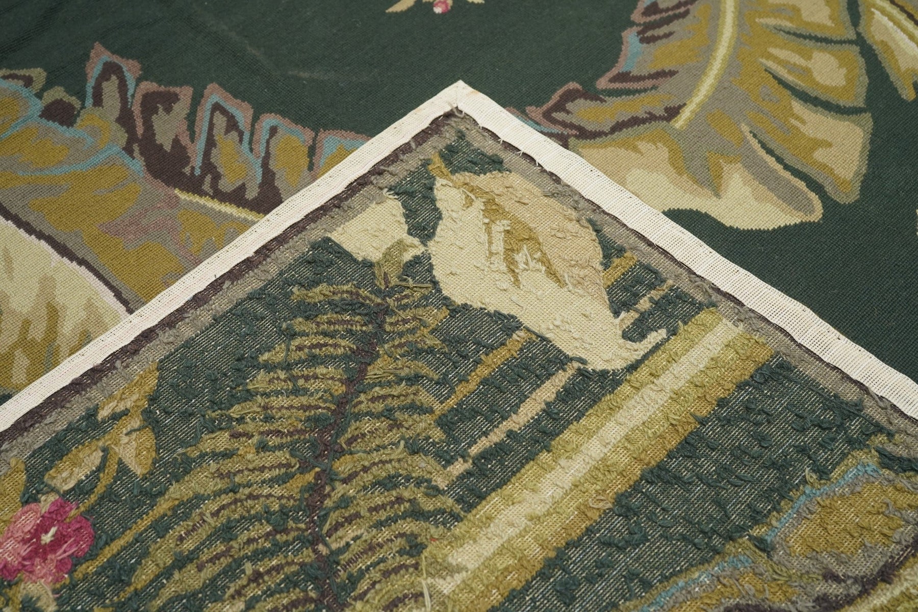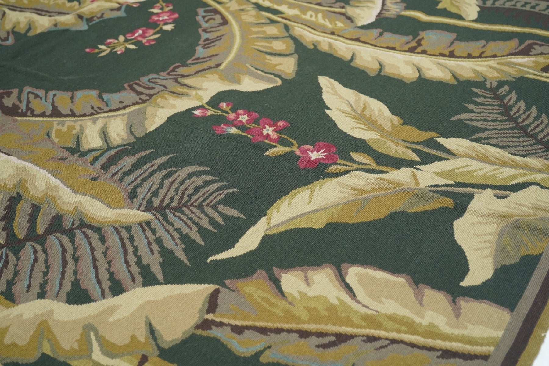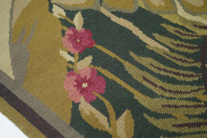 Usually English or French, often with repeating allover designs executed with wool cross-stitches. Larger carpets are workshop productions, smaller pieces have a single artisan author. Flat weave texture, without elevated pile. Best are 19th century although recent examples are frequent. Patterns of bouquets, single flowers, domestic animals and plants.