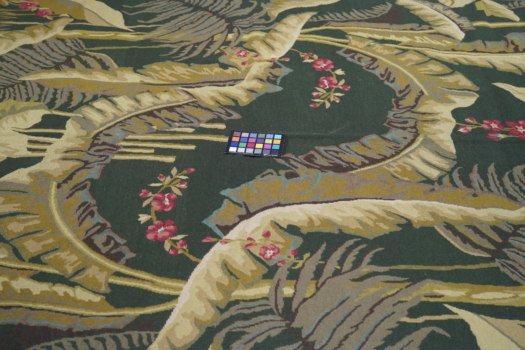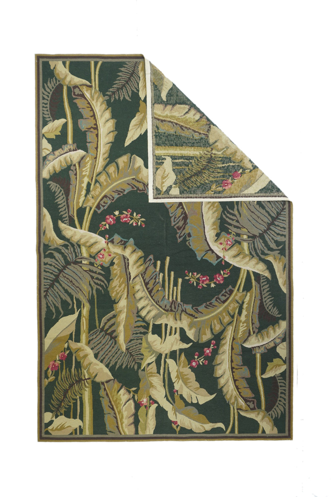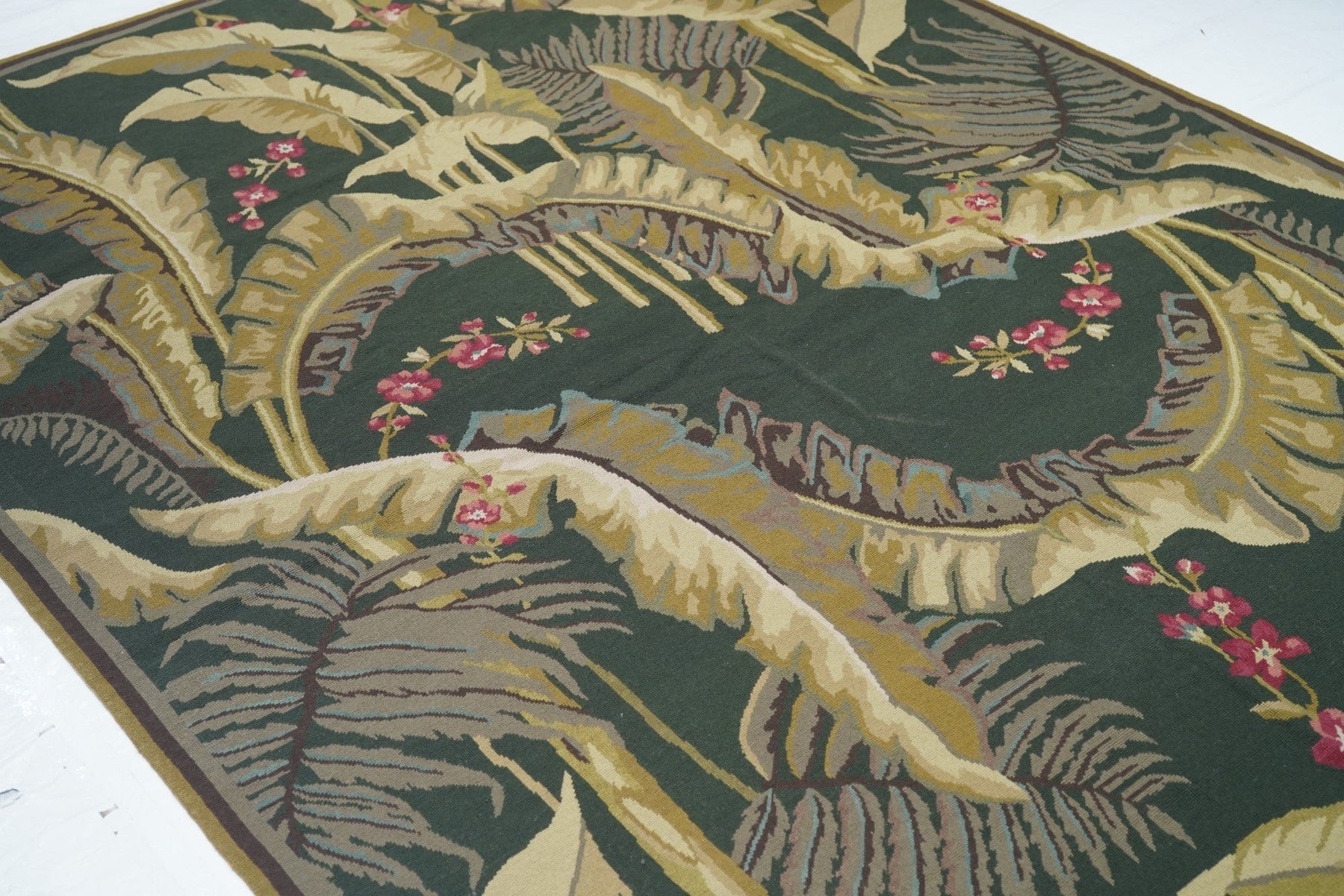 Usually English or French, often with repeating allover designs executed with wool cross-stitches. Larger carpets are workshop productions, smaller pieces have a single artisan author. Flat weave texture, without elevated pile. Best are 19th century although recent examples are frequent. Patterns of bouquets, single flowers, domestic animals and plants.