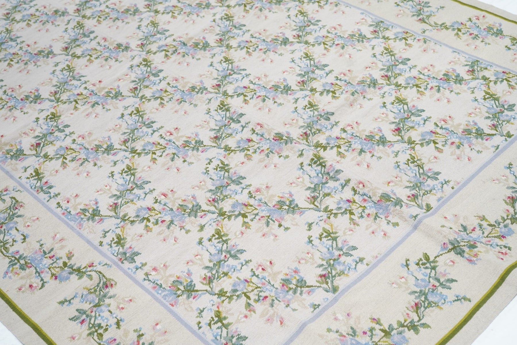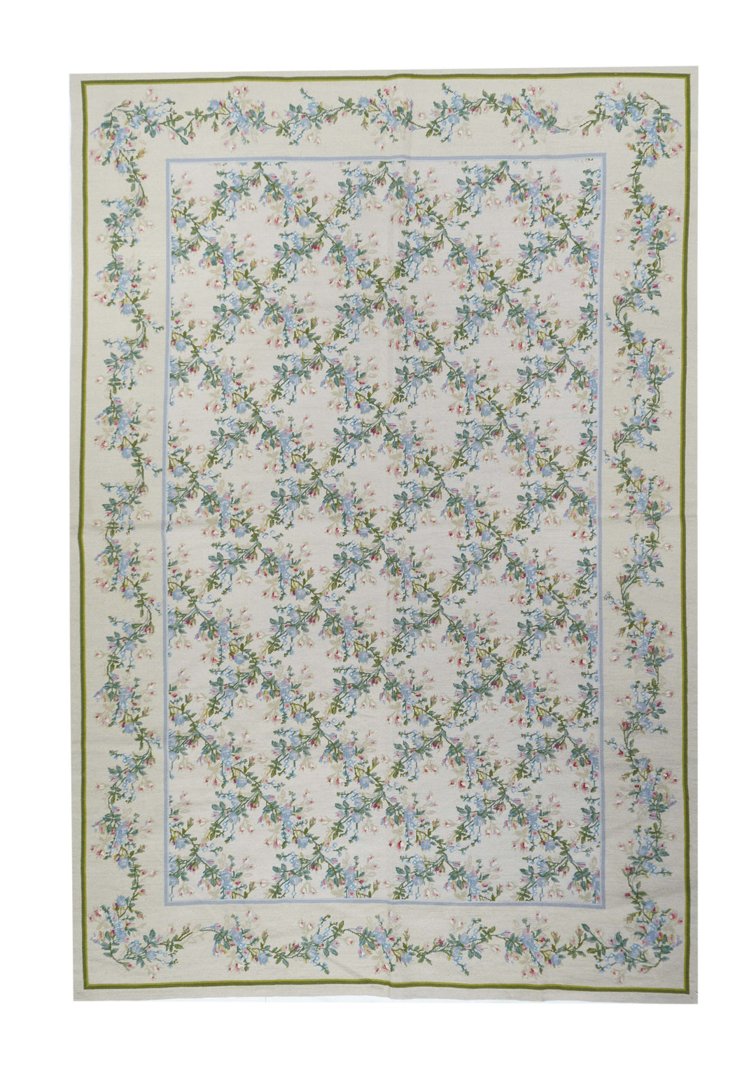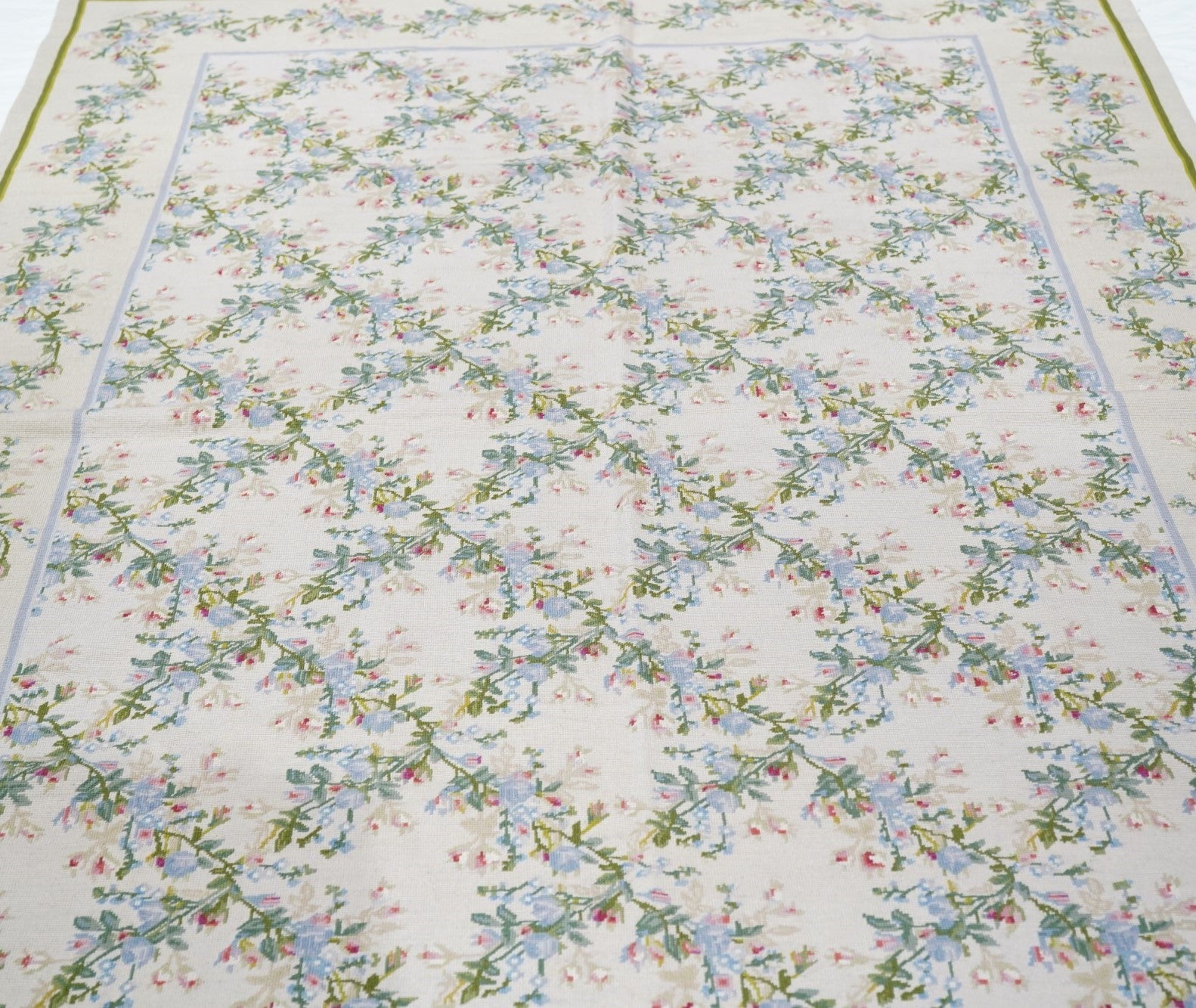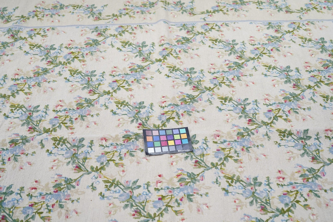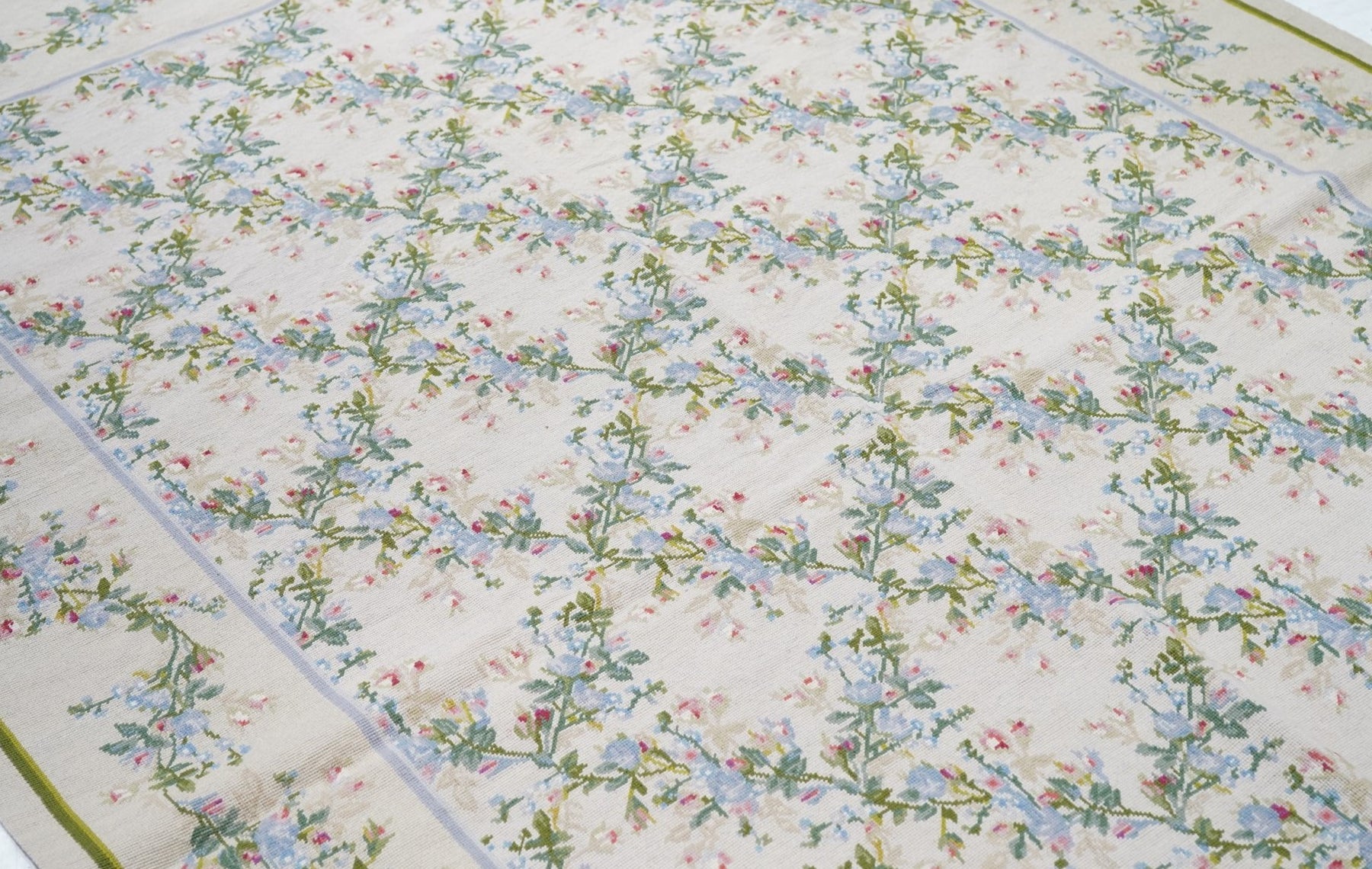 Usually English or French, often with repeating allover designs executed with wool cross-stitches. Larger carpets are workshop productions, smaller pieces have a single artisan author. Flat weave texture, without elevated pile. Best are 19th century although recent examples are frequent. Patterns of bouquets, single flowers, domestic animals and plants.