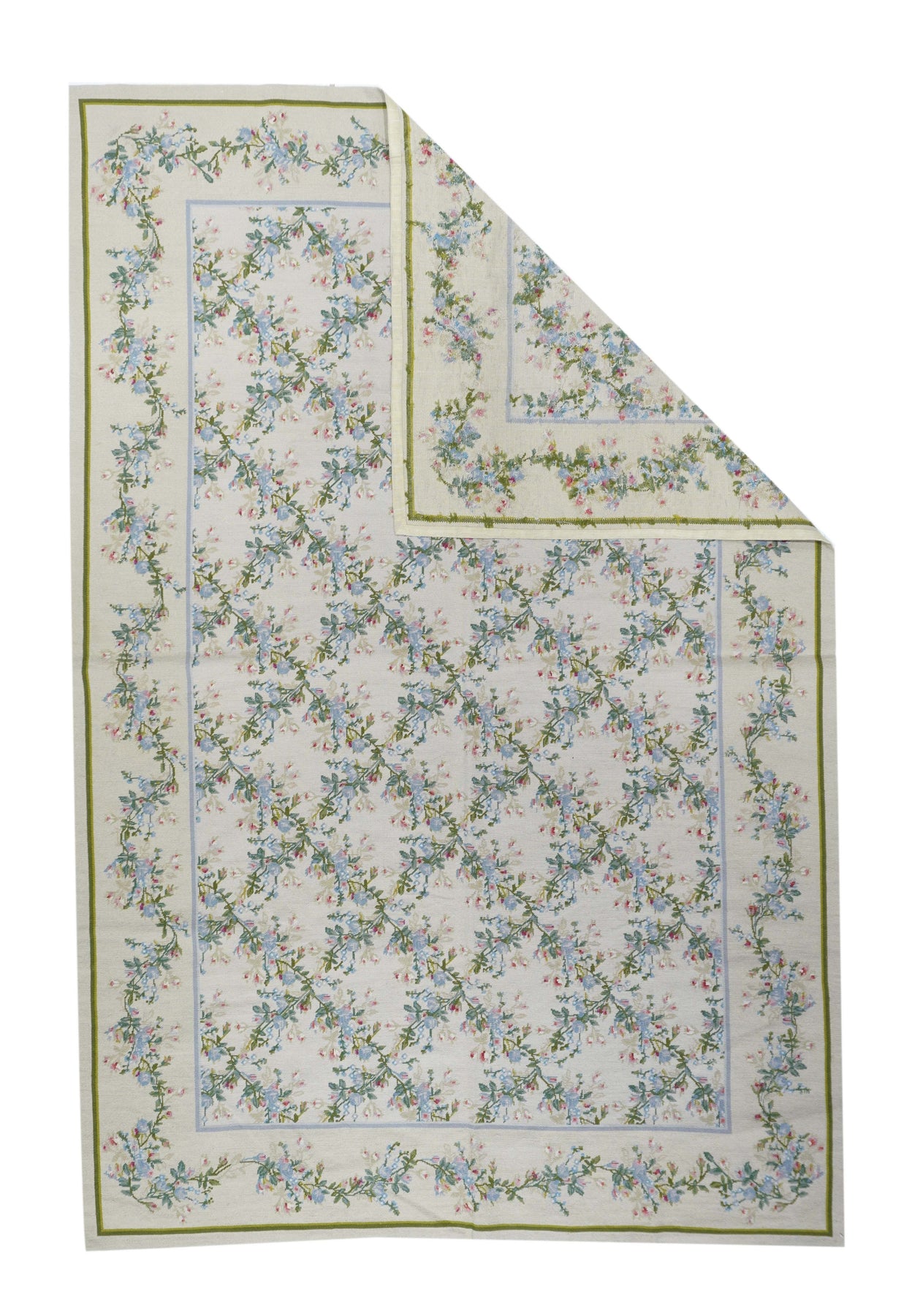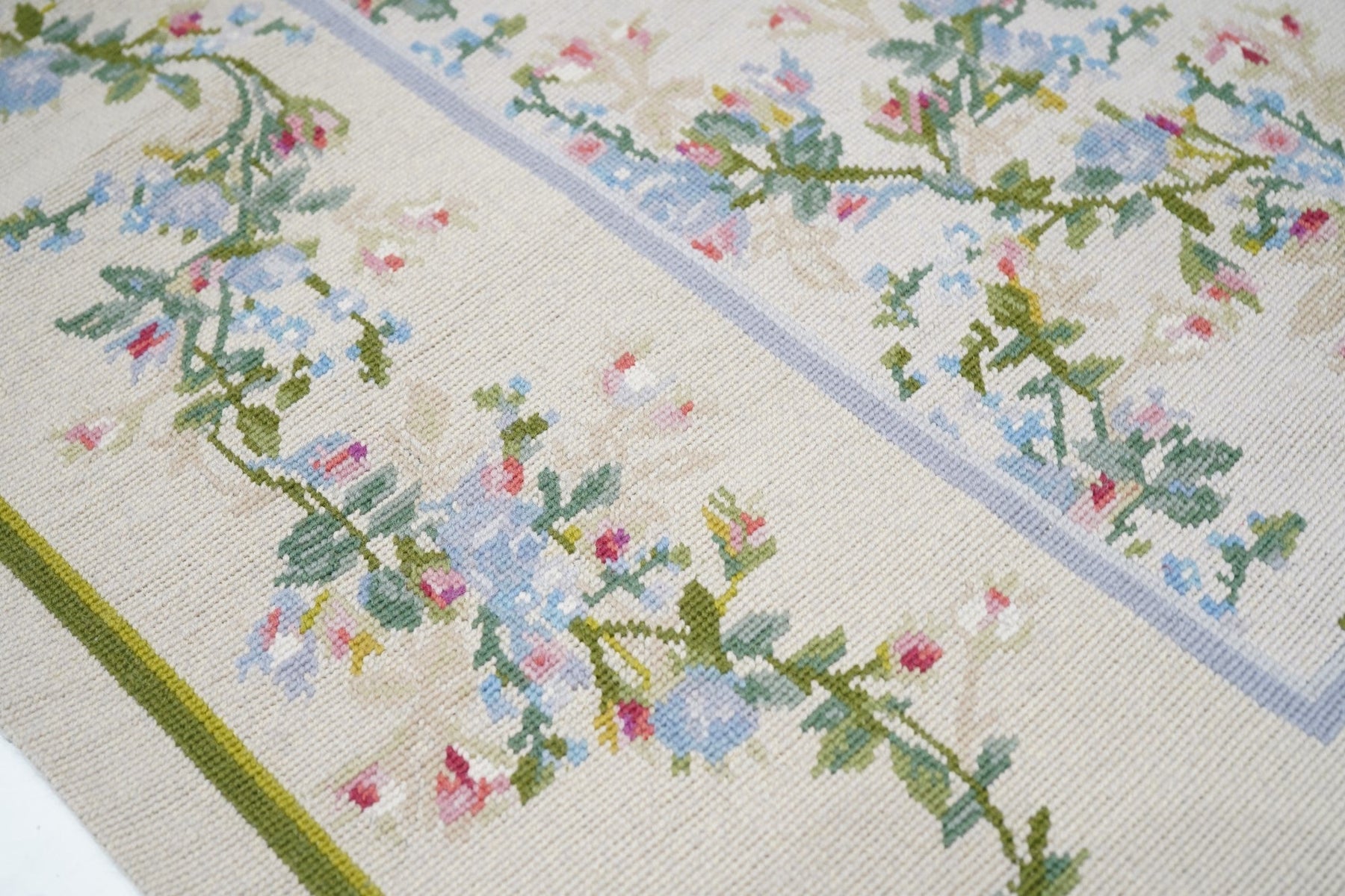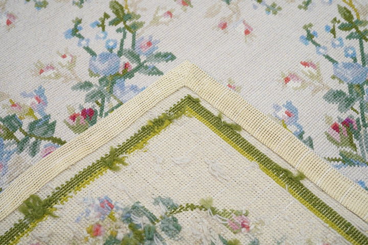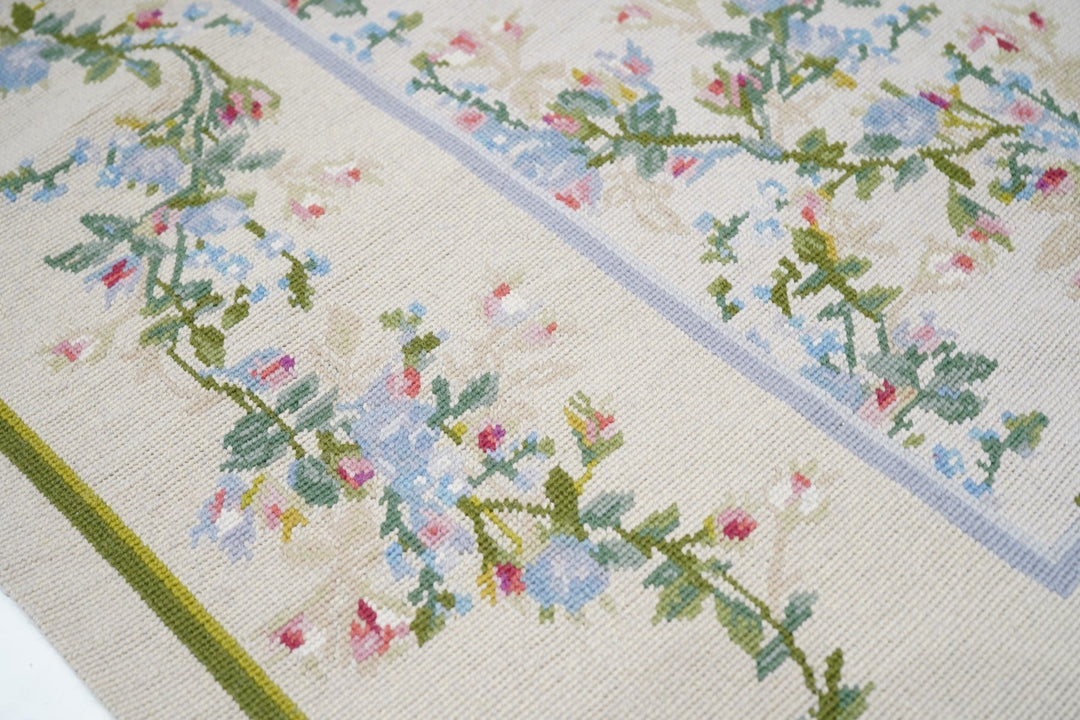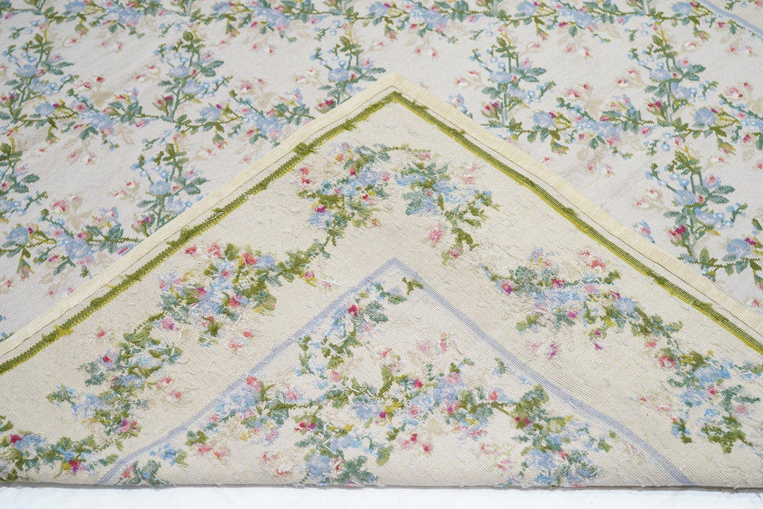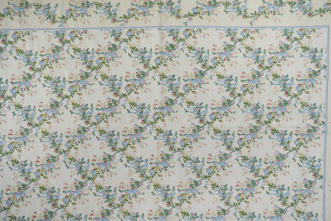 Usually English or French, often with repeating allover designs executed with wool cross-stitches. Larger carpets are workshop productions, smaller pieces have a single artisan author. Flat weave texture, without elevated pile. Best are 19th century although recent examples are frequent. Patterns of bouquets, single flowers, domestic animals and plants.