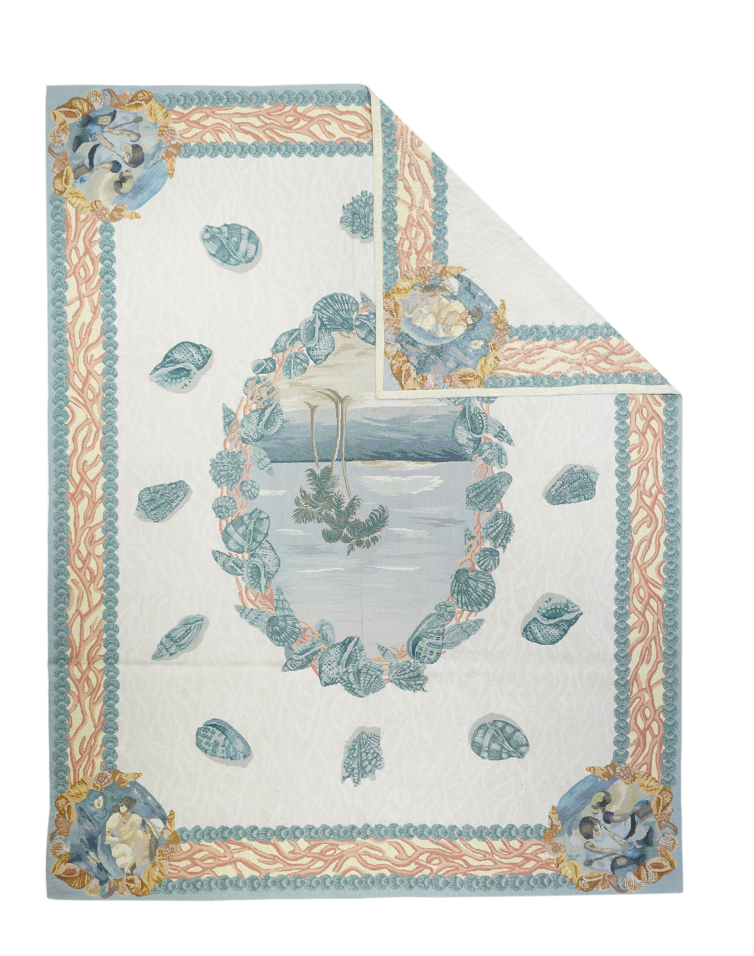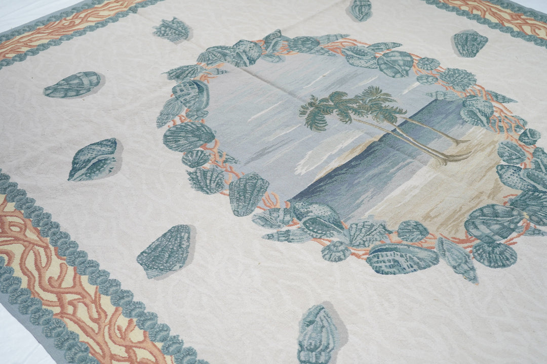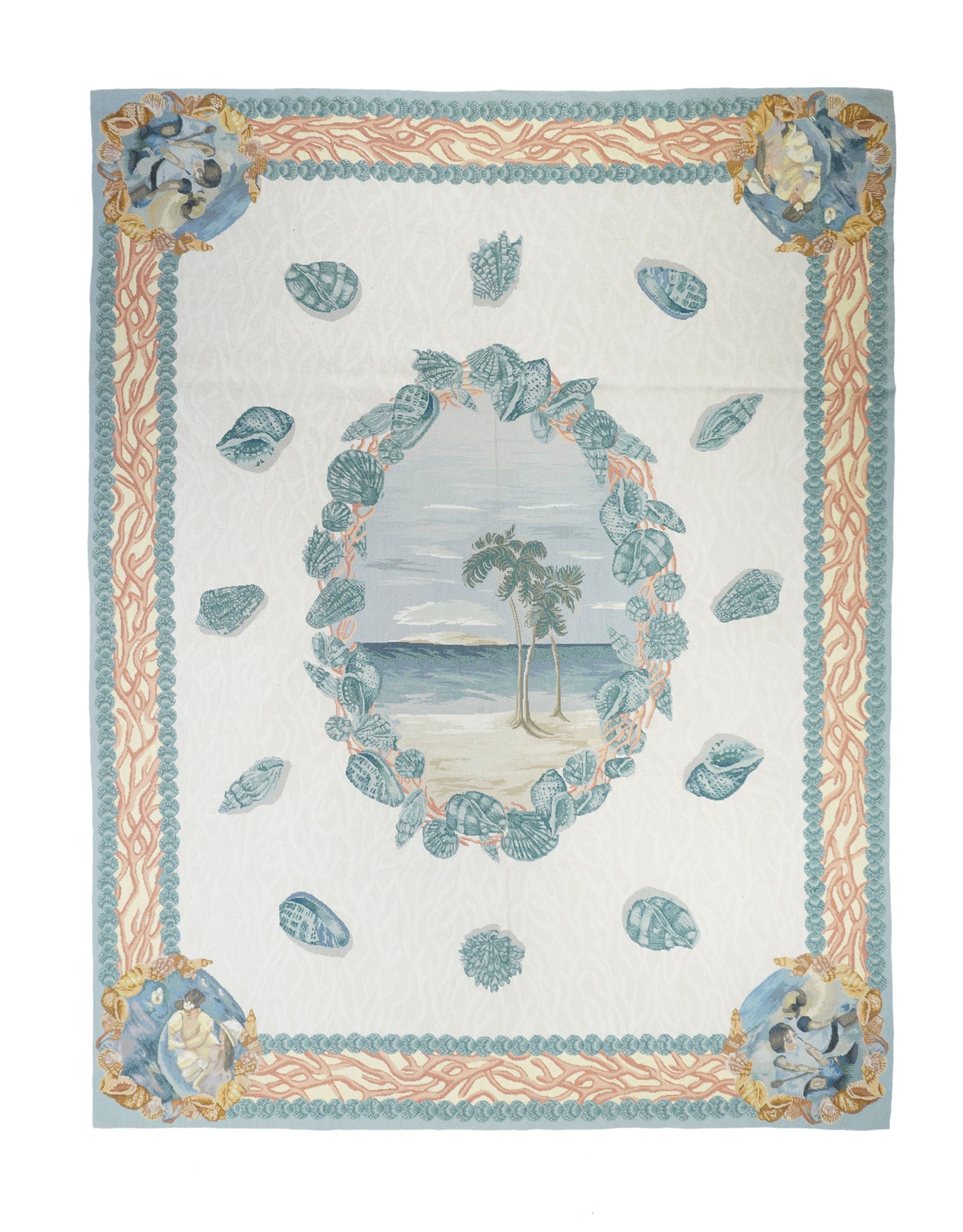 Refers generally to recent carpets in tapestry technique and inspired by French Aubusson designs of the 18th and later centuries.Geometric or semi-floral. Scatters to room sizes. Recent pieces are usually Indian. Wool pattern wefts. Inexpensive to moderate.