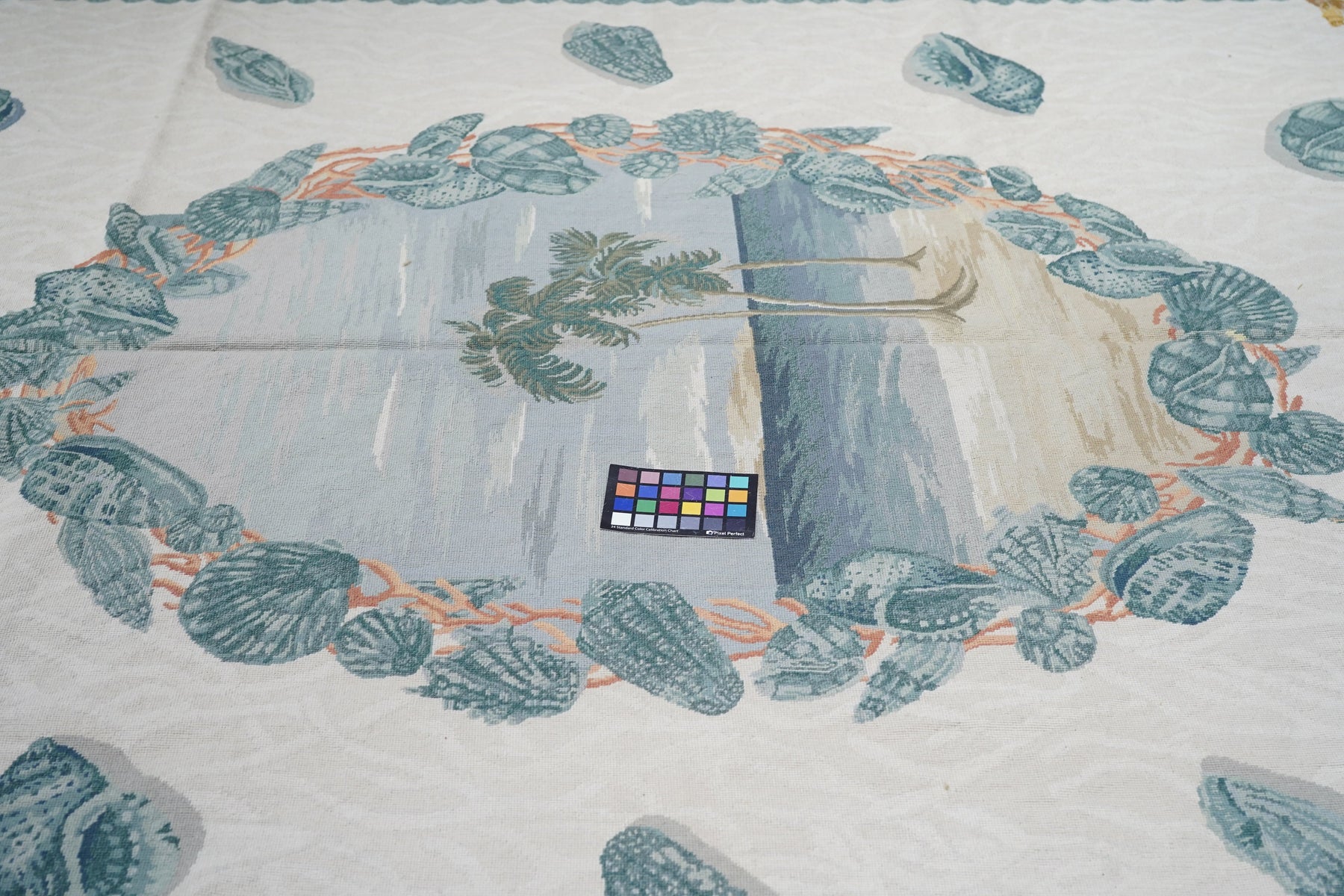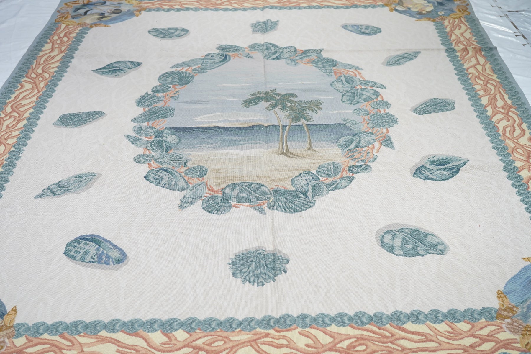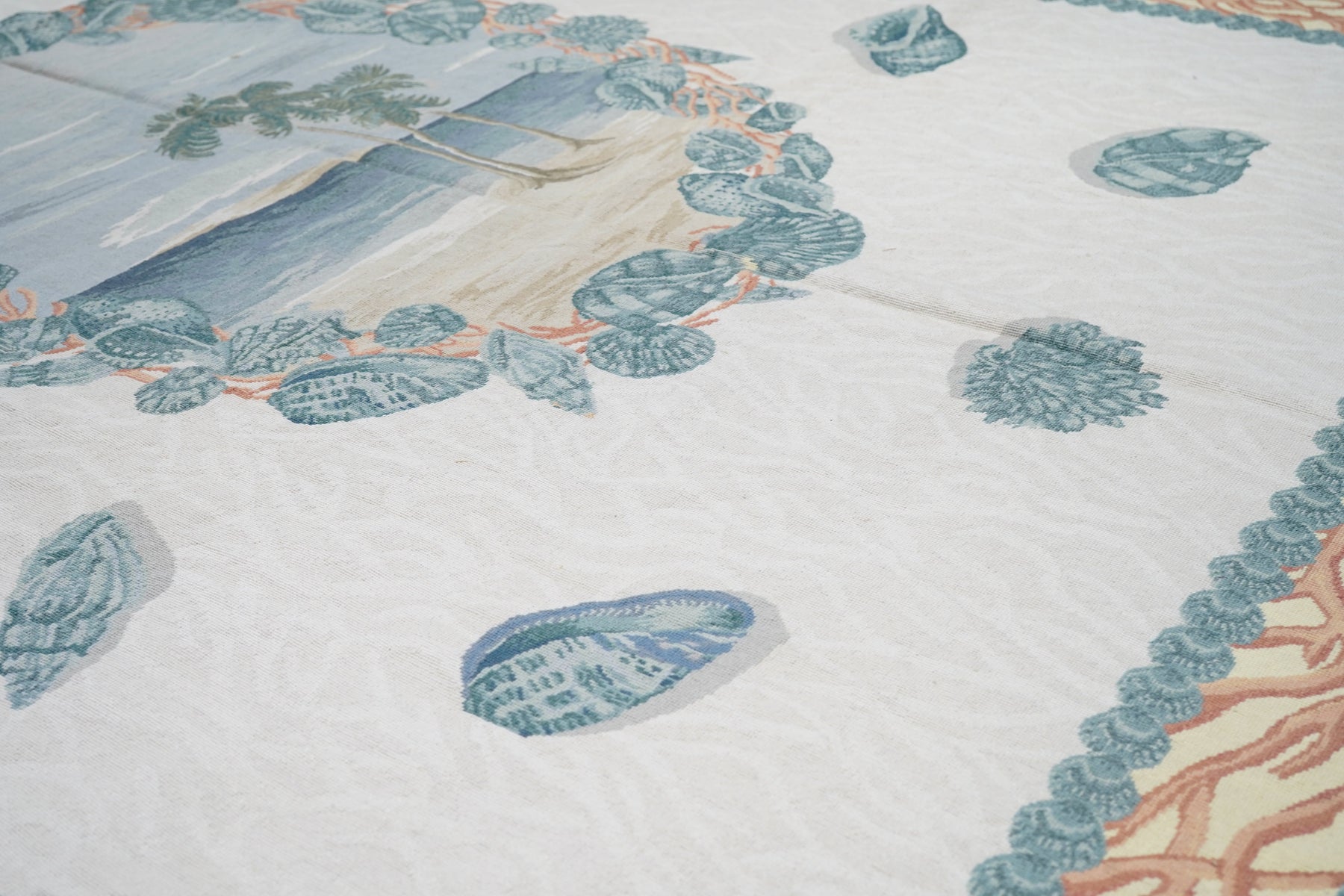 Refers generally to recent carpets in tapestry technique and inspired by French Aubusson designs of the 18th and later centuries.Geometric or semi-floral. Scatters to room sizes. Recent pieces are usually Indian. Wool pattern wefts. Inexpensive to moderate.