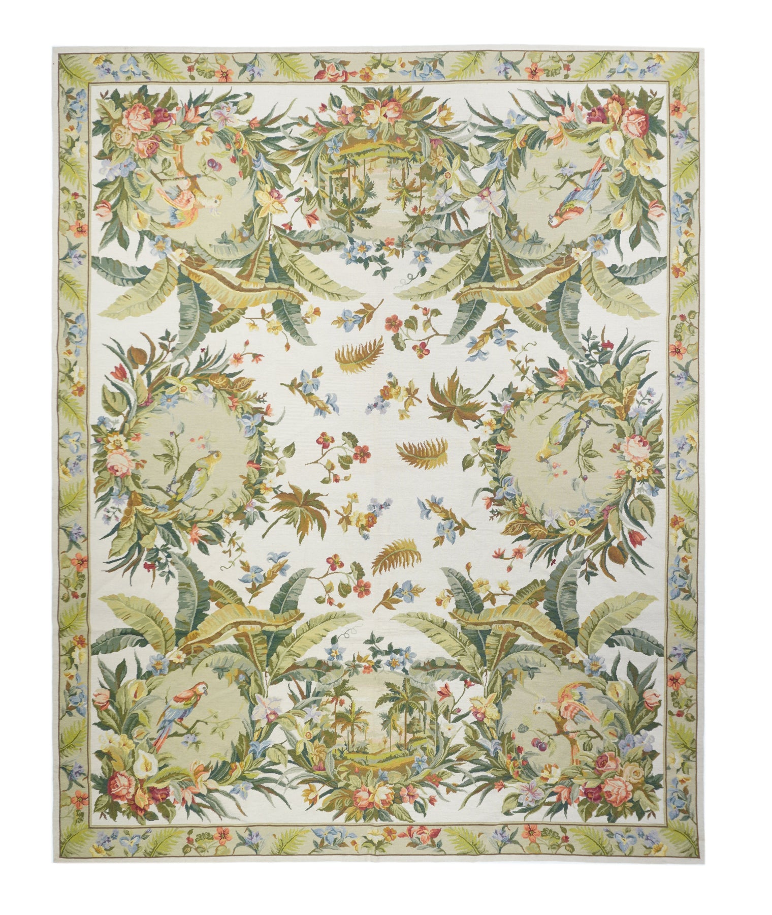 Refers generally to recent carpets in tapestry technique and inspired by French Aubusson designs of the 18th and later centuries. Geometric or semi-floral. Scatters to room sizes. Recent pieces are usually Indian. Wool pattern wefts. Inexpensive to moderate.
