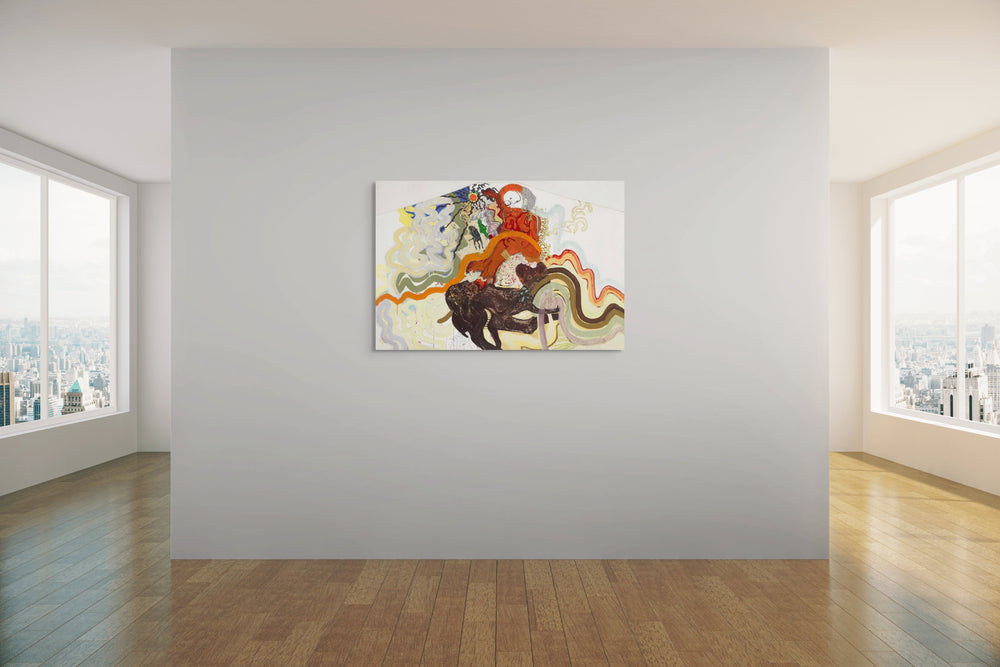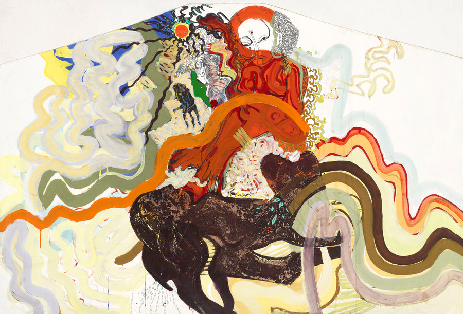 Orient  Inspired by her studies of religious traditions such as Hinduism, Buddhism, Tantra, Sufism, and texts such as the Bhagavad Gita, Ariane’s paintings often have oriental reminiscences. Parallel curvilinear waves give a sense of movement, rhythm and dancing to the painting populated with enigmatic people. Artist name hand-written by mother (estate) on back Mixed media on heavyweight acid-free paper 29.5 x 44 in (75 x 112 cm)