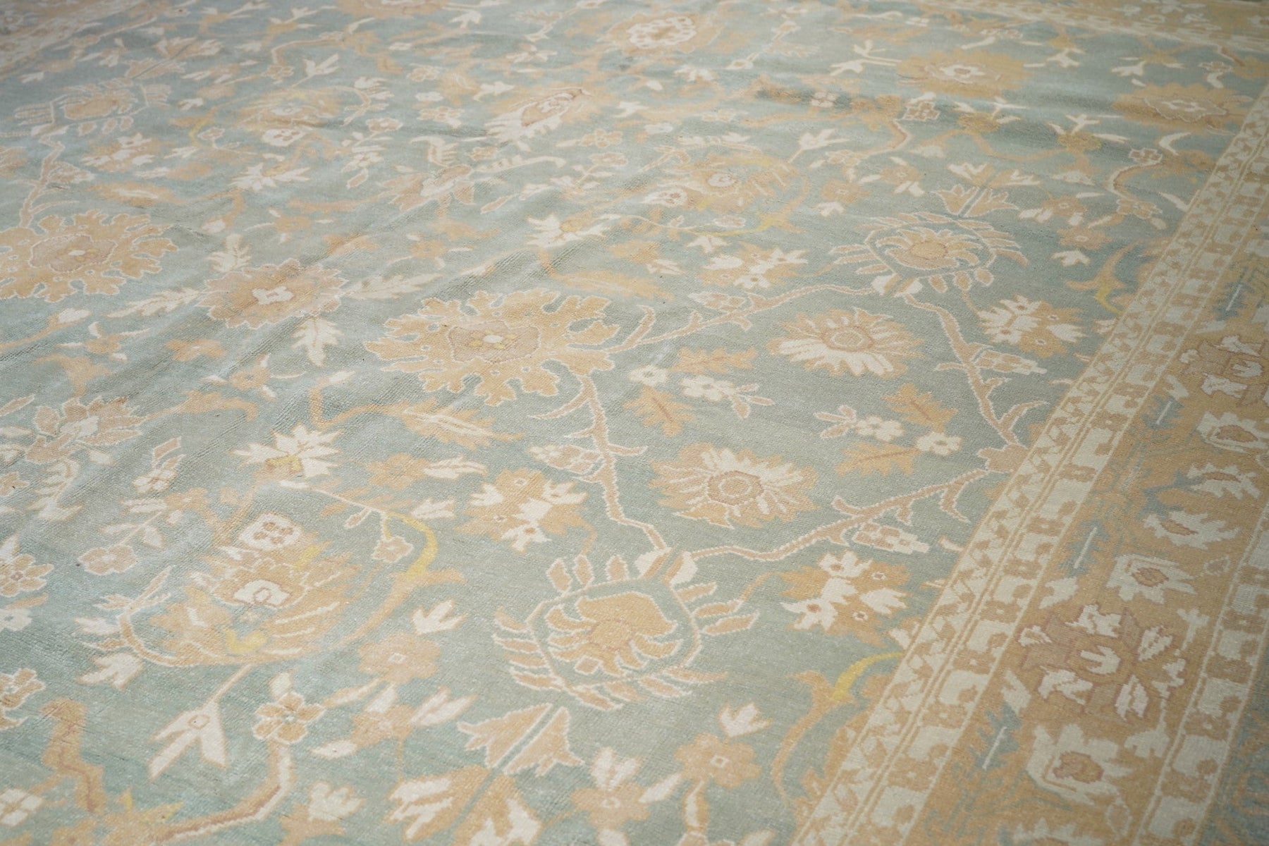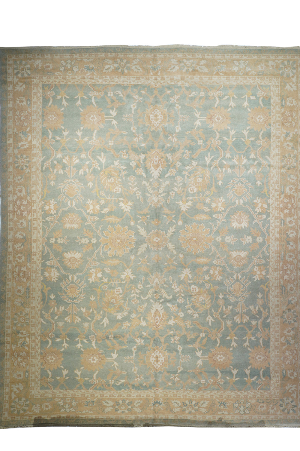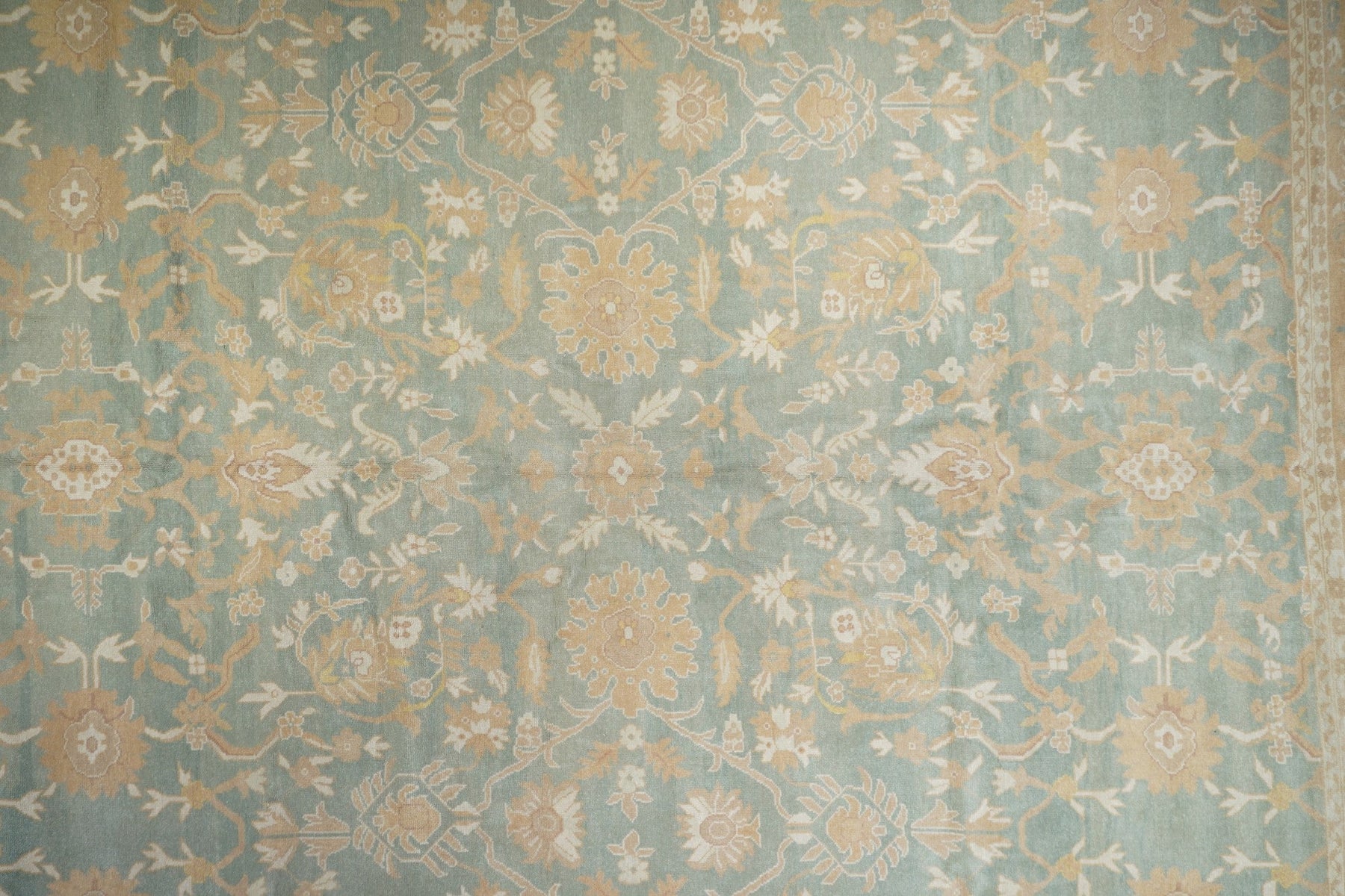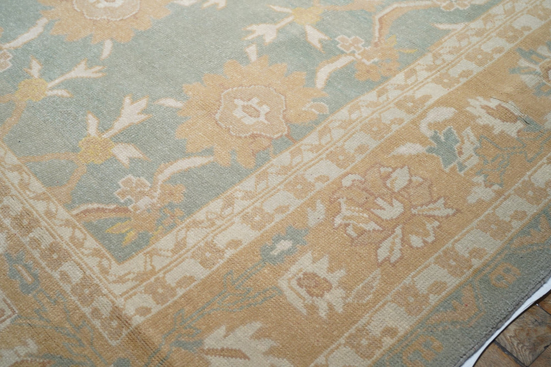 This recent west Turkish workshop carpet in a coarse weave, show an abrashed jade green field with a well-spaced allover, four-section pattern of large open hexagons, ragged palmettes, petal-fringed palmettes. and short leafy stems. Salmon-rust border with bitonal corner rosettes, leaves and simple palmettes. As new condition. Thick pile.
