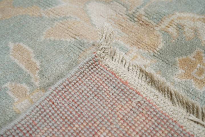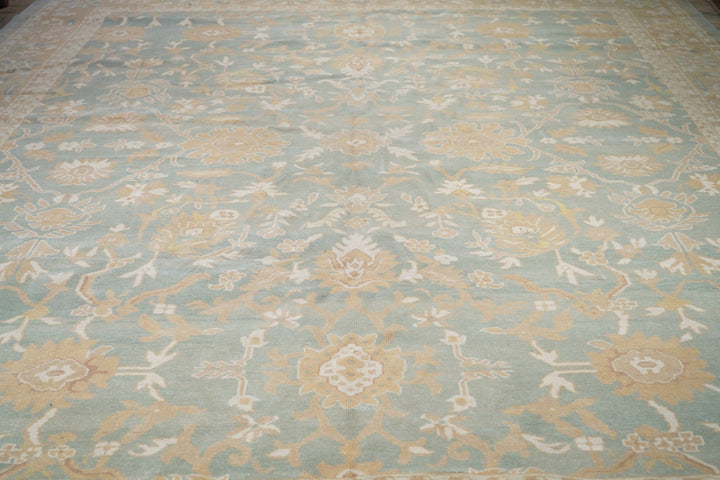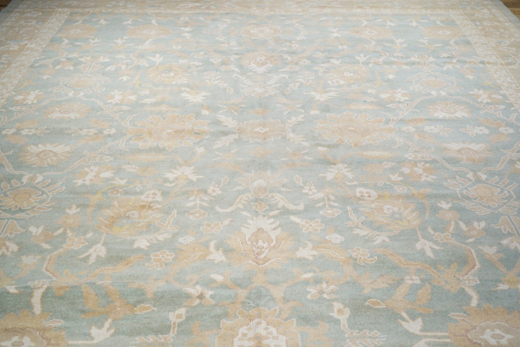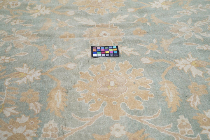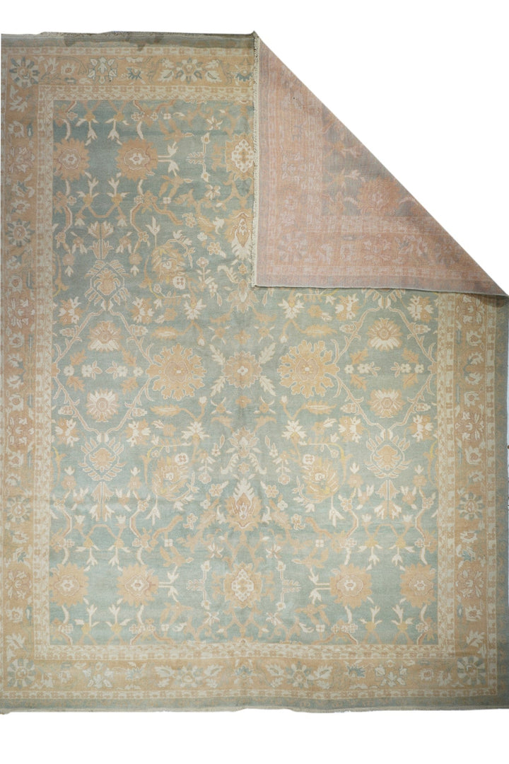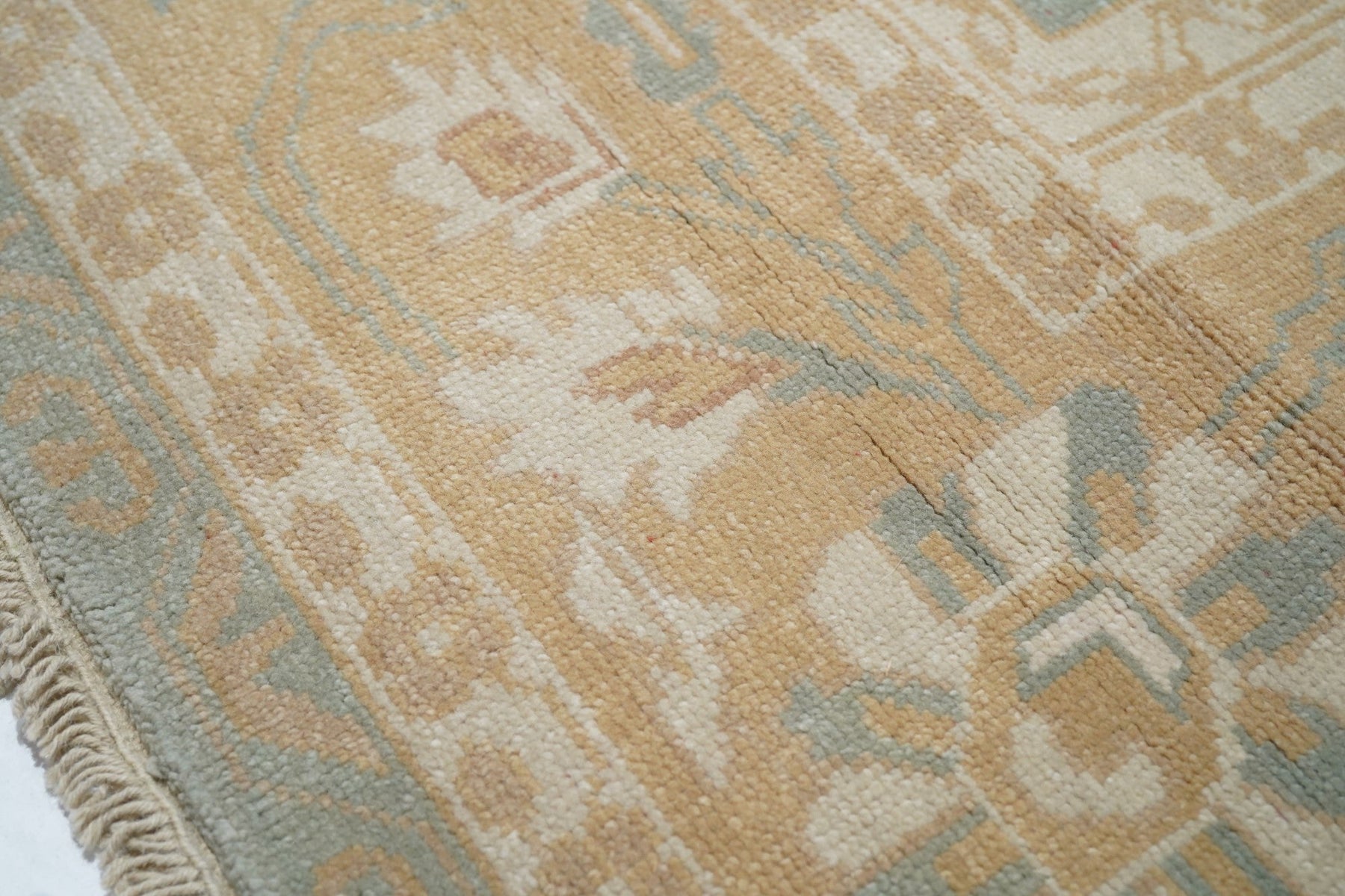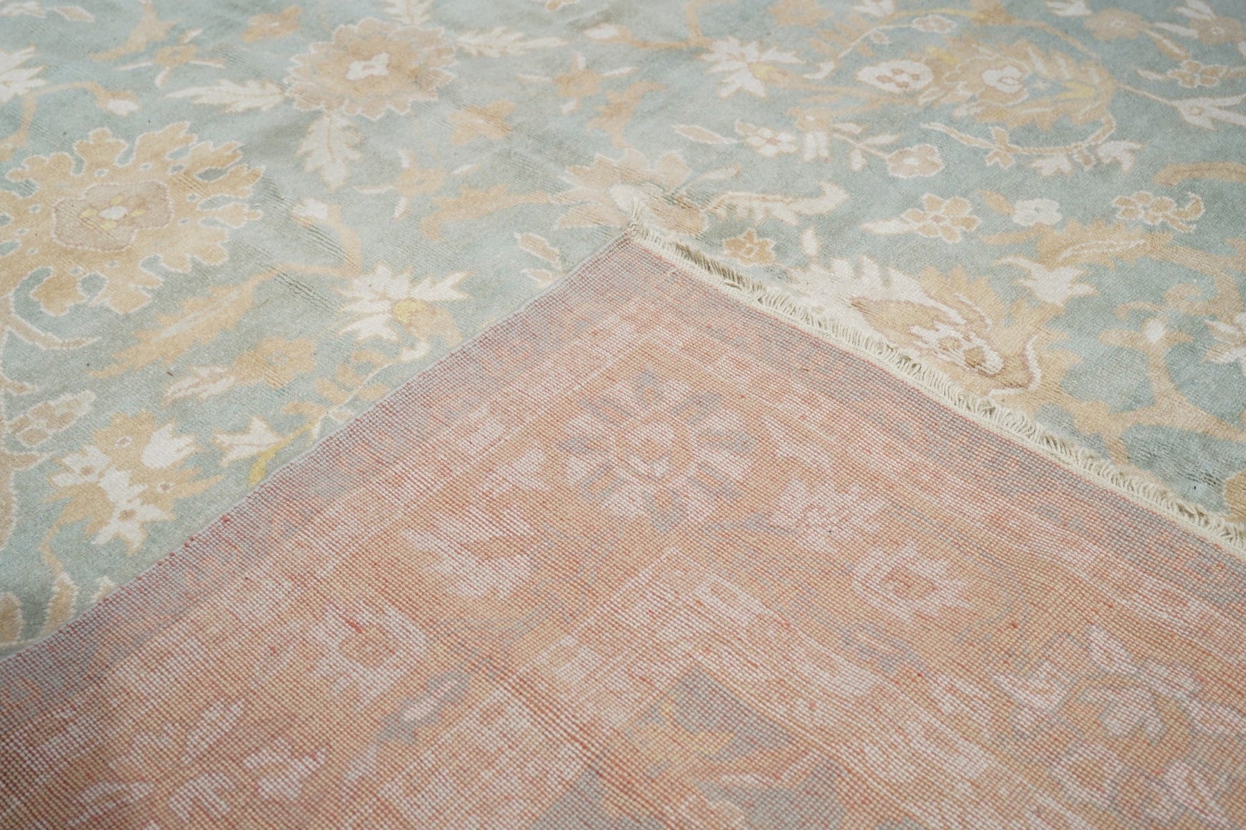 This recent west Turkish workshop carpet in a coarse weave, show an abrashed jade green field with a well-spaced allover, four-section pattern of large open hexagons, ragged palmettes, petal-fringed palmettes. and short leafy stems. Salmon-rust border with bitonal corner rosettes, leaves and simple palmettes. As new condition. Thick pile.