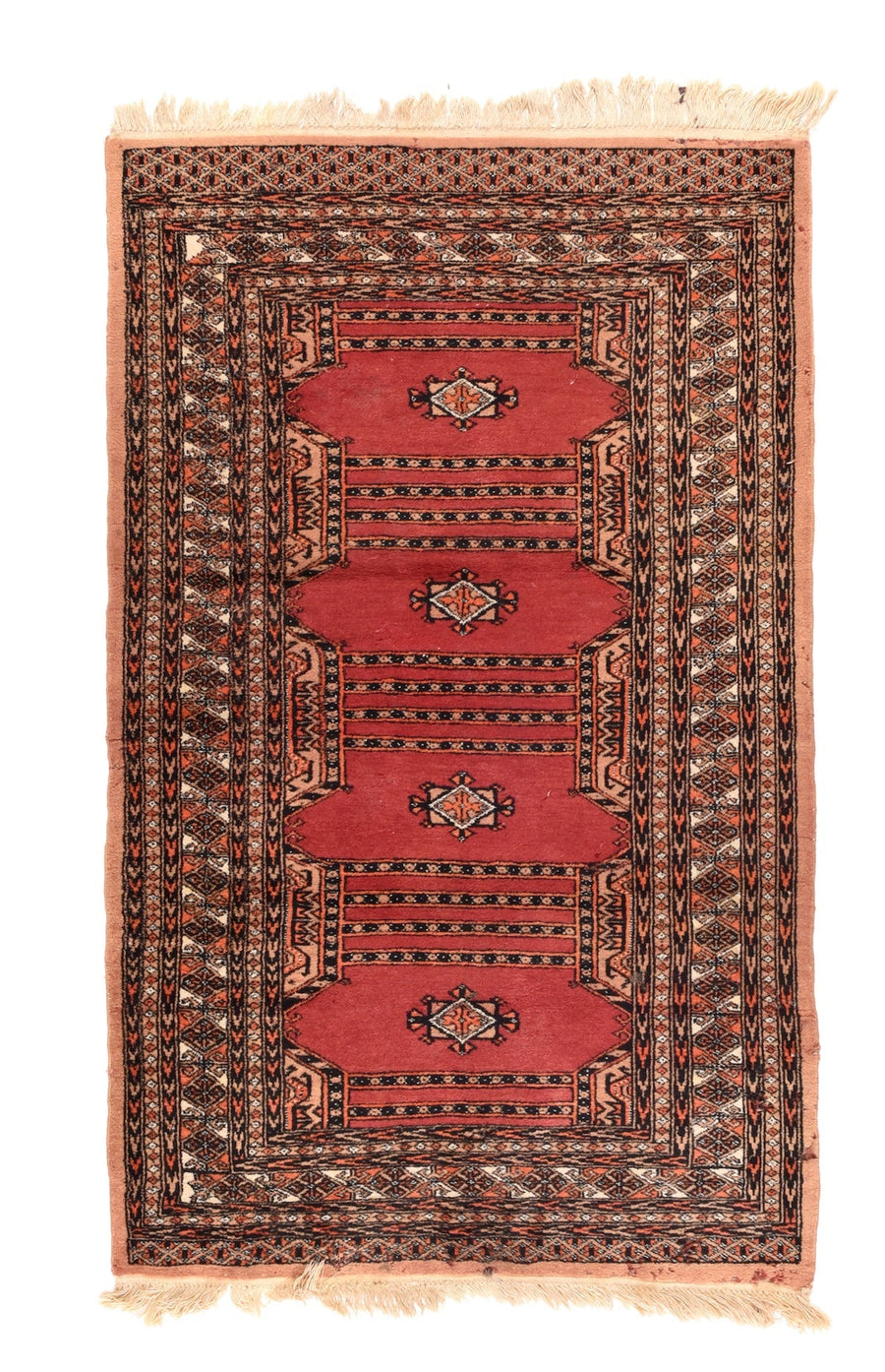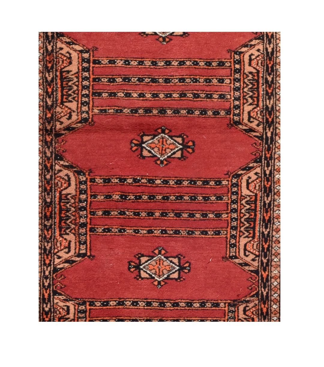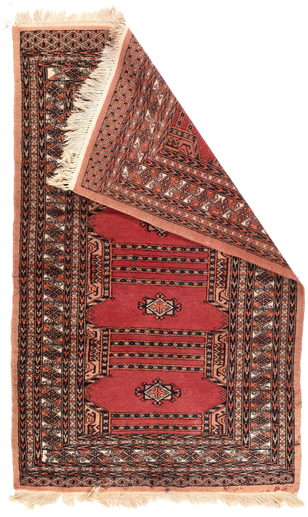 This Turkmen-style, cotton foundation small scatter shows a red field separated into four large sections divided by groups of four lines with enclosed small octogrammes. Saryk-style border with X's and hexagons, and four chevron tuning fork minor borders. Narrow end elemt panels with lozenge patterns. Good condition.