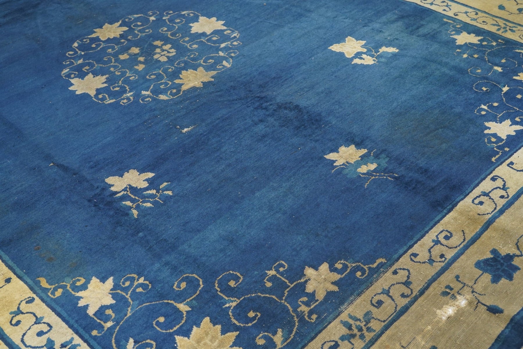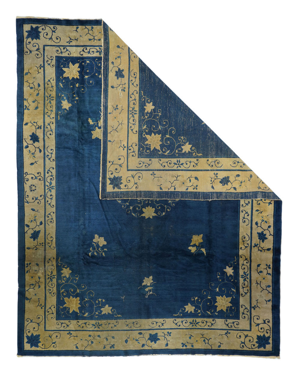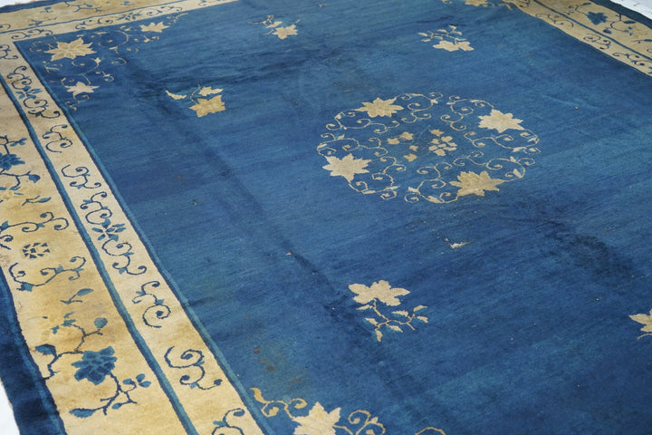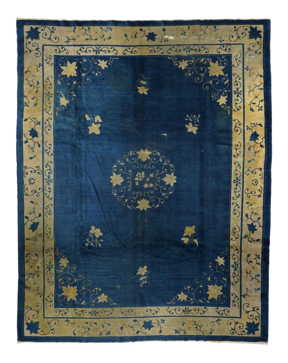 From northeast China, this export carpet shows a deep blue field organized by an open arabesque and four paeony medallion, around which easily flow six small tree paeonies, and paeony and spiral arabesque open corners. Beige main borer with paeonies and arabesques. Plain dark blue uttermost frame matches field. Fair condition with varying wear. Cotton foundation, moderate/medium weave.