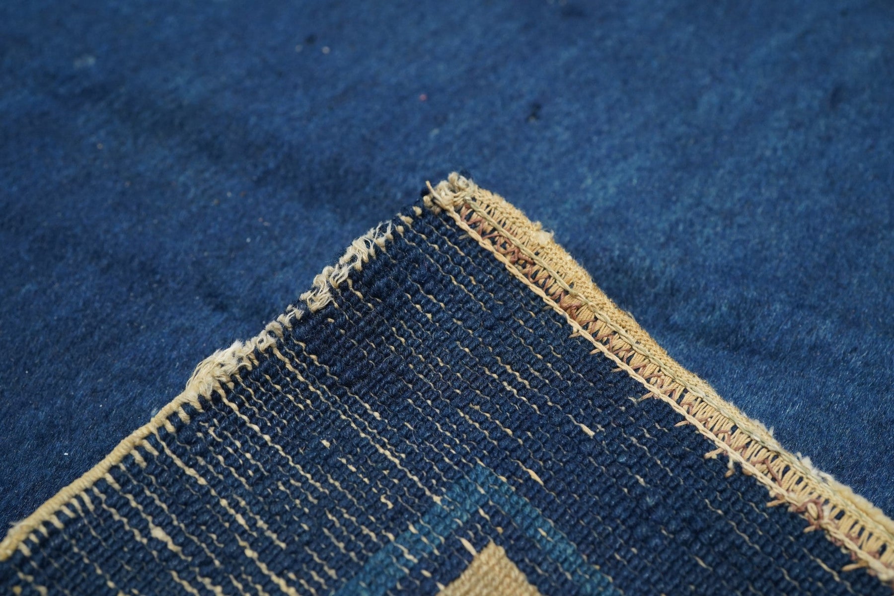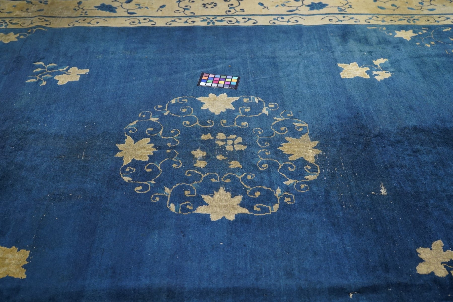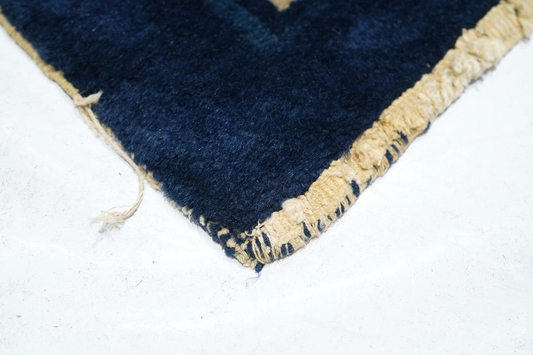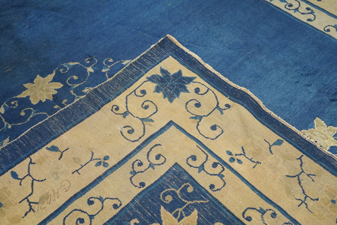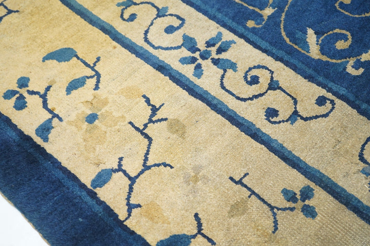 From northeast China, this export carpet shows a deep blue field organized by an open arabesque and four paeony medallion, around which easily flow six small tree paeonies, and paeony and spiral arabesque open corners. Beige main borer with paeonies and arabesques. Plain dark blue uttermost frame matches field. Fair condition with varying wear. Cotton foundation, moderate/medium weave.