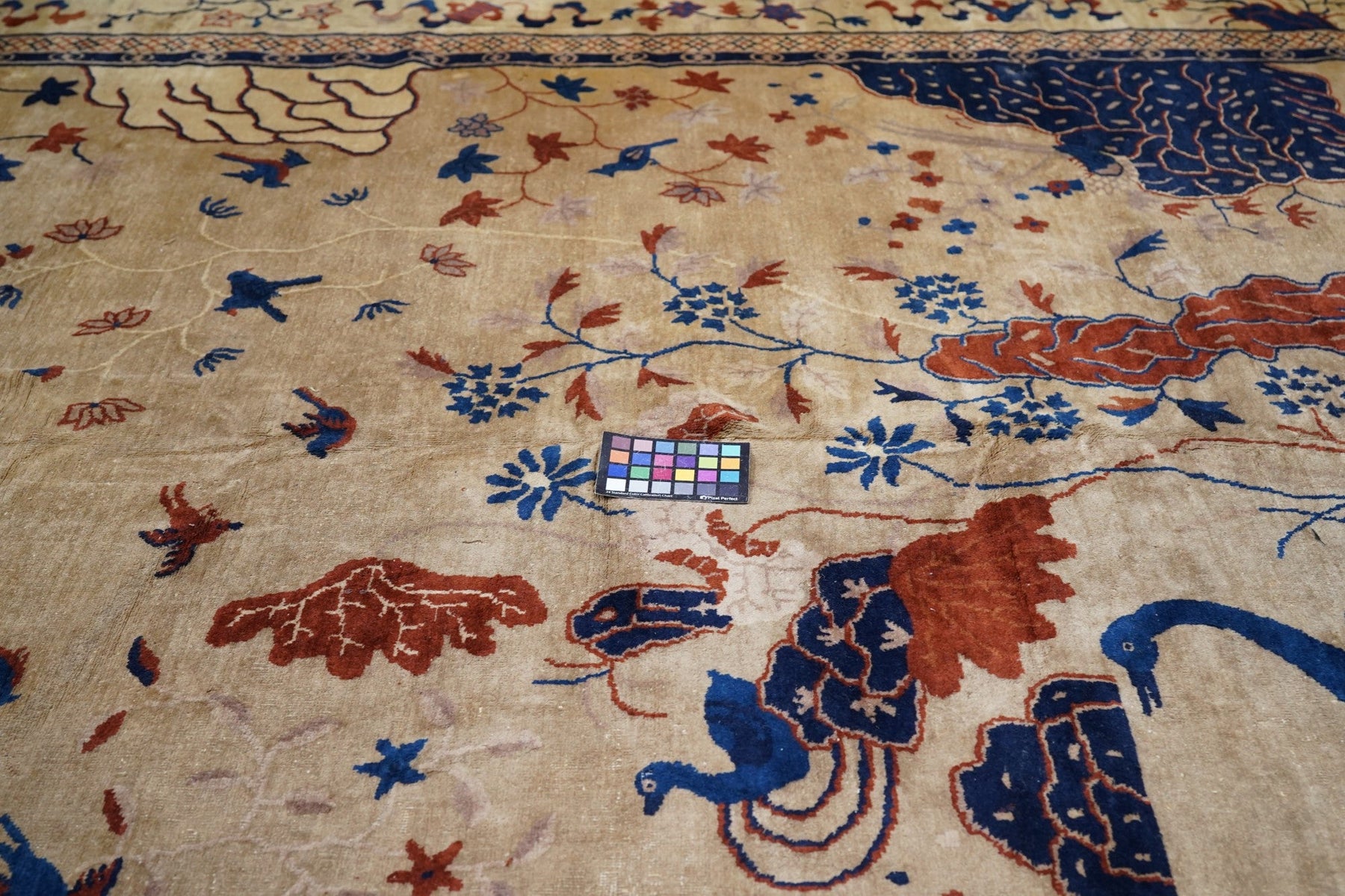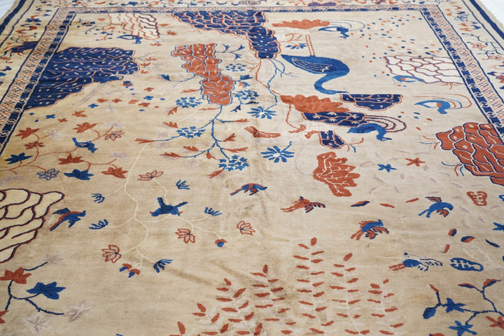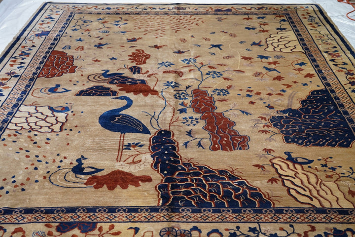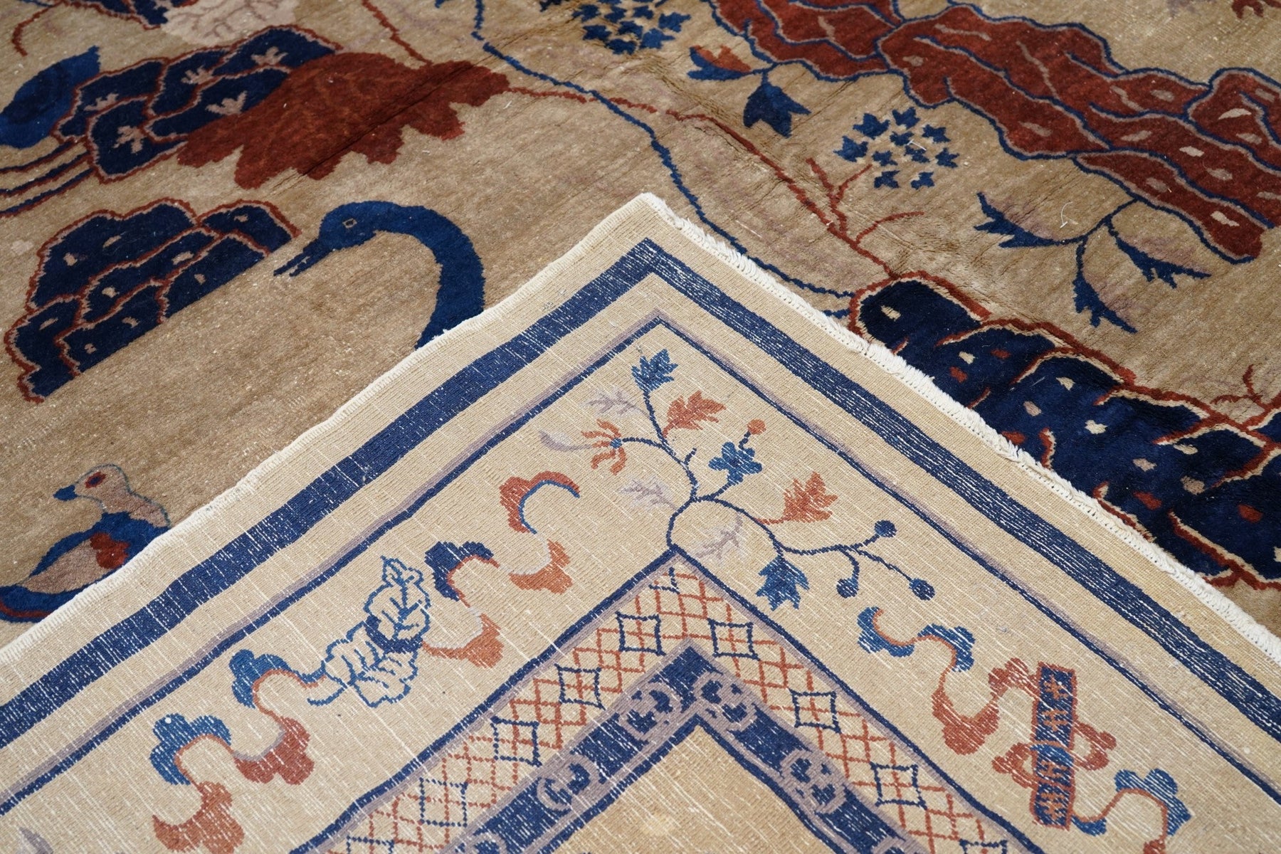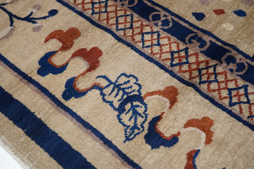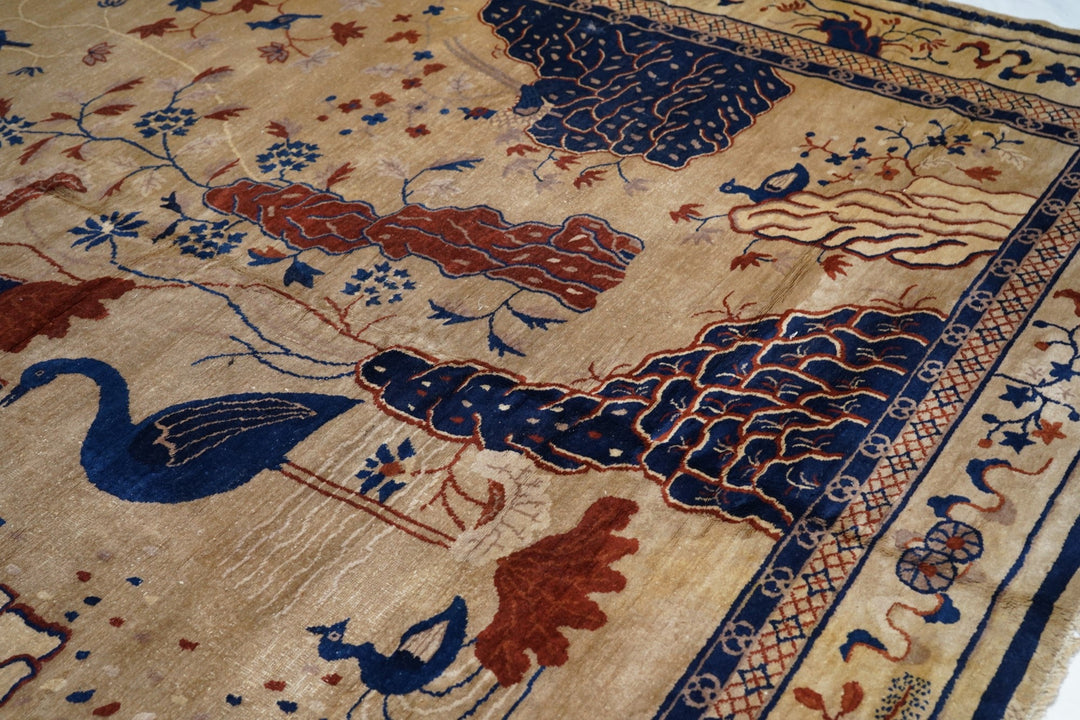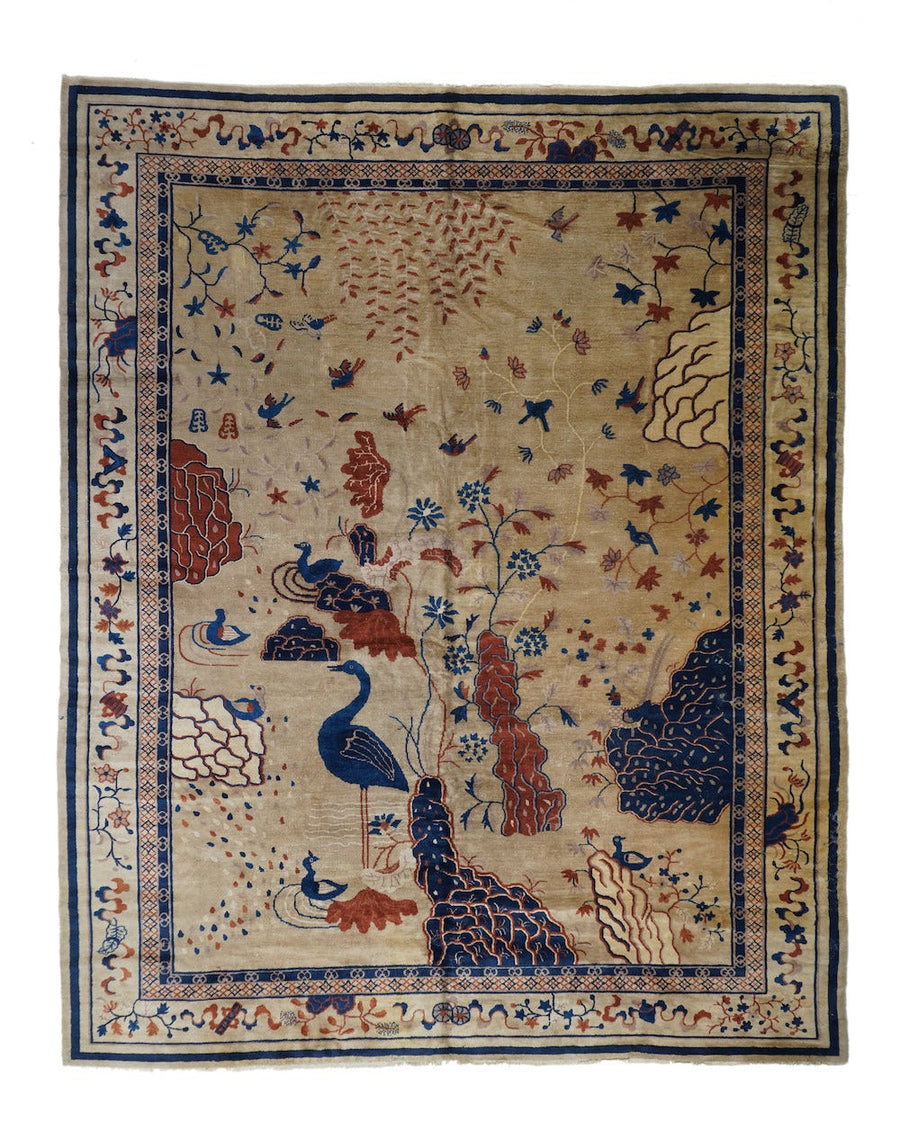The Chinese carpets from the 19th century onward, in traditional patterns, often blue-and-white, in room sizes, scatters, and runners. A few pictorials. Moderate to medium weaves, cotton foundations. Medallions primarily. Medium priced.