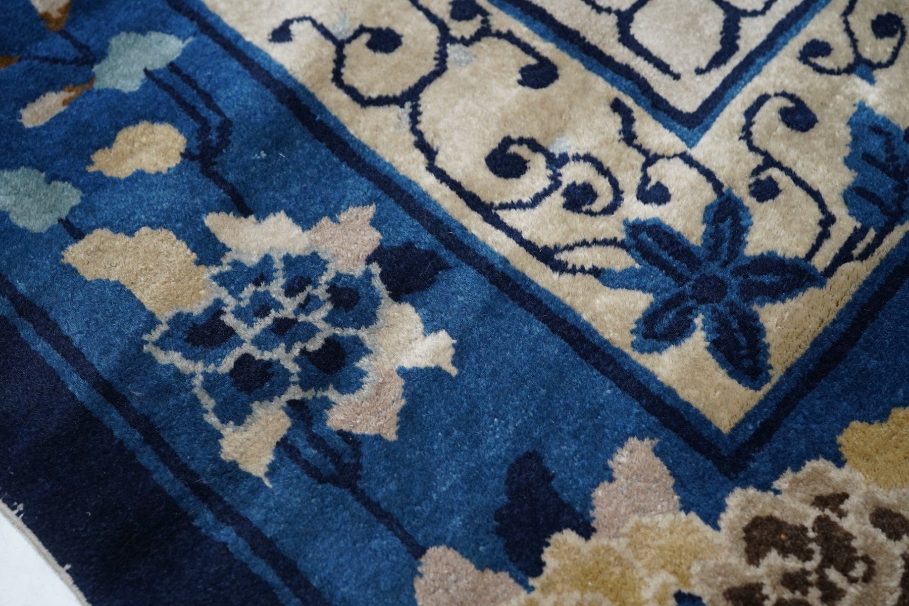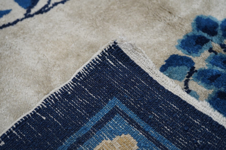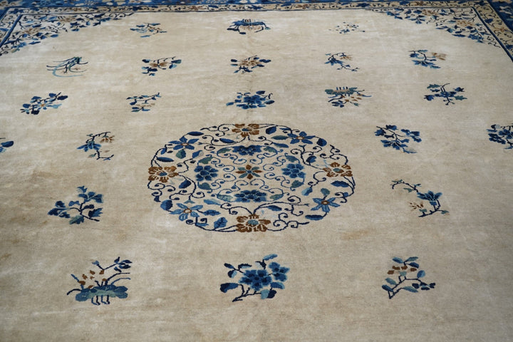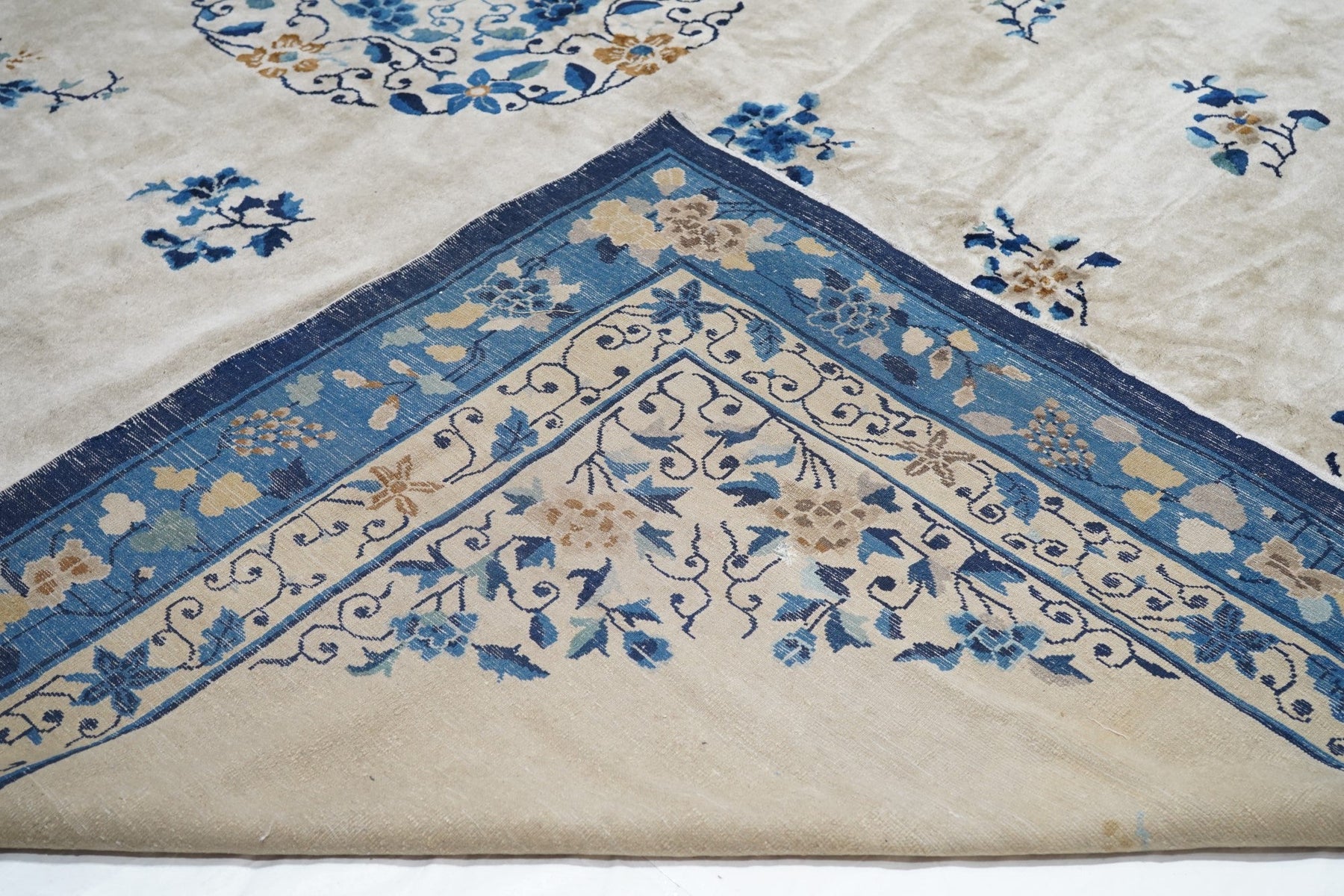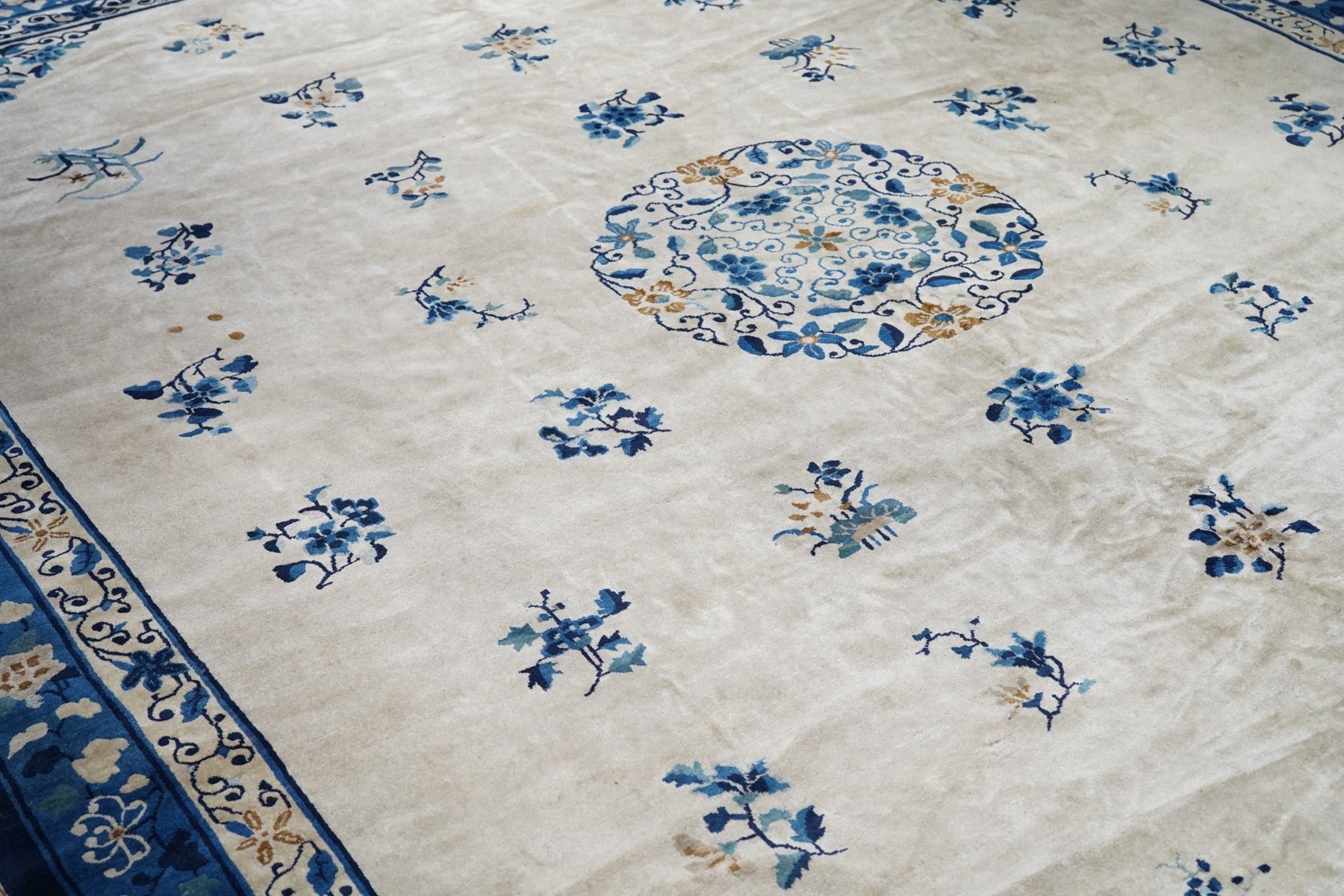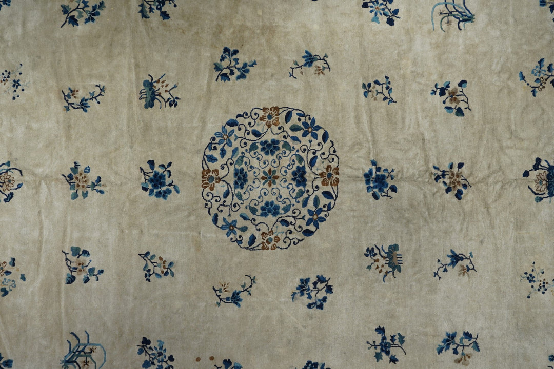 The Chinese carpets from the 19th century onward, in traditional patterns, often blue-and-white, in room sizes, scatters, and runners. A few pictorials. Moderate to medium weaves, cotton foundations. Medallions primarily. Medium priced.