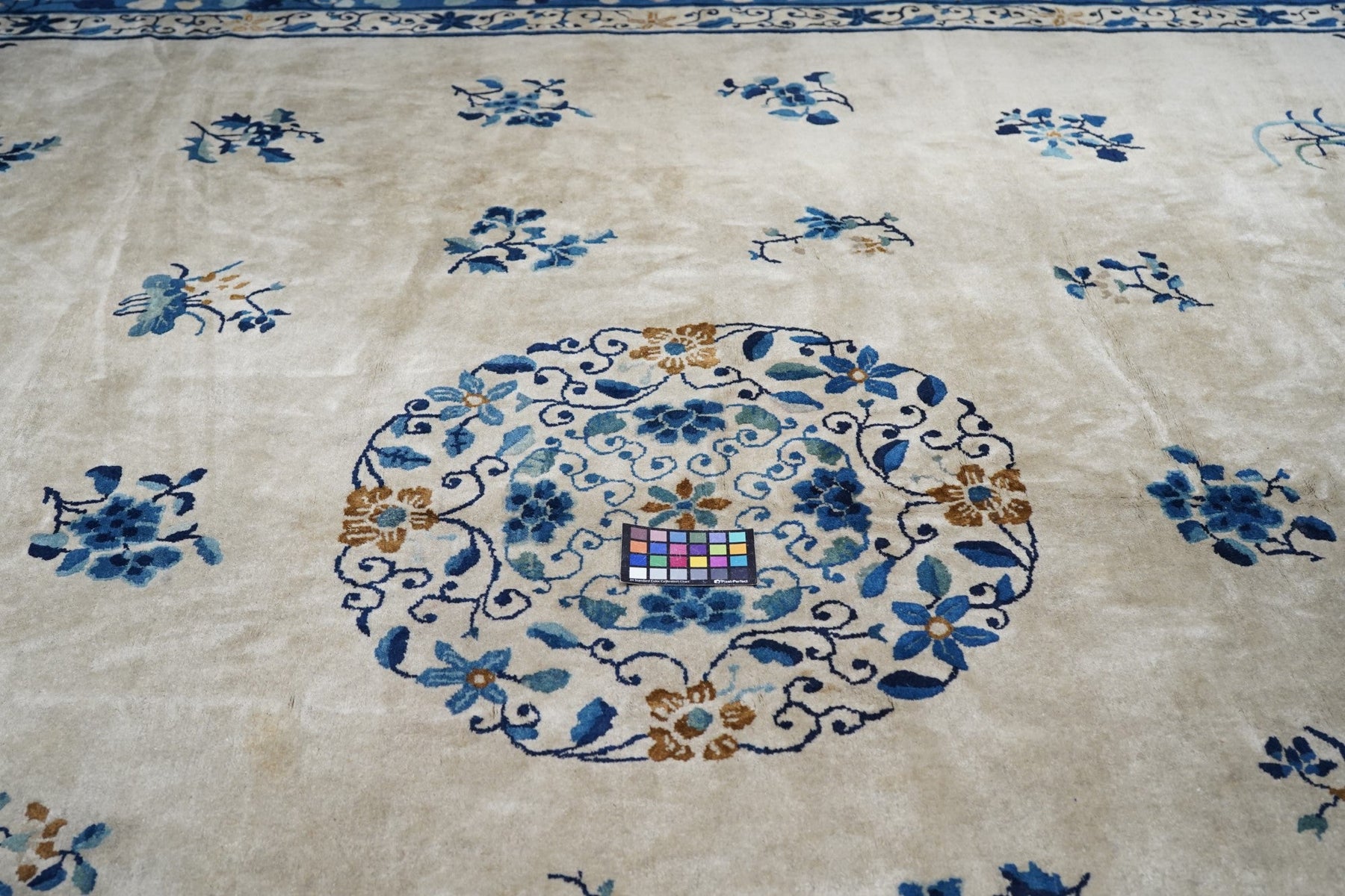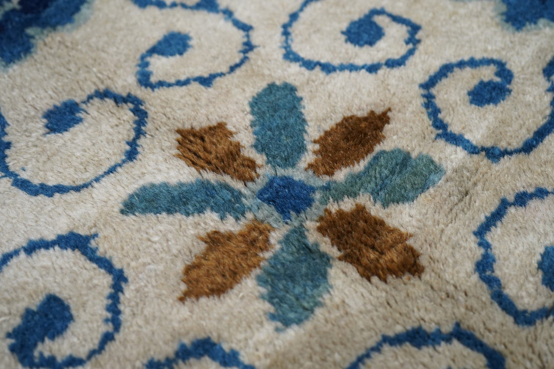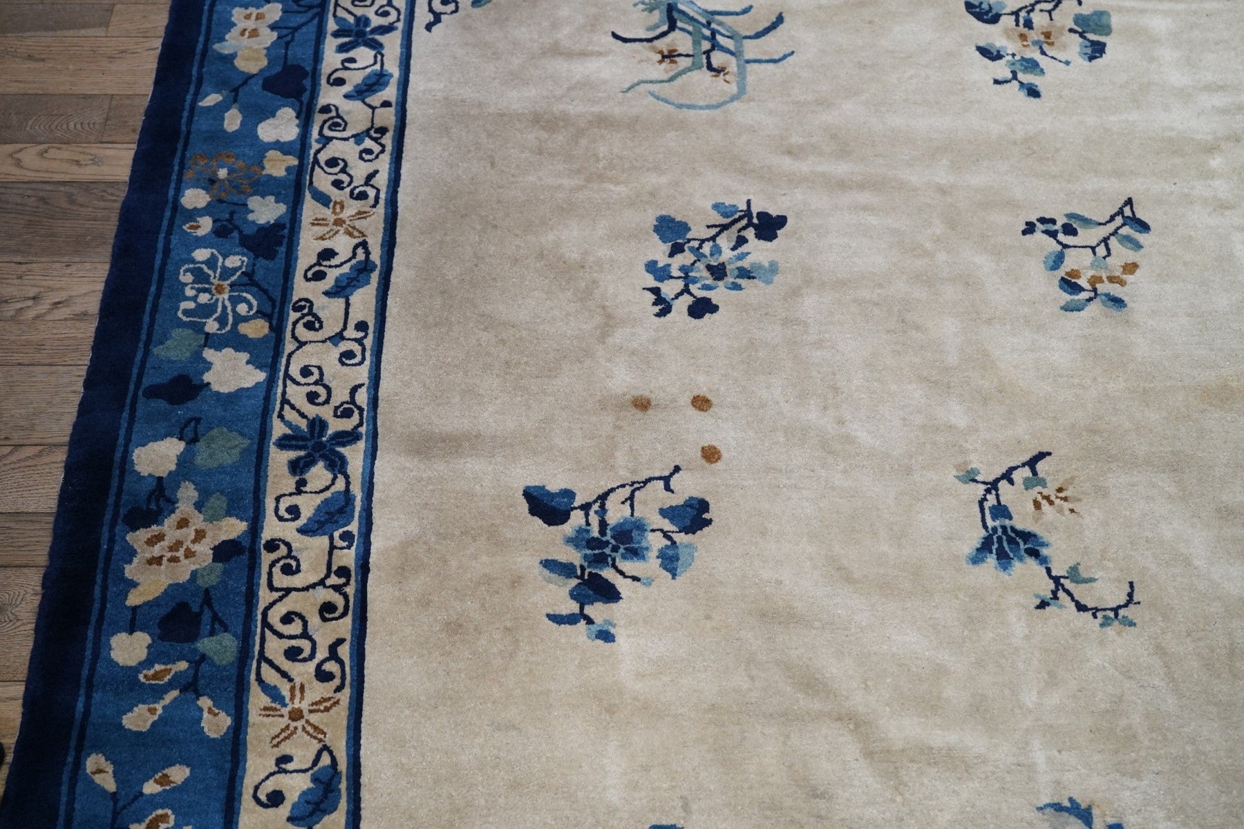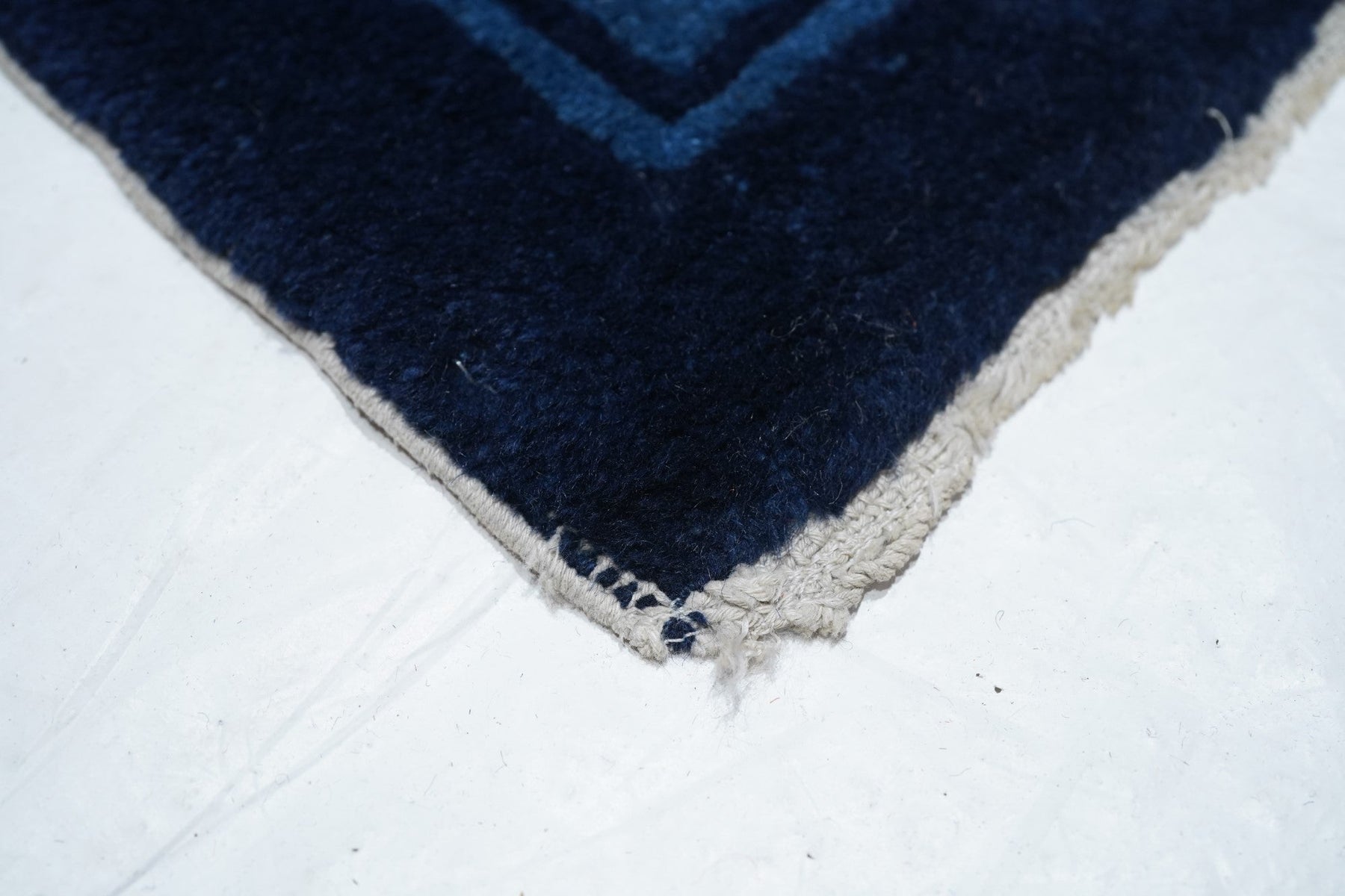 The Chinese carpets from the 19th century onward, in traditional patterns, often blue-and-white, in room sizes, scatters, and runners. A few pictorials. Moderate to medium weaves, cotton foundations. Medallions primarily. Medium priced.