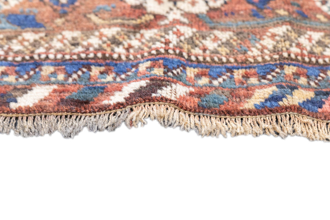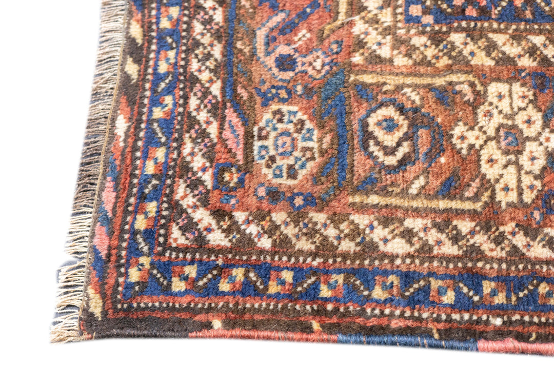 Probably SW Persian Khamseh Baharlu rather than SE Persian Afshar, this tribal, all wool scatter shows seven offset reversing rows of nested botehs on an ecru ground, with fragmentary vegetal ornament and little animals between. Red border of botehs and rosettes. Striped bitonal minor borders. Very slight end reduction. Medium tribal weave. Good condition.