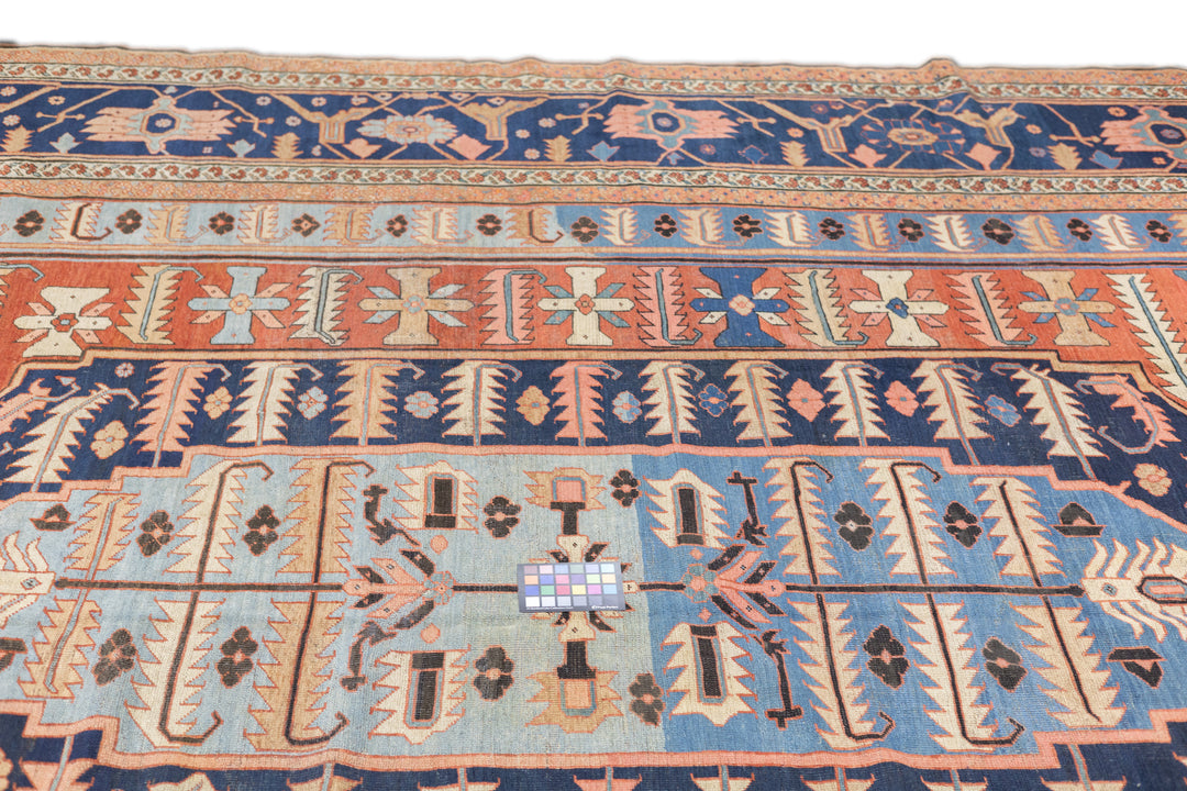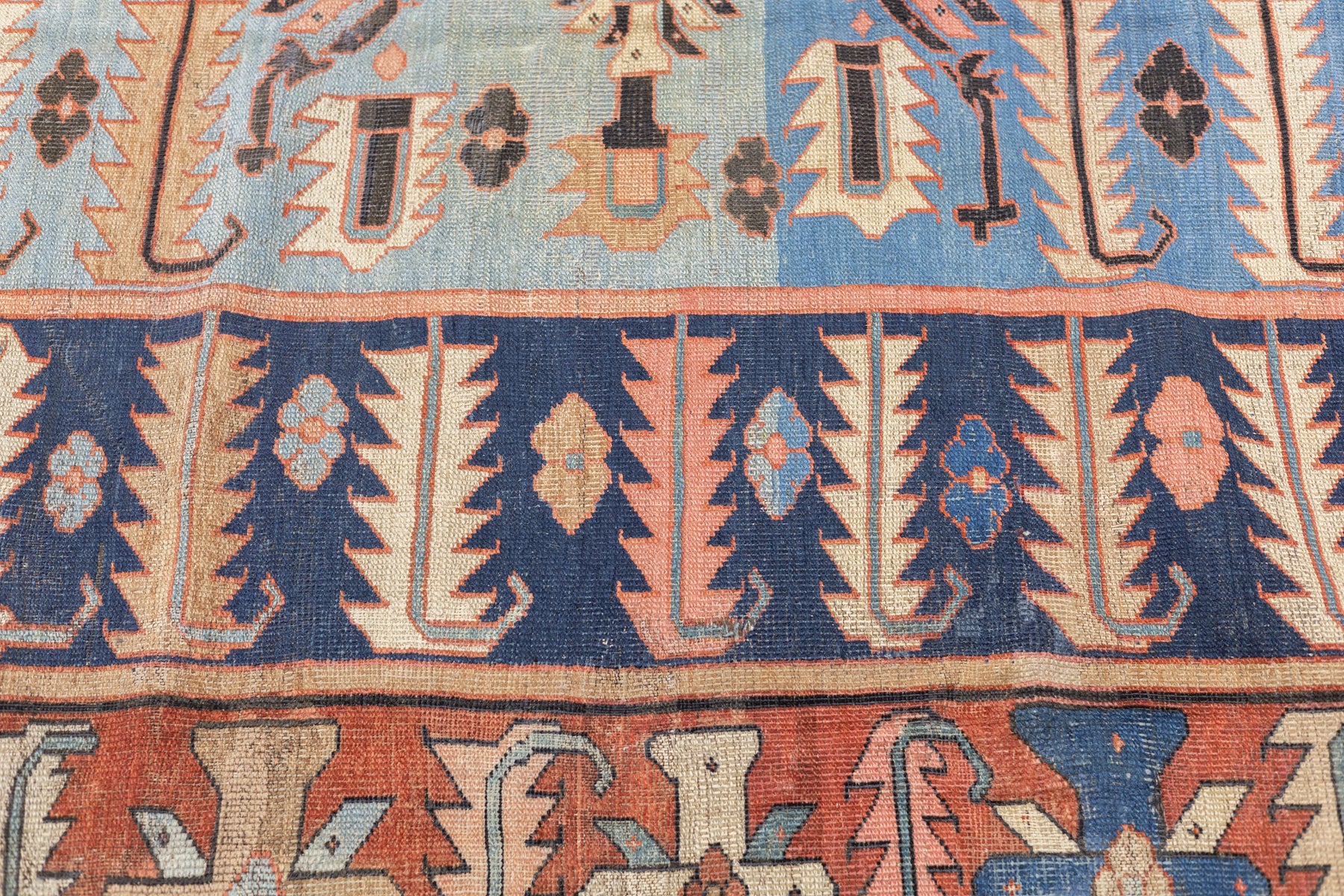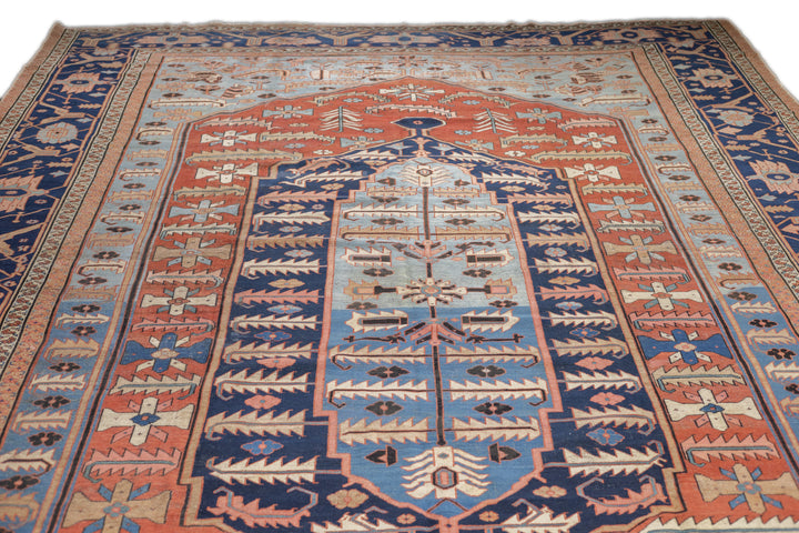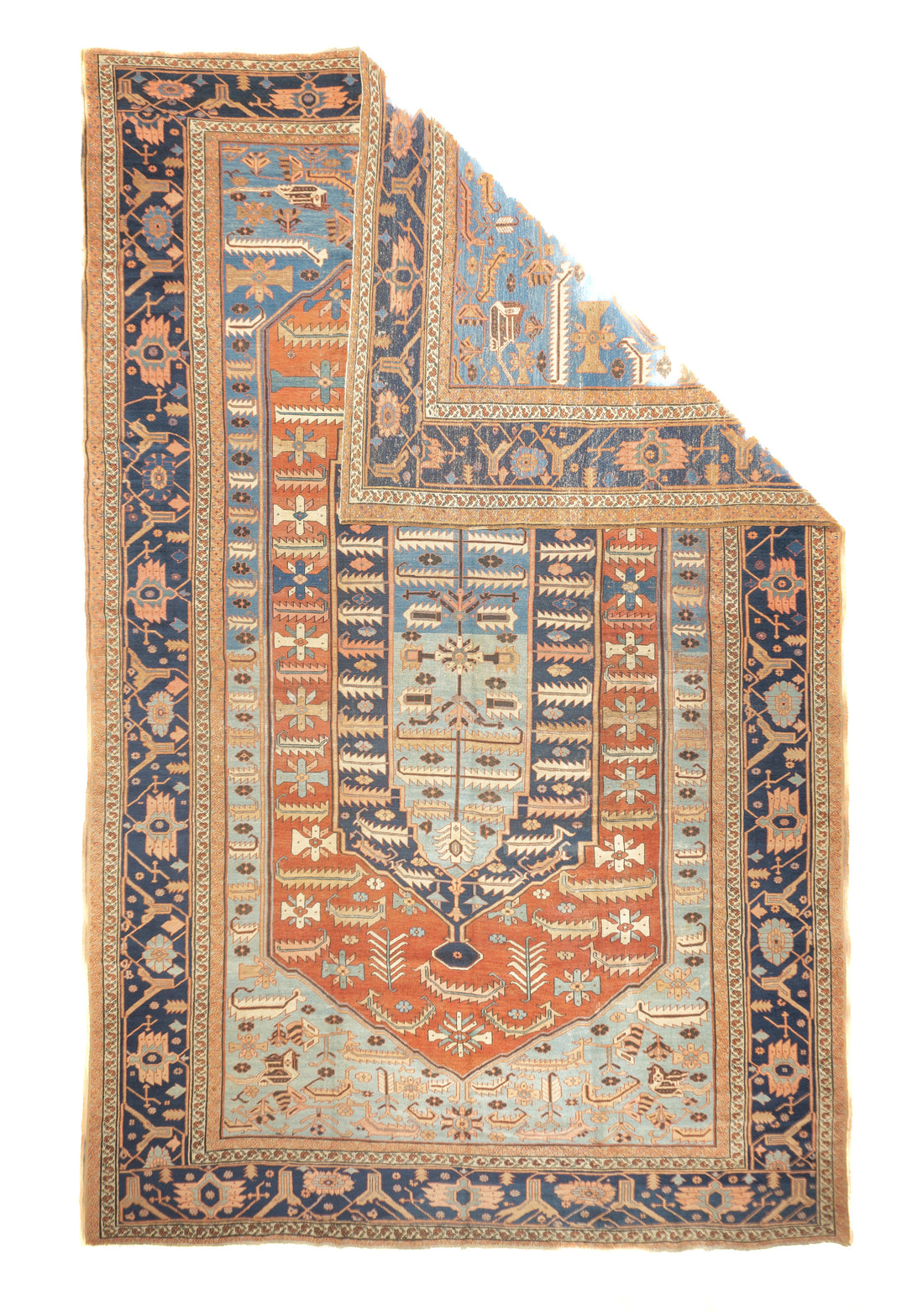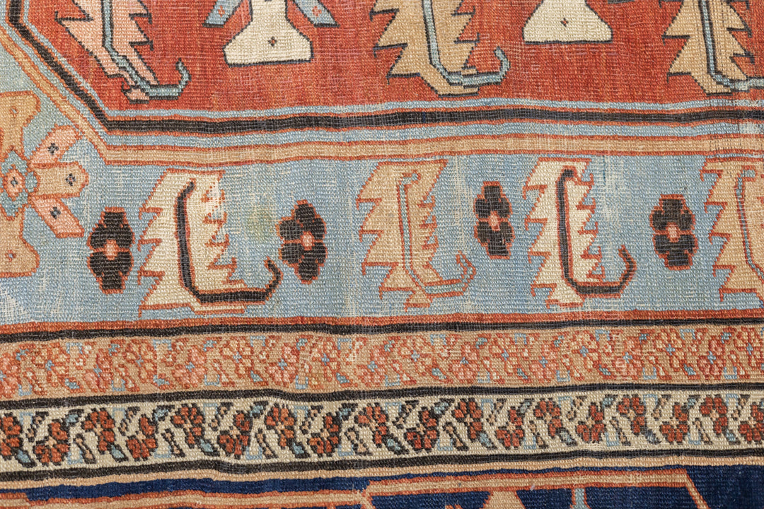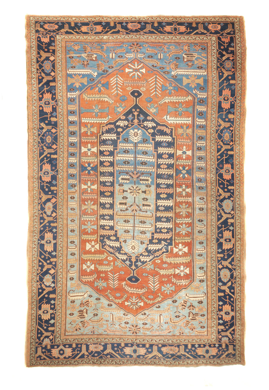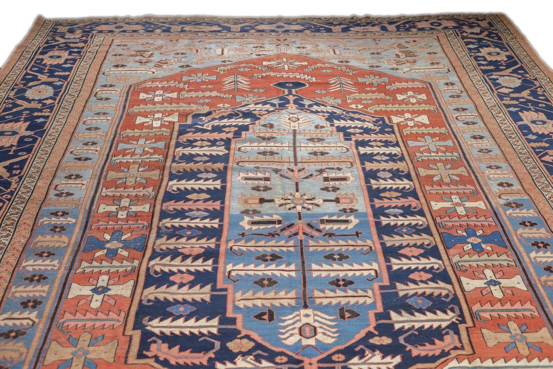 The field abrashes from powder to light blue, and shows a tall red hexagonal panel decorated with rosettes and barbed straight leaves, enclosing concentric navy and light blue-powder medallions, with similar barbed leaf designs. Dark blue main border with serrated geometric palmettes alternating with rosettes. Slight reduction of plain outer border at the ends. Cotton foundation. Moderate weave, Good condition. Natural dyes.