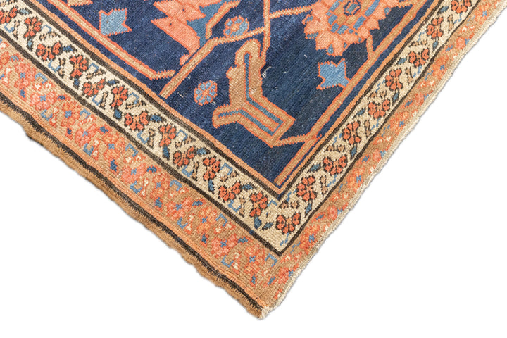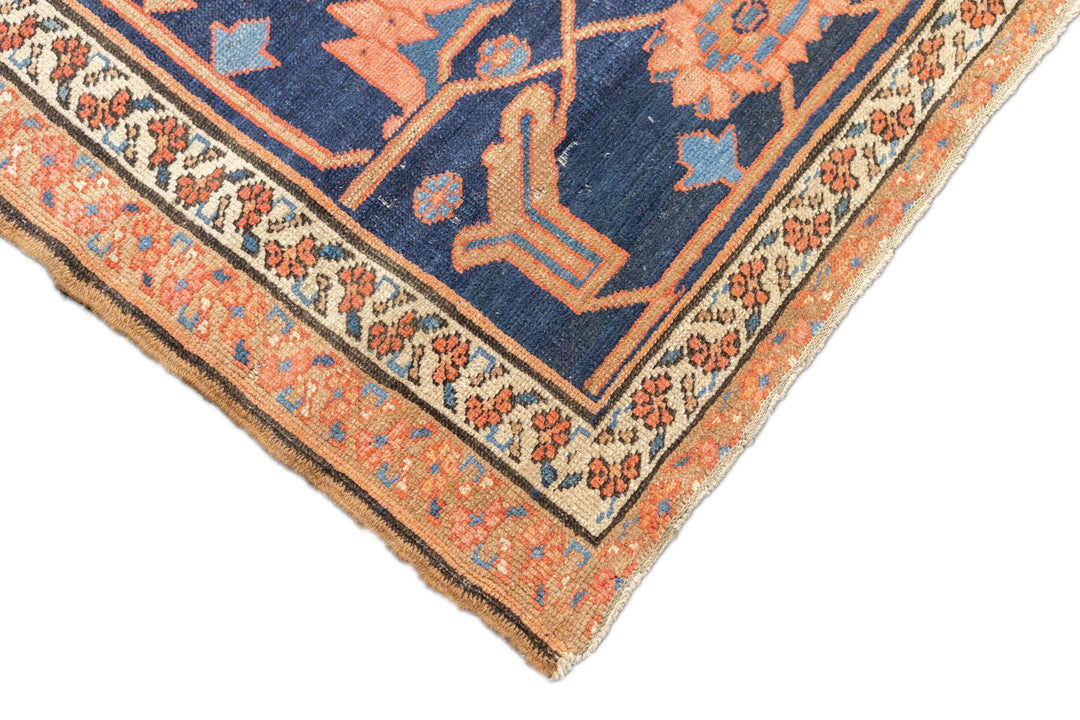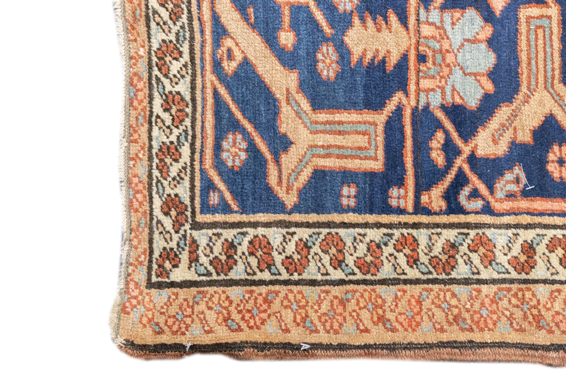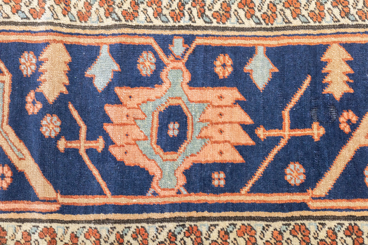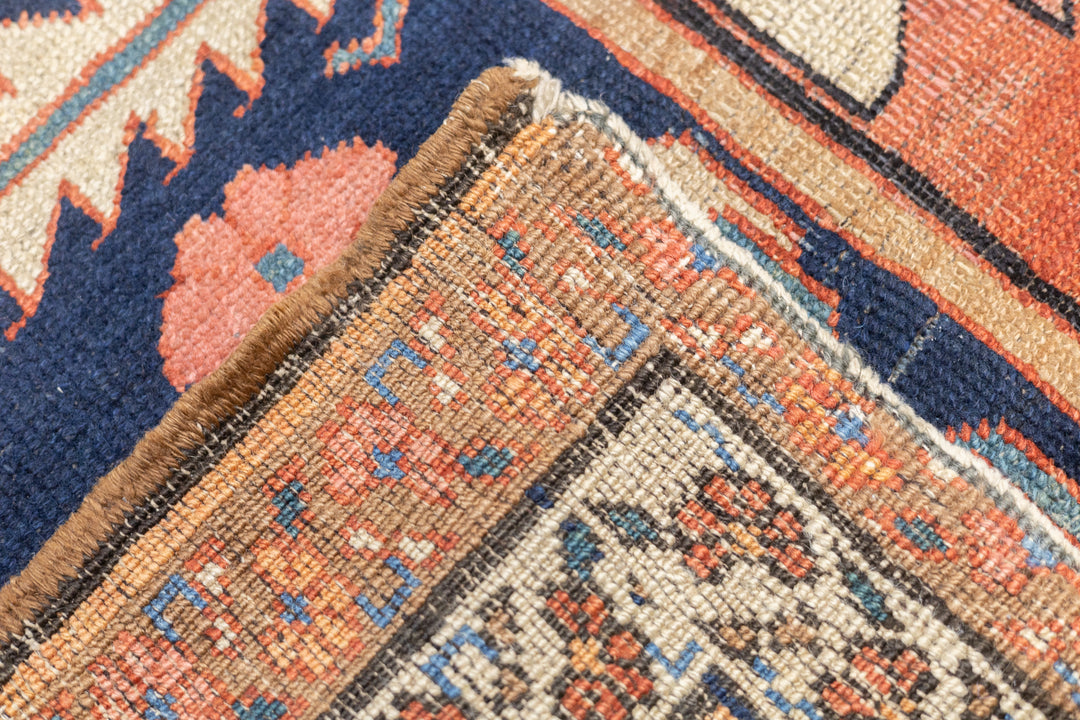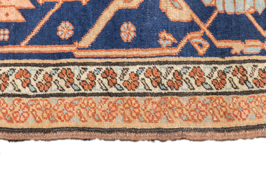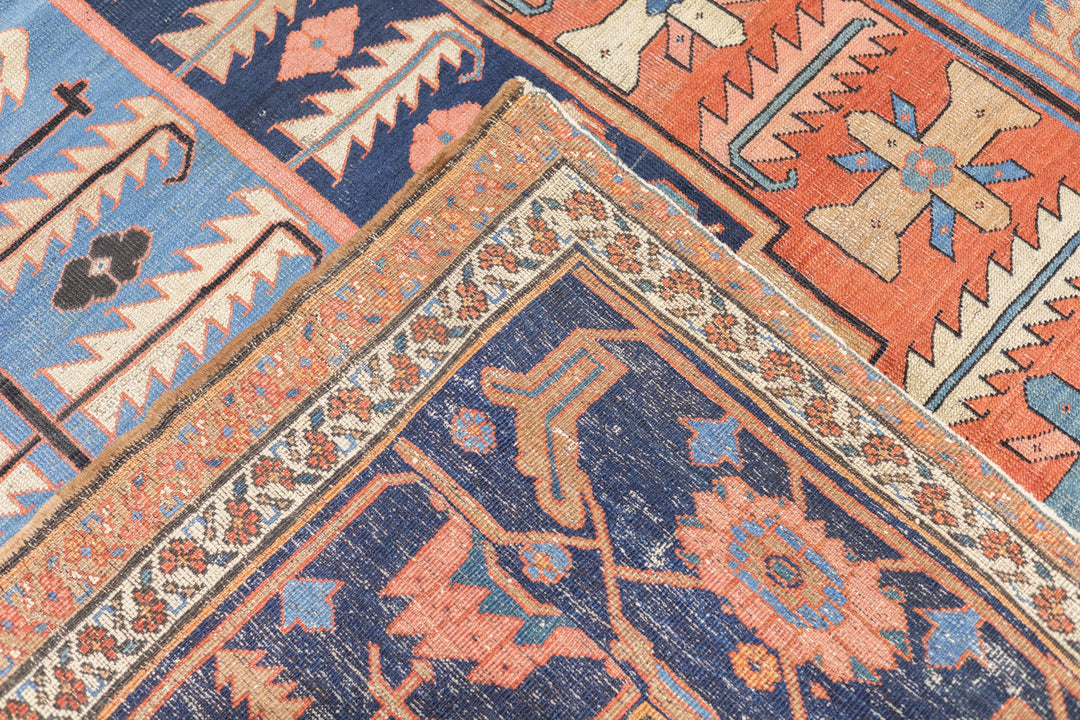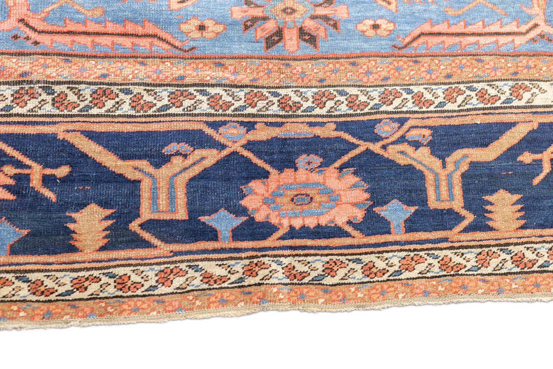 The field abrashes from powder to light blue, and shows a tall red hexagonal panel decorated with rosettes and barbed straight leaves, enclosing concentric navy and light blue-powder medallions, with similar barbed leaf designs. Dark blue main border with serrated geometric palmettes alternating with rosettes. Slight reduction of plain outer border at the ends. Cotton foundation. Moderate weave, Good condition. Natural dyes.