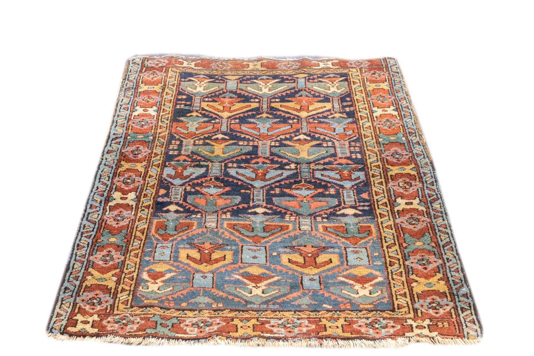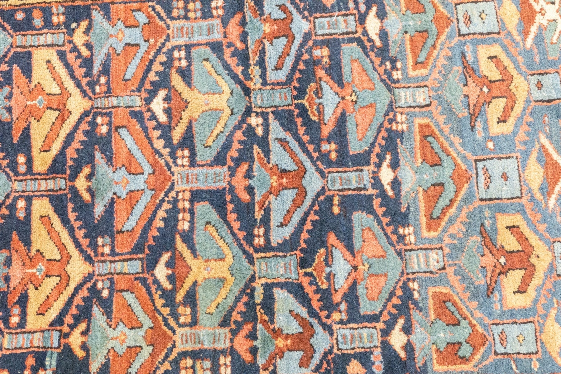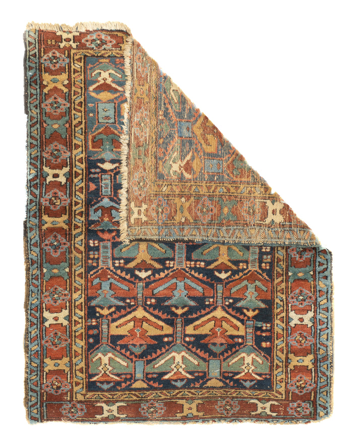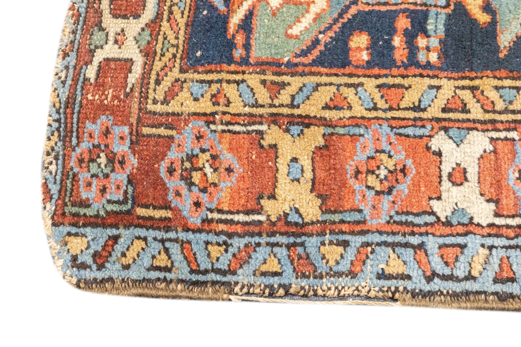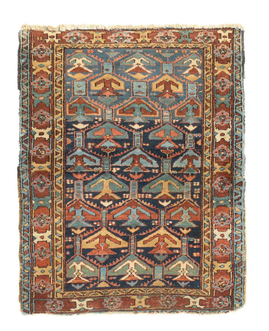 Although in somewhat compromised condition, this charming NW Persian rustic scatter still displays significant artistic quality. The abrashed blue field show a broad hexagonal lattice enclosing stylized flowers. The red border features funky rosettes and armed separator bars, Could be from the Karaja/Karadagh area in Azerbaijan. Moderate weave on cotton.