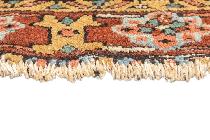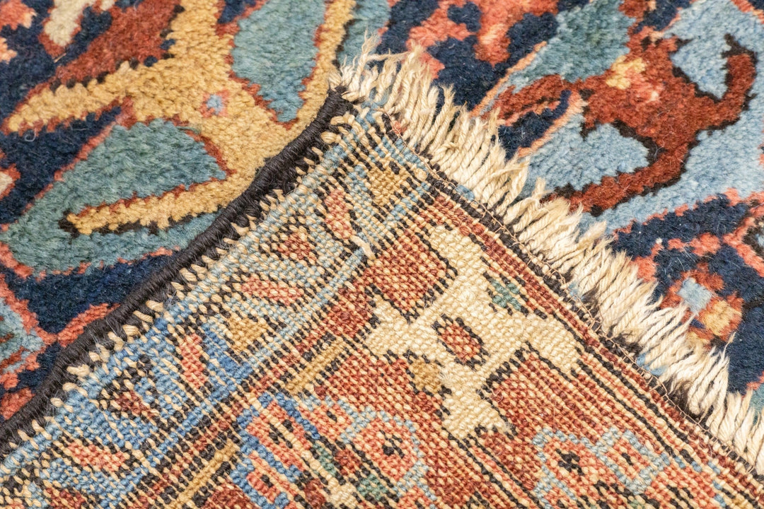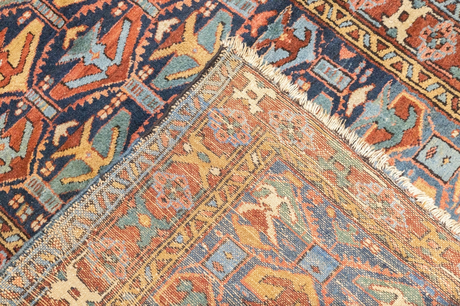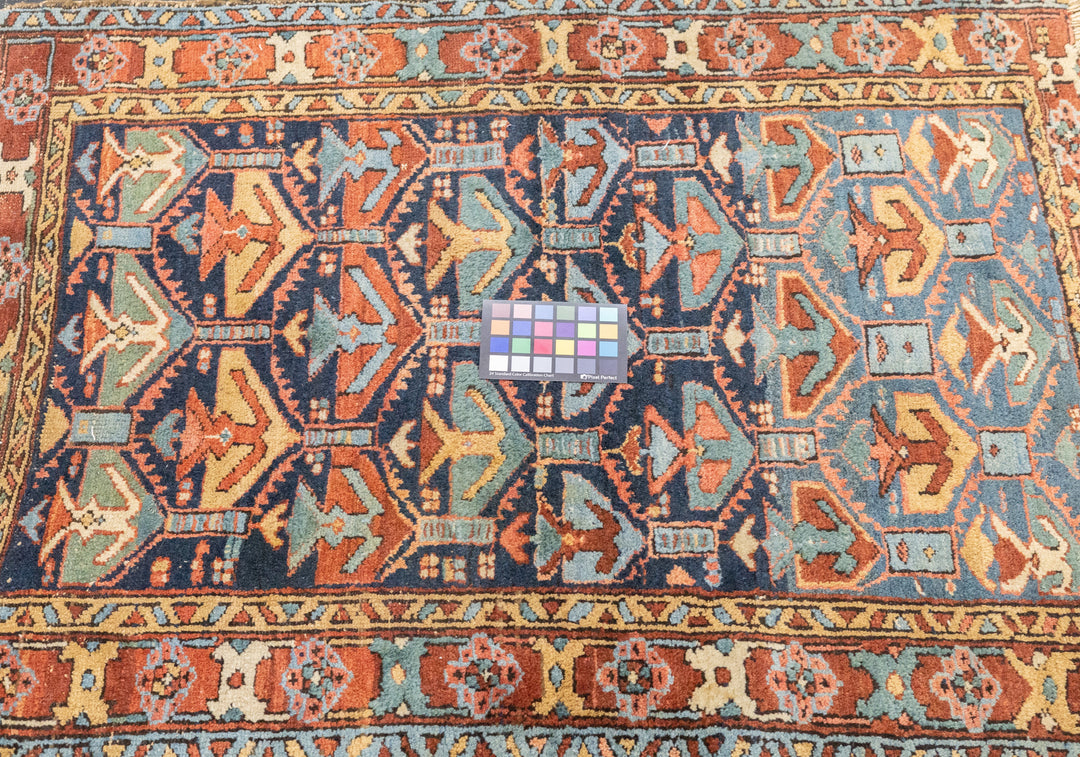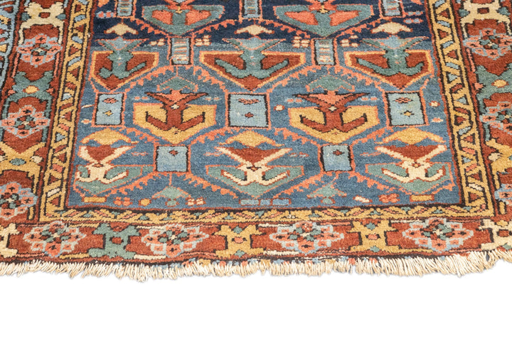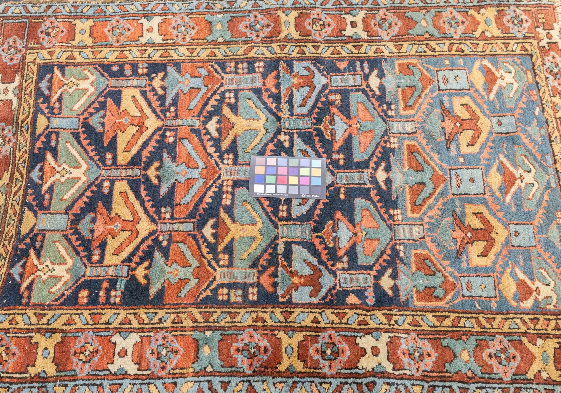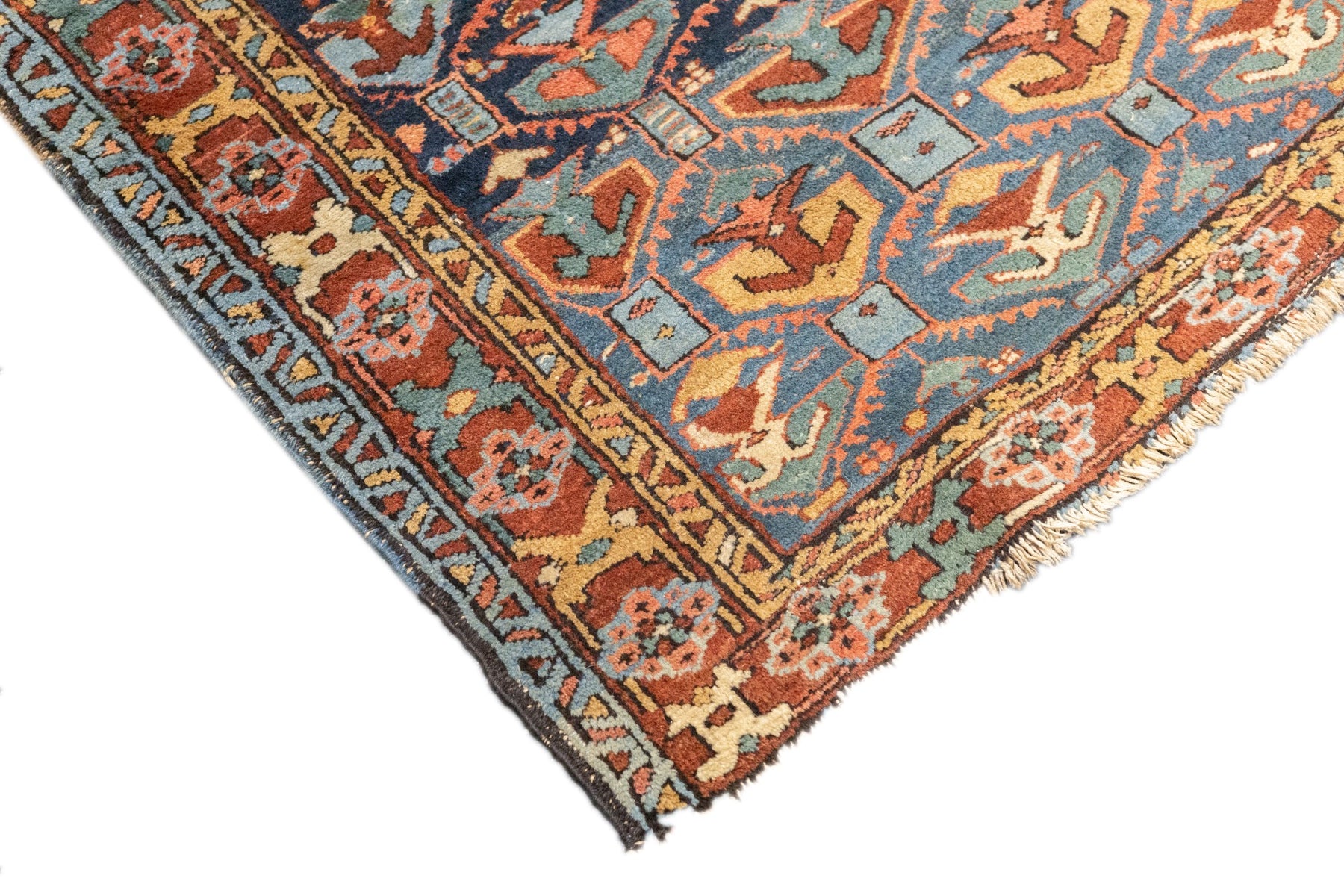 Although in somewhat compromised condition, this charming NW Persian rustic scatter still displays significant artistic quality. The abrashed blue field show a broad hexagonal lattice enclosing stylized flowers. The red border features funky rosettes and armed separator bars, Could be from the Karaja/Karadagh area in Azerbaijan. Moderate weave on cotton.