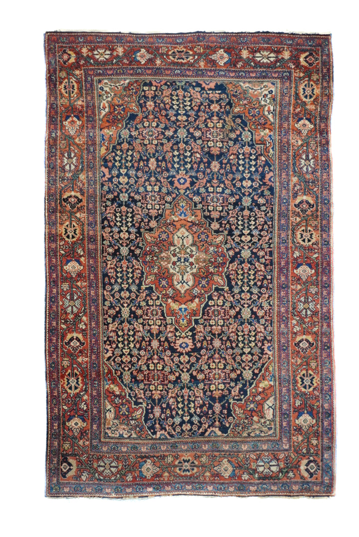 The scatter and room size pieces made in the Arak/Sultanabad area, between 1880 and 1910, with firm and leathery well-woven textures, and strong in red, navy and ecru tones, usually in medallion formats. A transition group between the earlier 19th century Farahans and the post-WWI Sarouks. Drawing is between curvilinear and angular.