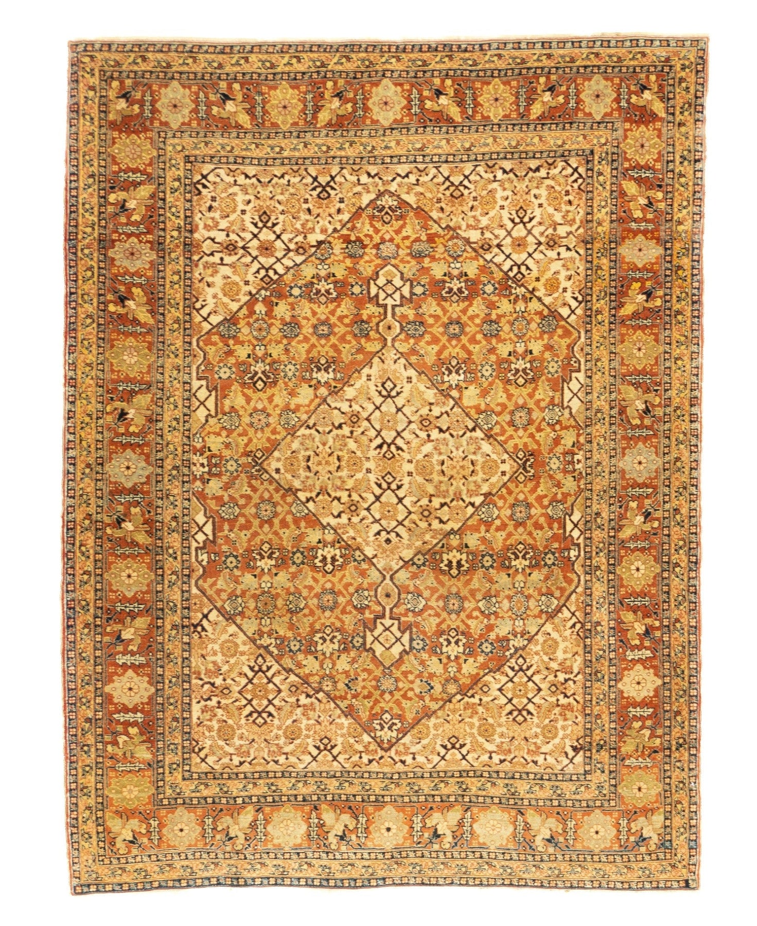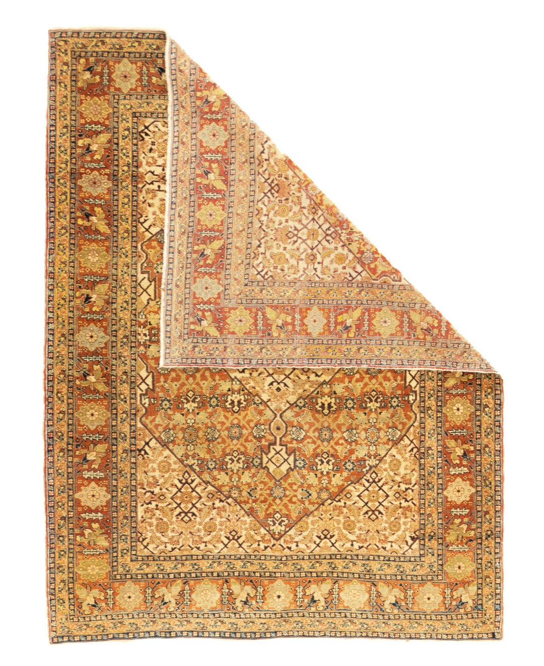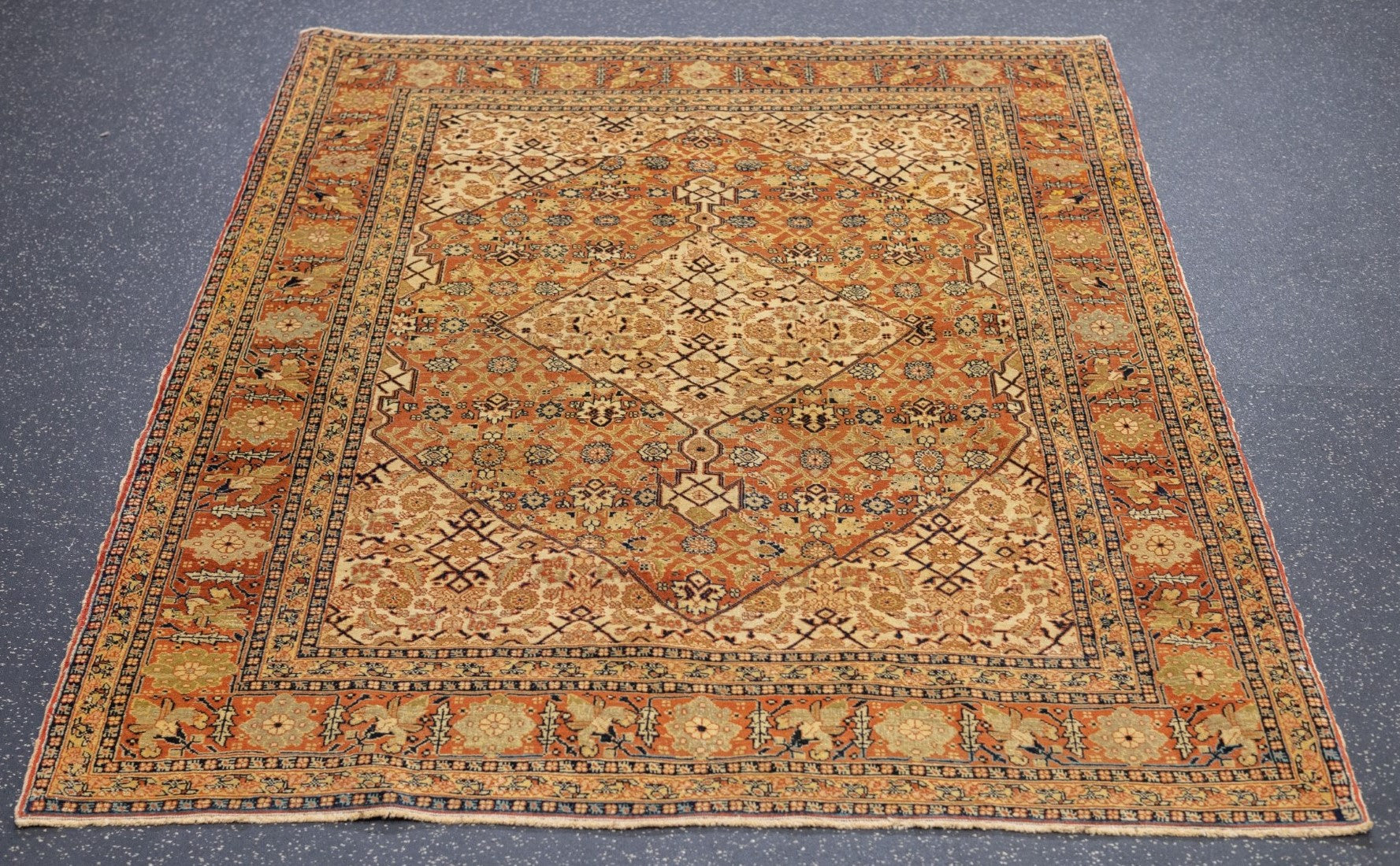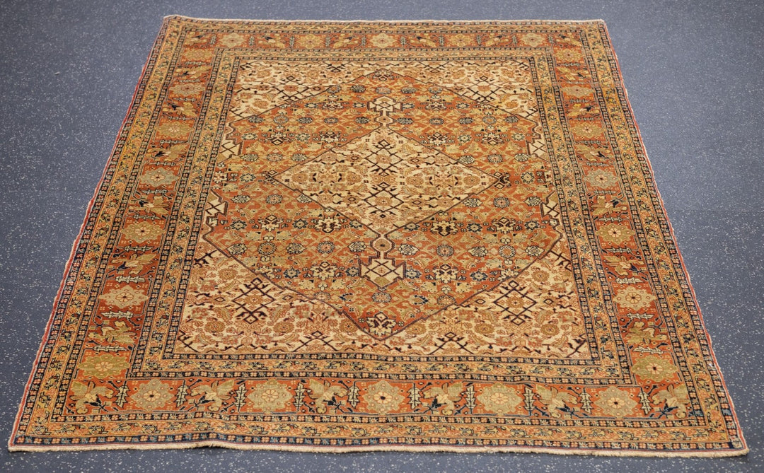 Sand-straw and red, with identically scaled Herati designs, set the palette of this finely woven NW Persian urban scatter. Ecru extended corners and diamond medallion, and red end-pointed field.. Red strip-style Zanbaki border of rosettes, tilted irises and upstanding leaves. Cotton foundation. Short and brushy pile. Good condition.