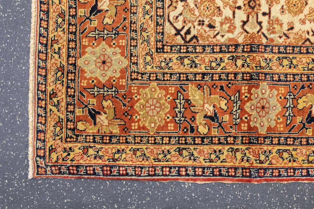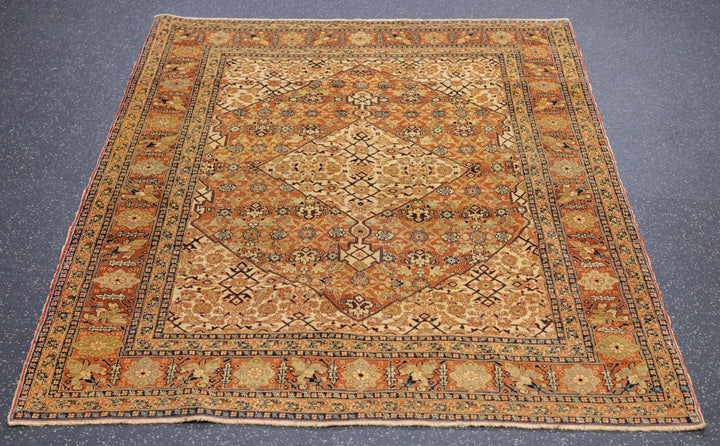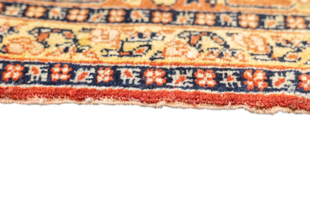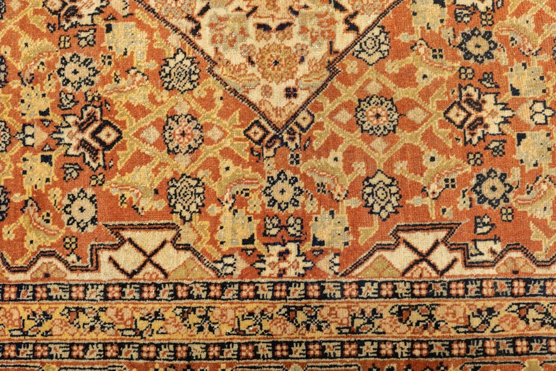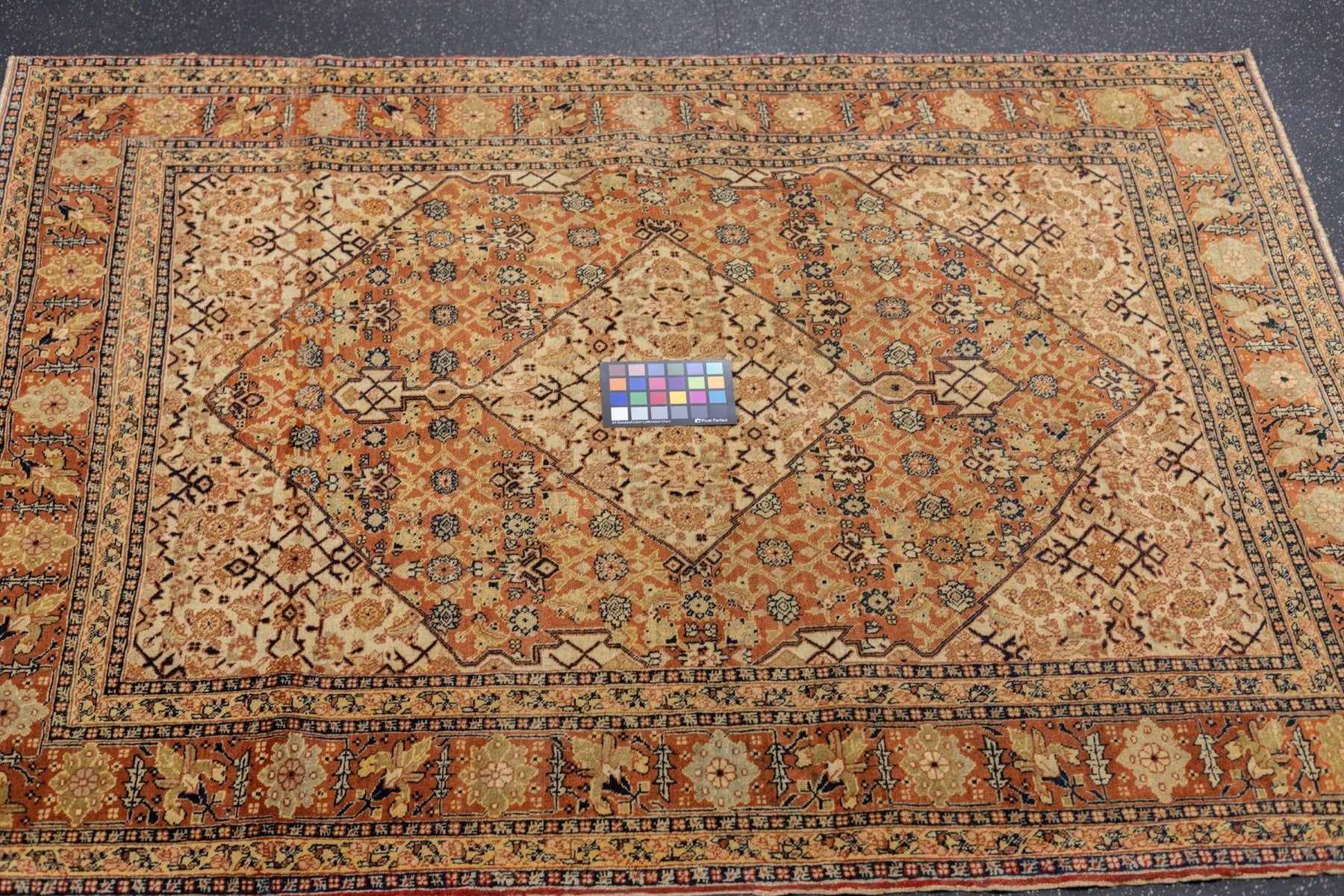 Sand-straw and red, with identically scaled Herati designs, set the palette of this finely woven NW Persian urban scatter. Ecru extended corners and diamond medallion, and red end-pointed field.. Red strip-style Zanbaki border of rosettes, tilted irises and upstanding leaves. Cotton foundation. Short and brushy pile. Good condition.