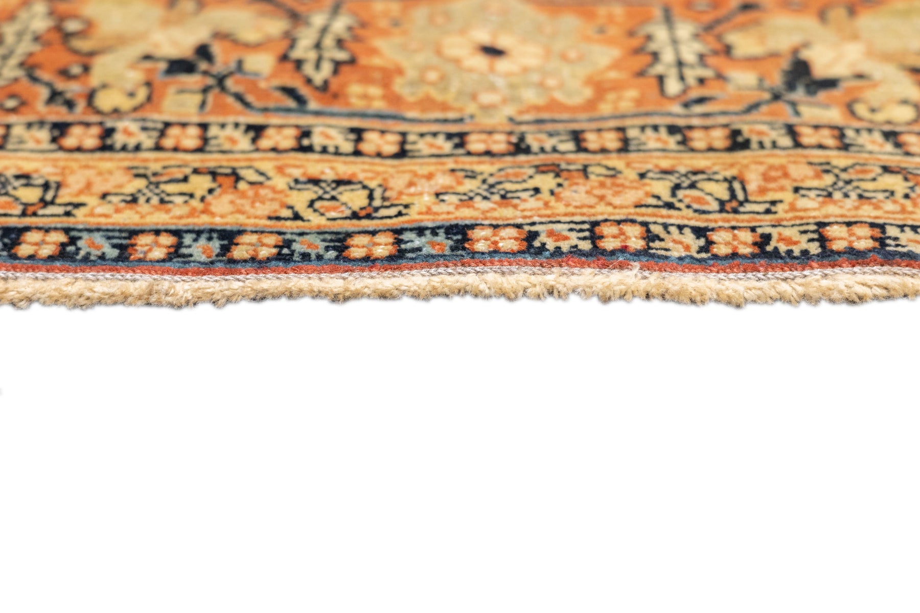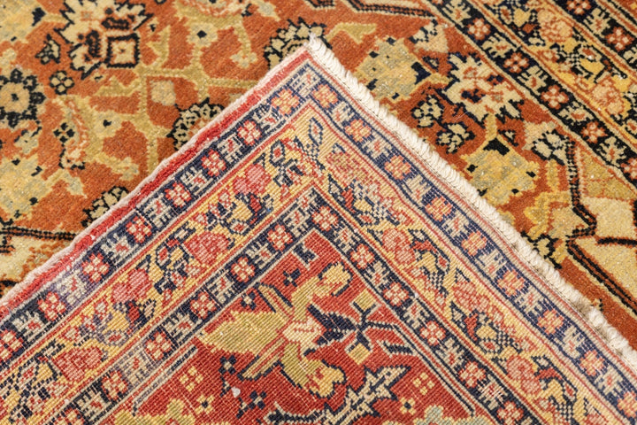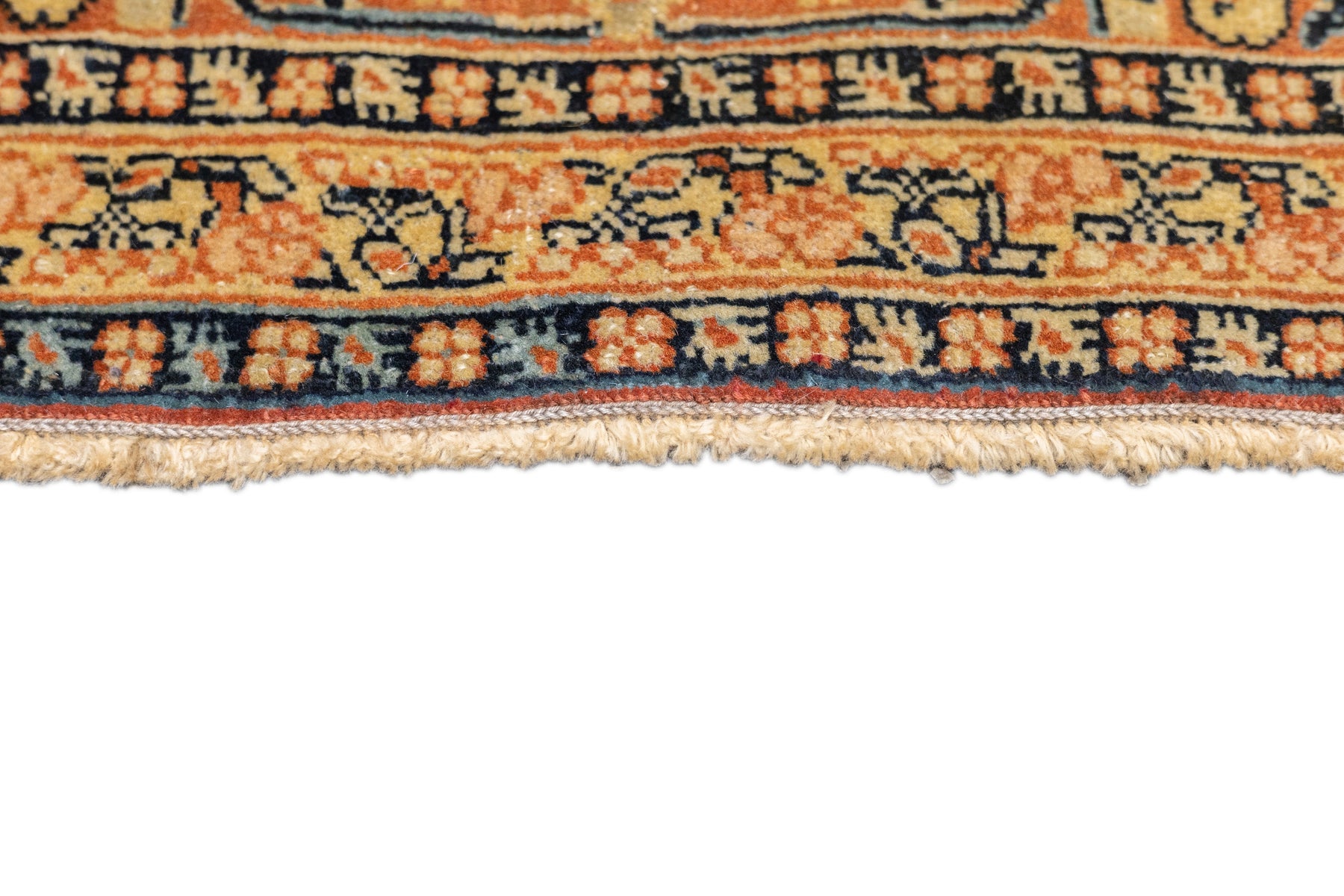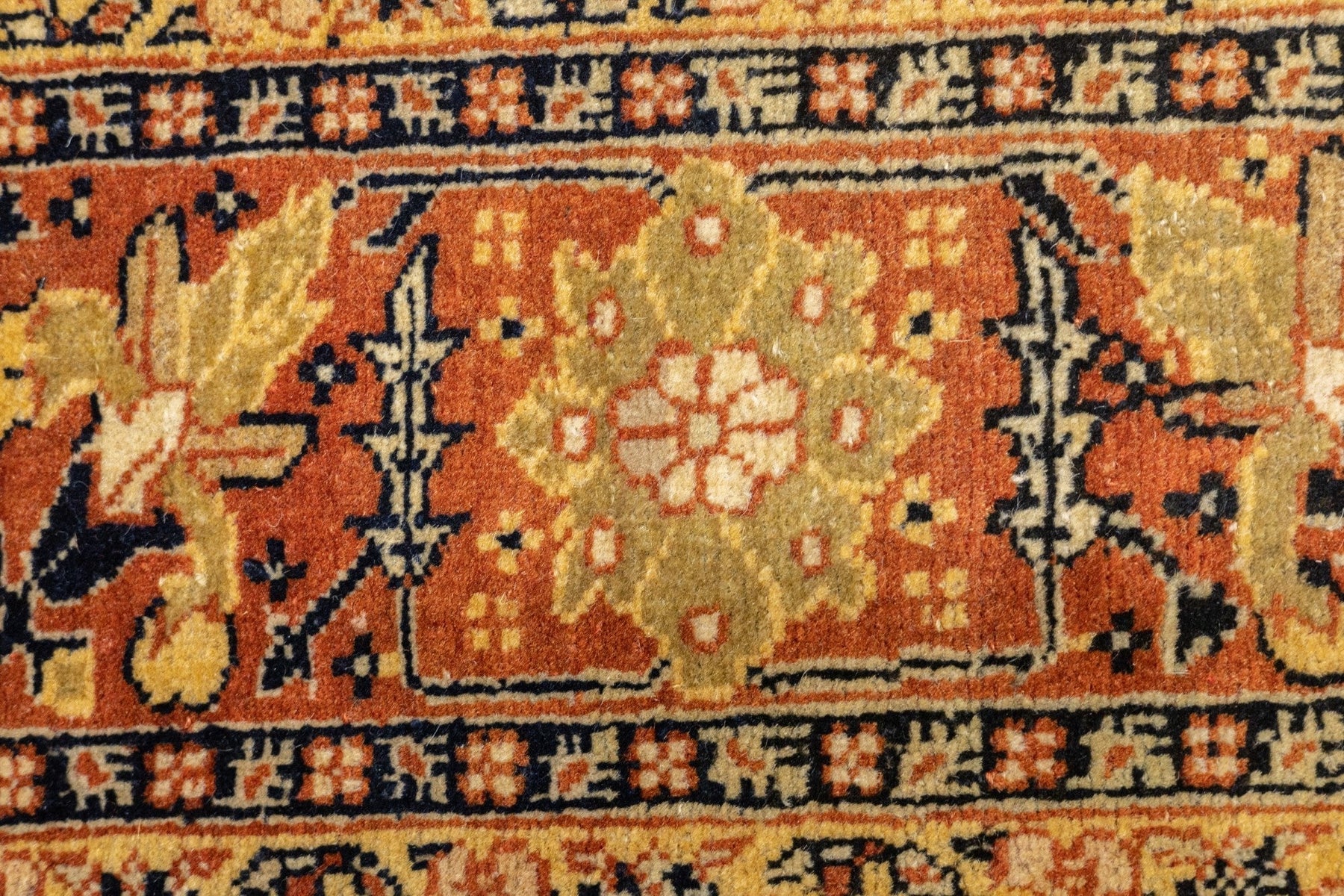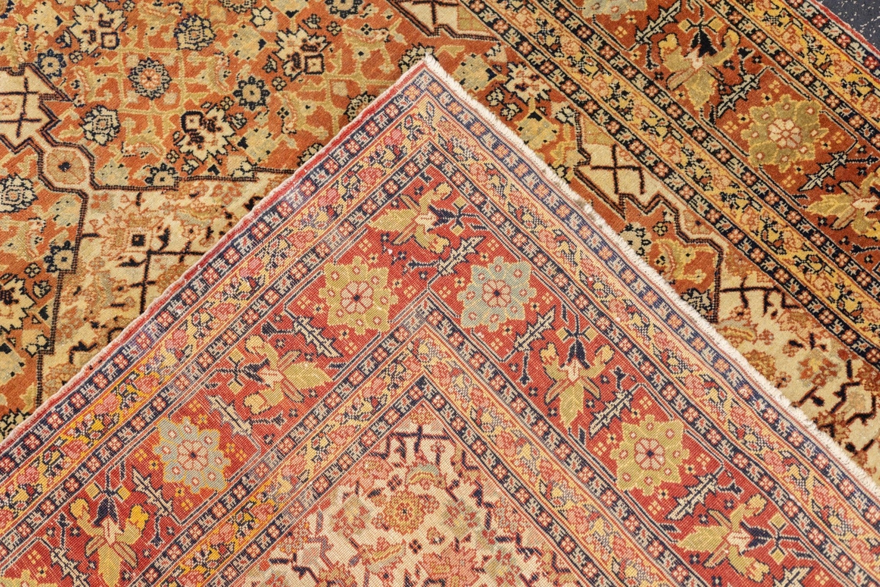 Sand-straw and red, with identically scaled Herati designs, set the palette of this finely woven NW Persian urban scatter. Ecru extended corners and diamond medallion, and red end-pointed field.. Red strip-style Zanbaki border of rosettes, tilted irises and upstanding leaves. Cotton foundation. Short and brushy pile. Good condition.