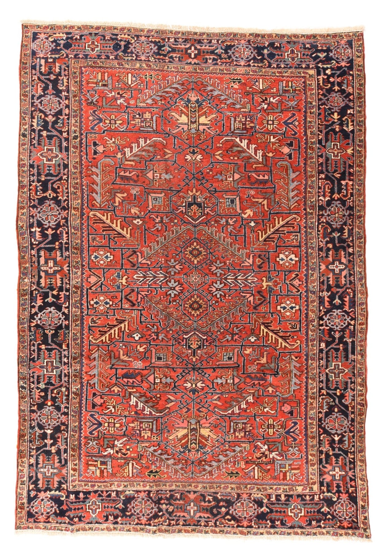 Iconically Mehriban, with a soft red red ground supporting a plethora of fringed and flame-edged bitonal leaves in straw, cream, chocolate, palest blue and light teal blue. An ashik, herringbone leaf and stylized palmette centre organizes the whole. Rare navy border with serrated palmettes and rosettes-in-octagons. Slight end reduction, medium- coarse weave, cotton foundation. Overall good condition.