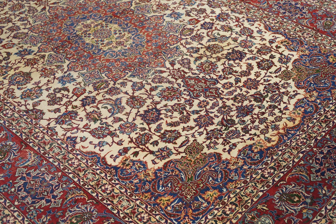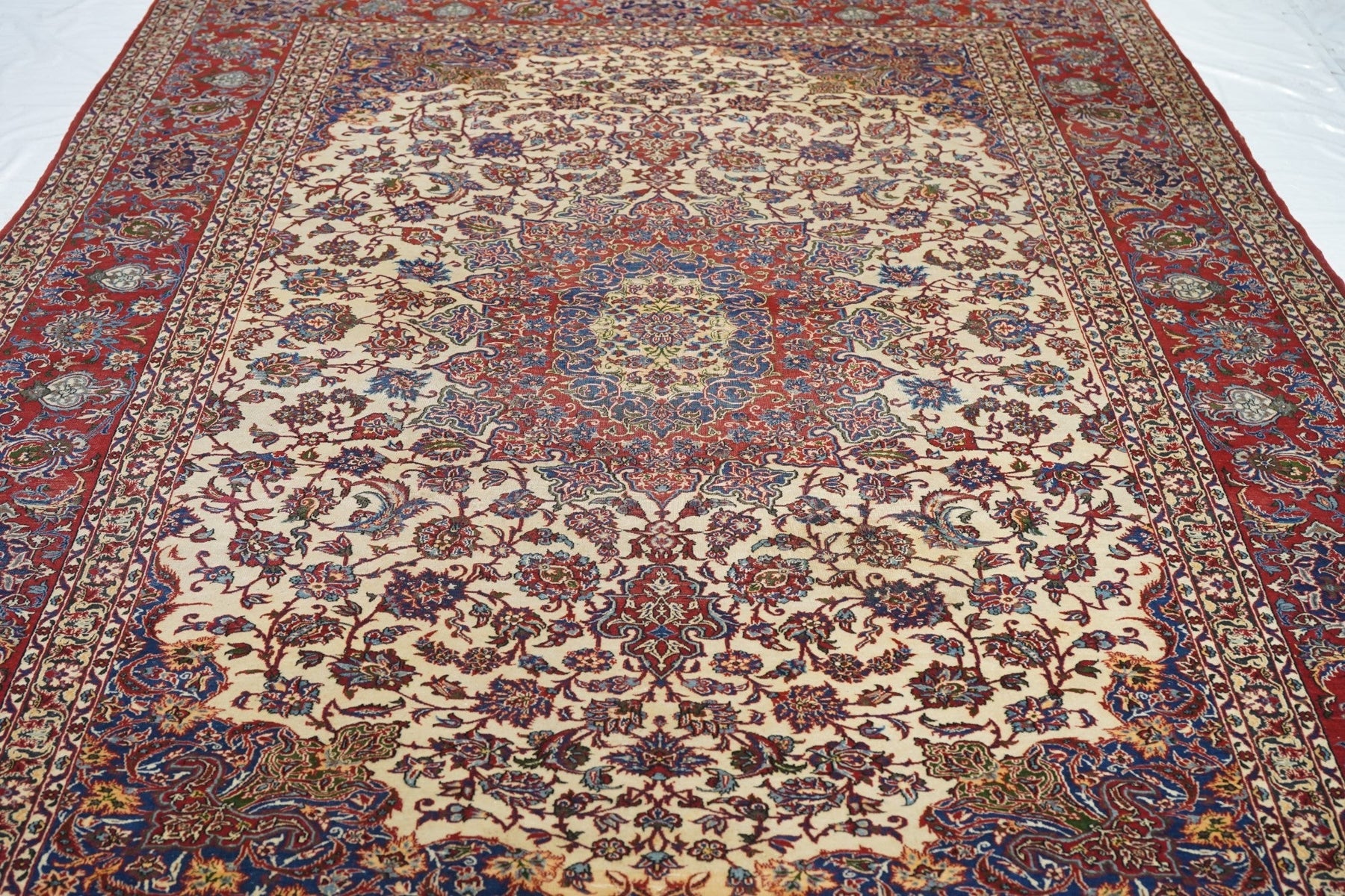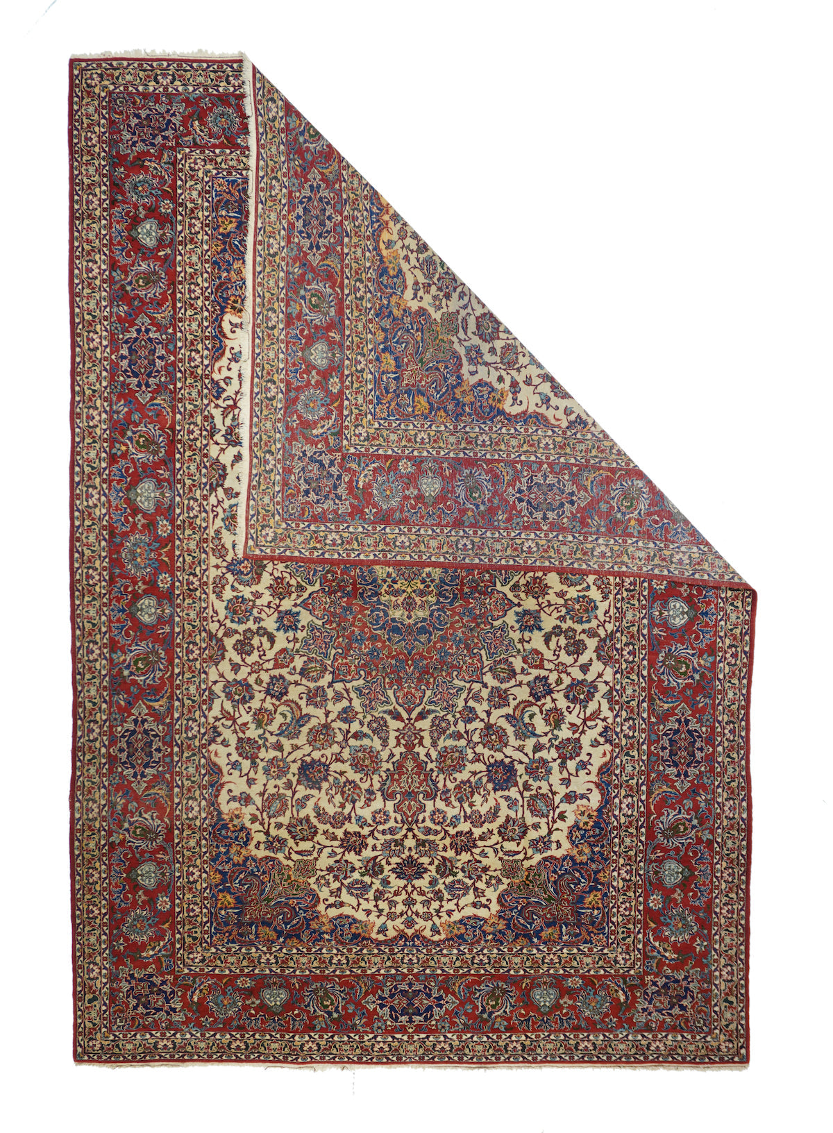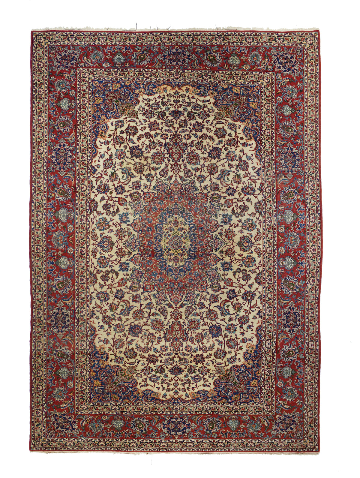 An upright, elliptical 20-point red arabesque medallion employs a straw and navy layered sub-medallion, on the old ivory ground whose complex palmettes diminish toward the implicit oval field ends; a characteristic Isfahan design conceit. Navy arabesque corners. Red main border with cartouches, palmettes and vases. Very fine weave, cotton foundation, short and stiff velvet pile. Good condition.