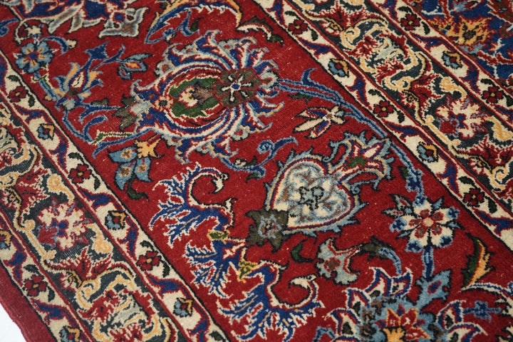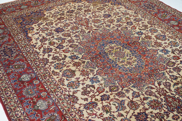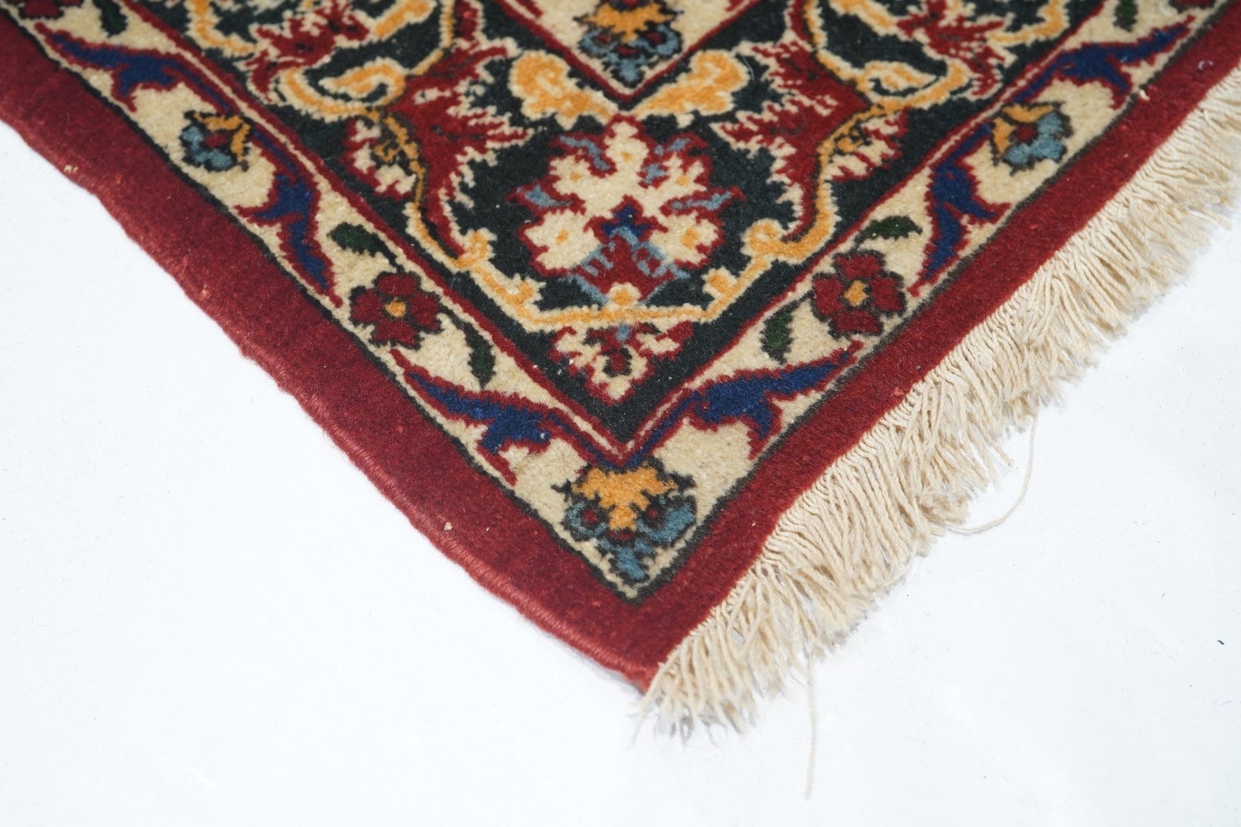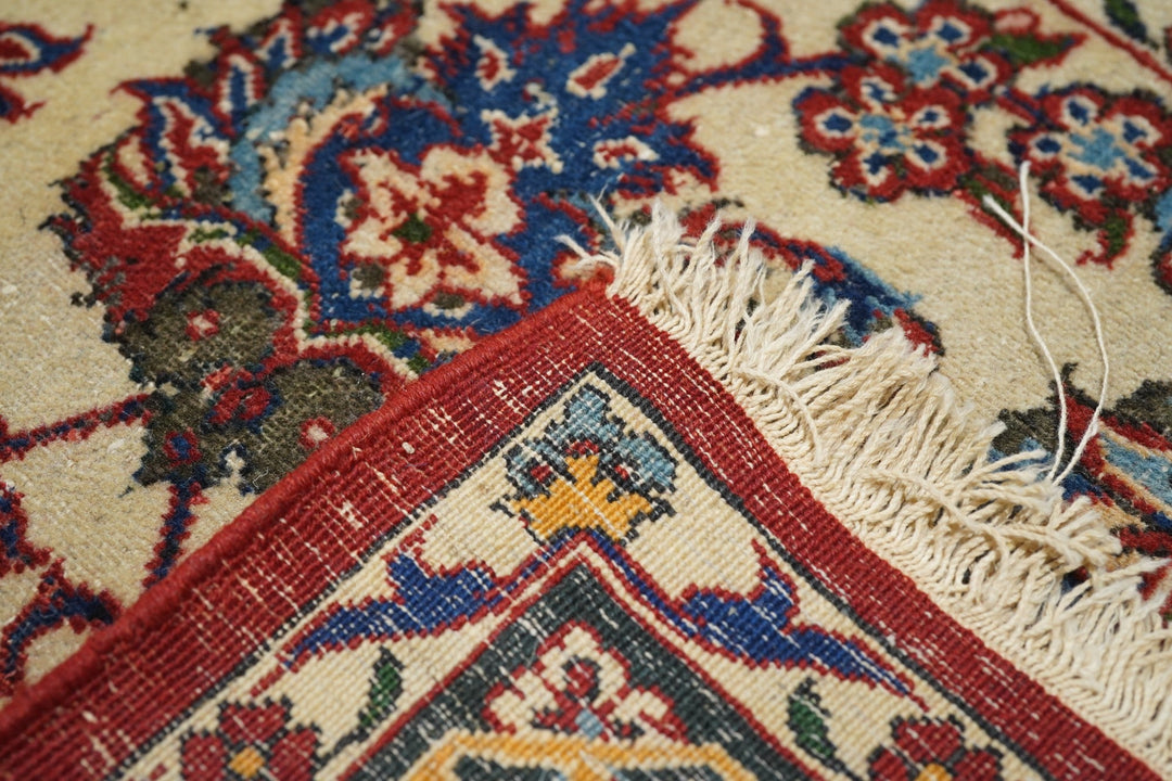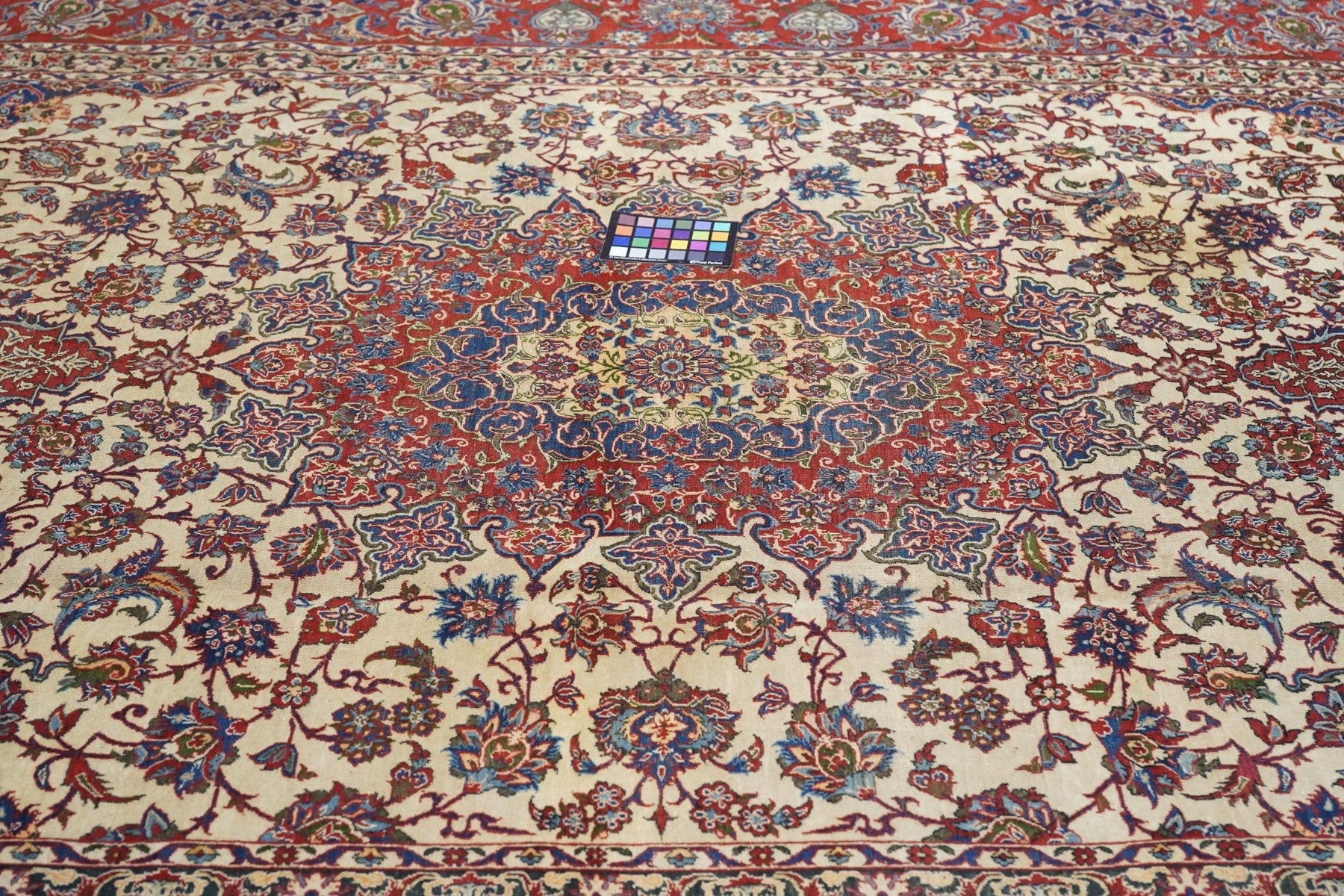 An upright, elliptical 20-point red arabesque medallion employs a straw and navy layered sub-medallion, on the old ivory ground whose complex palmettes diminish toward the implicit oval field ends; a characteristic Isfahan design conceit. Navy arabesque corners. Red main border with cartouches, palmettes and vases. Very fine weave, cotton foundation, short and stiff velvet pile. Good condition.