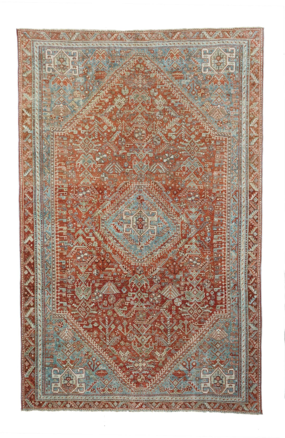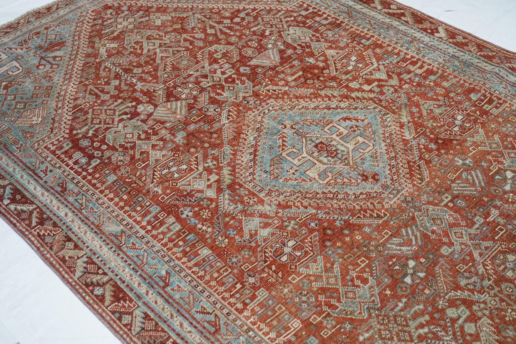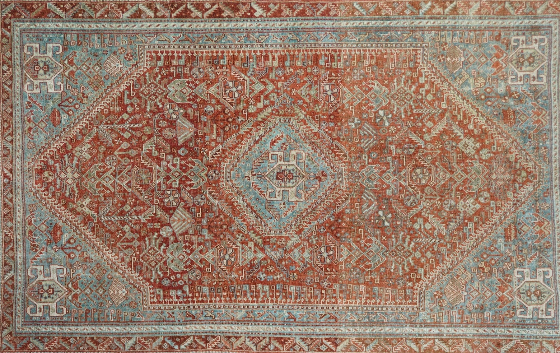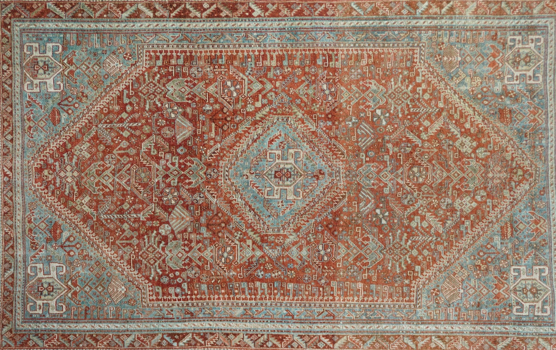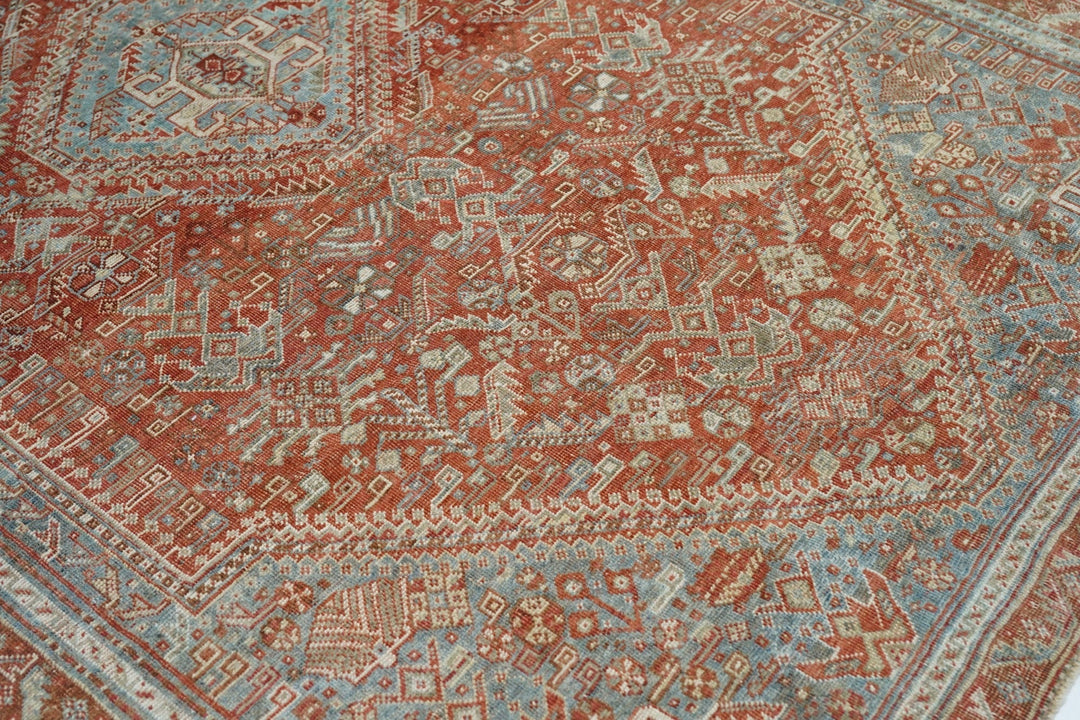 SW Persian, Fars Province, tribal large scatter with a light greyish-blue field supporting a red hexagonal subfield with an internal nail-head fringe. Qashghai "guls" figure in both the pale blue-grey layered central medallion and in the field corners. Everywhere a dense fill of rosettes, serrated stiff leaves, arrowhead chains and other geometric elements. Narrow red outer border of slanted, serrated leaves. Wool foundation, medium weave. Good condition.