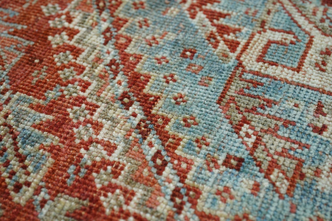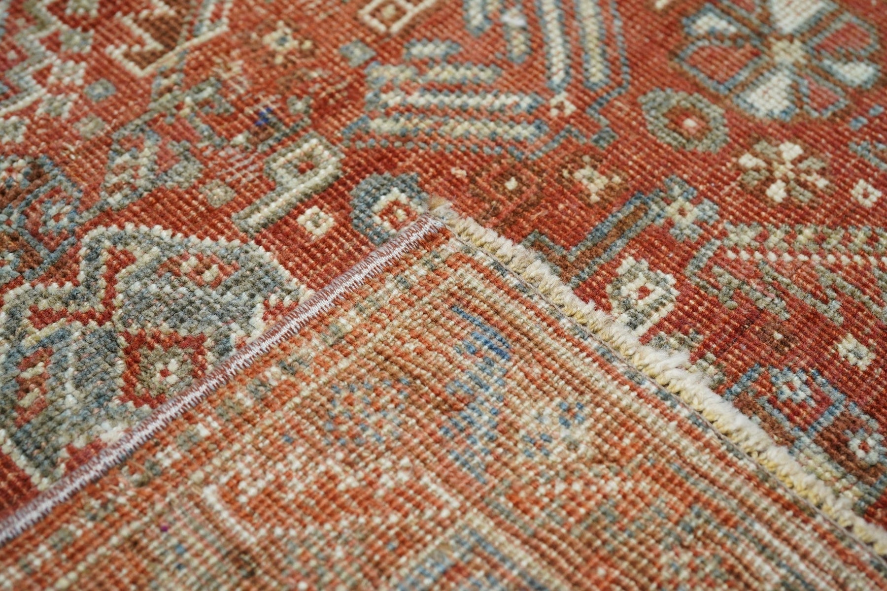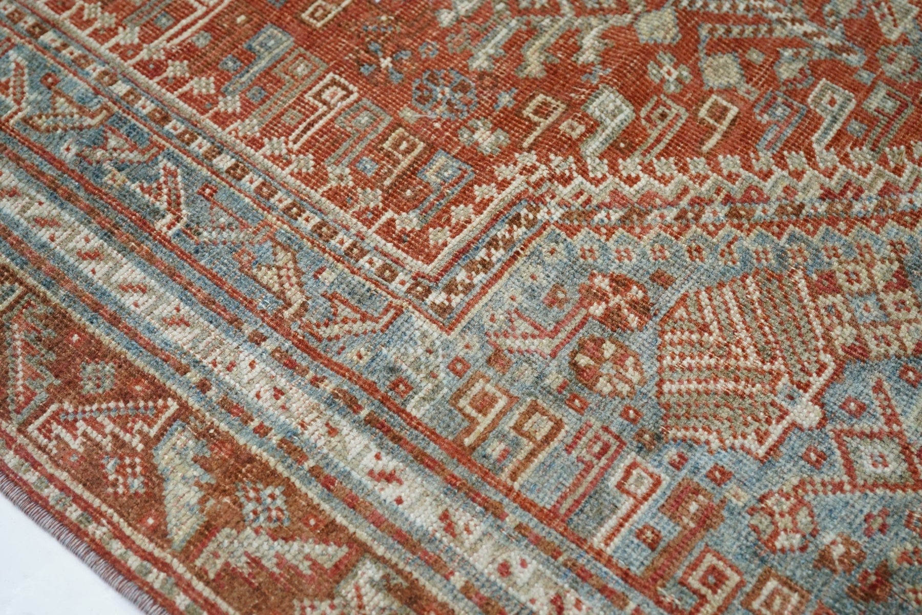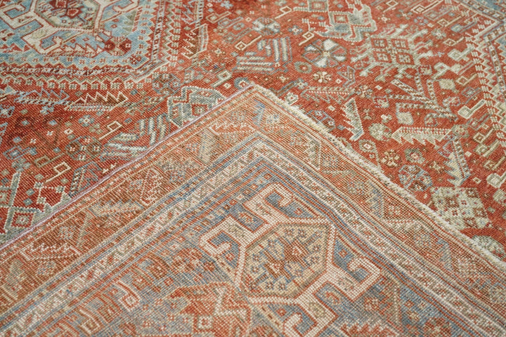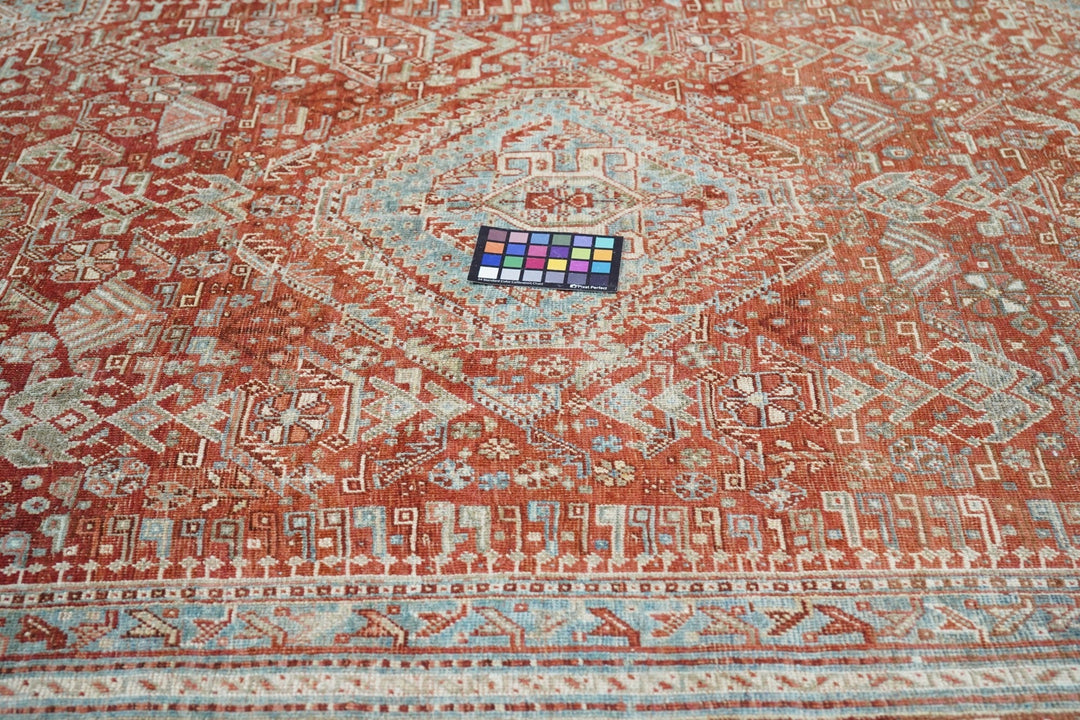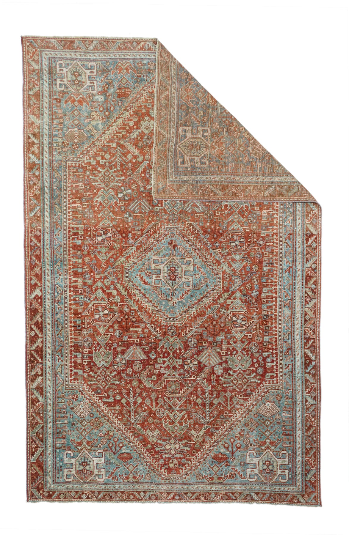 SW Persian, Fars Province, tribal large scatter with a light greyish-blue field supporting a red hexagonal subfield with an internal nail-head fringe. Qashghai "guls" figure in both the pale blue-grey layered central medallion and in the field corners. Everywhere a dense fill of rosettes, serrated stiff leaves, arrowhead chains and other geometric elements. Narrow red outer border of slanted, serrated leaves. Wool foundation, medium weave. Good condition.
