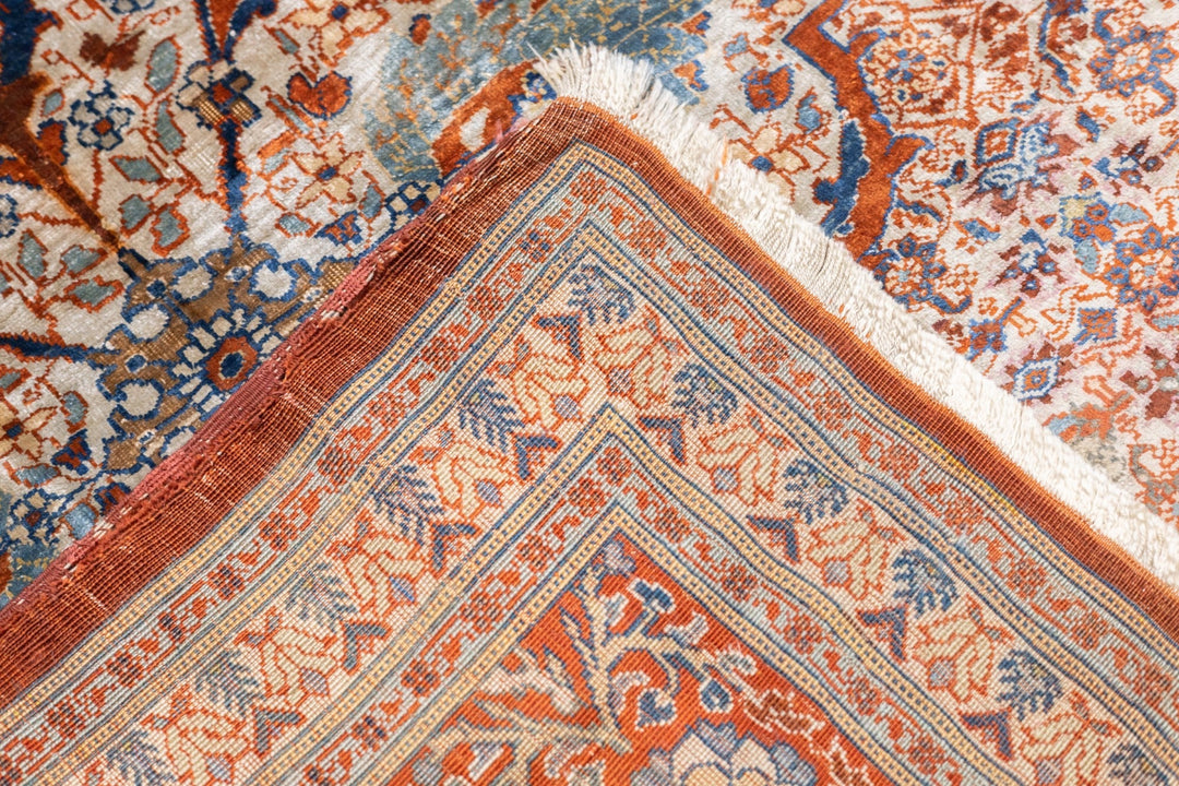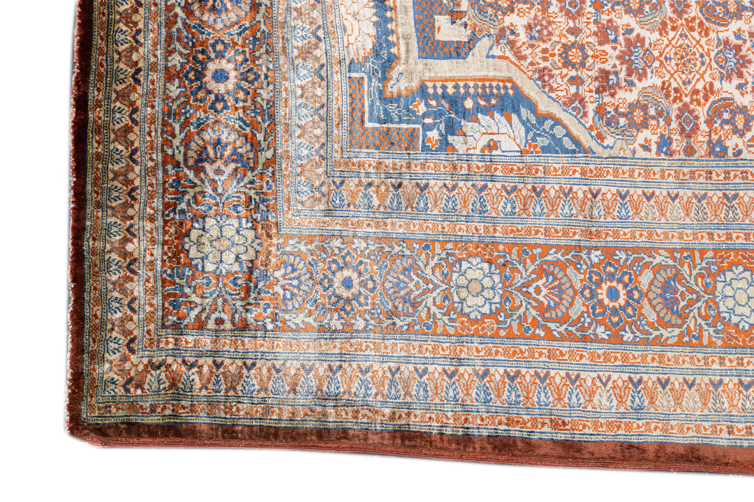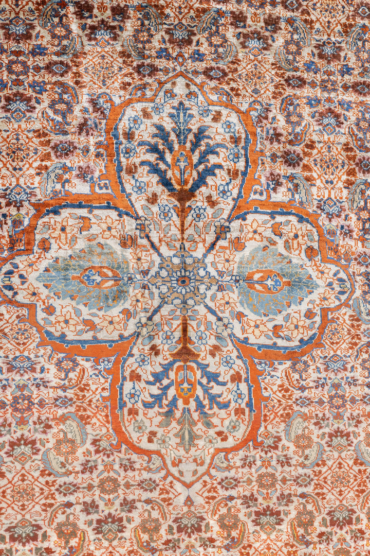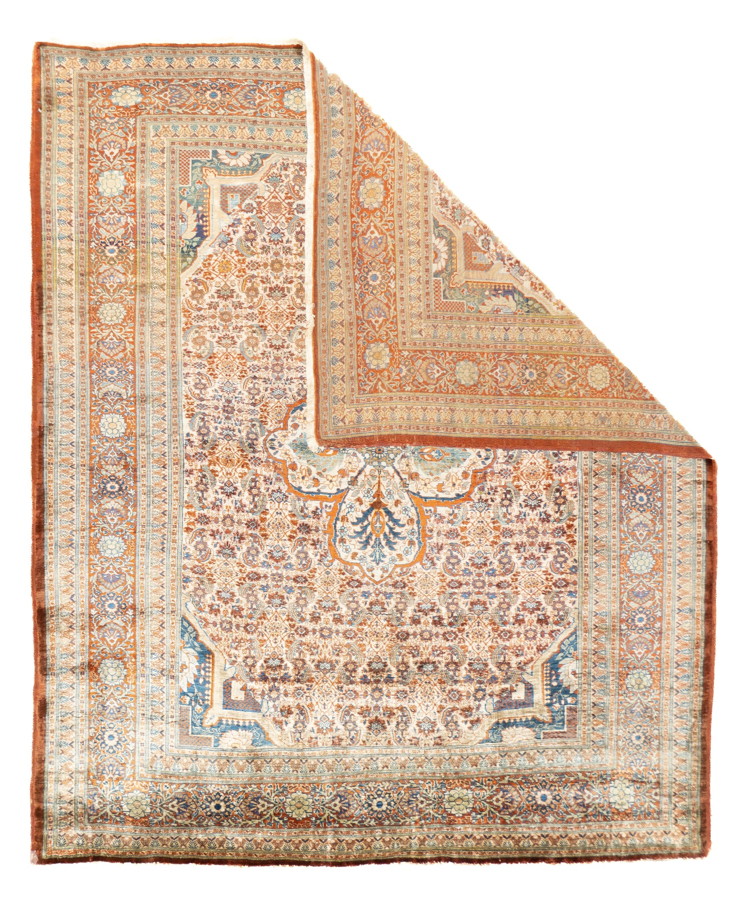 This very finely woven rustic silk pile scatter shows a strong four-fold ecru radiating palmette medallion against a pale straw Herati pattern Denim blue quarter medallion corners. Red main border with rosettes and profile palmettes. An attractive example of the best rustic silks of the 1870-90 period. Good condition.