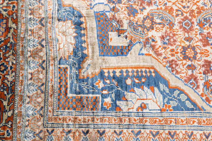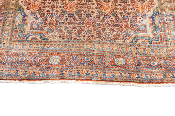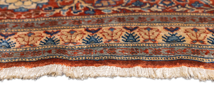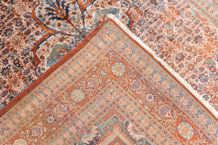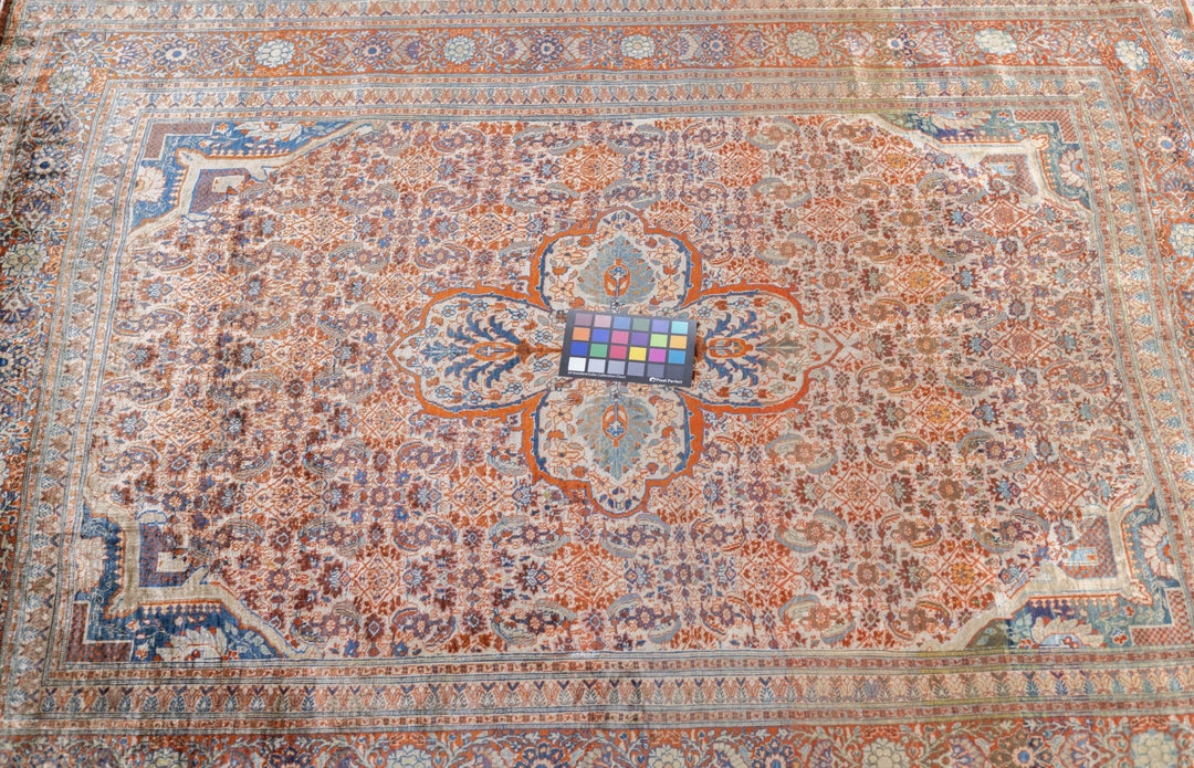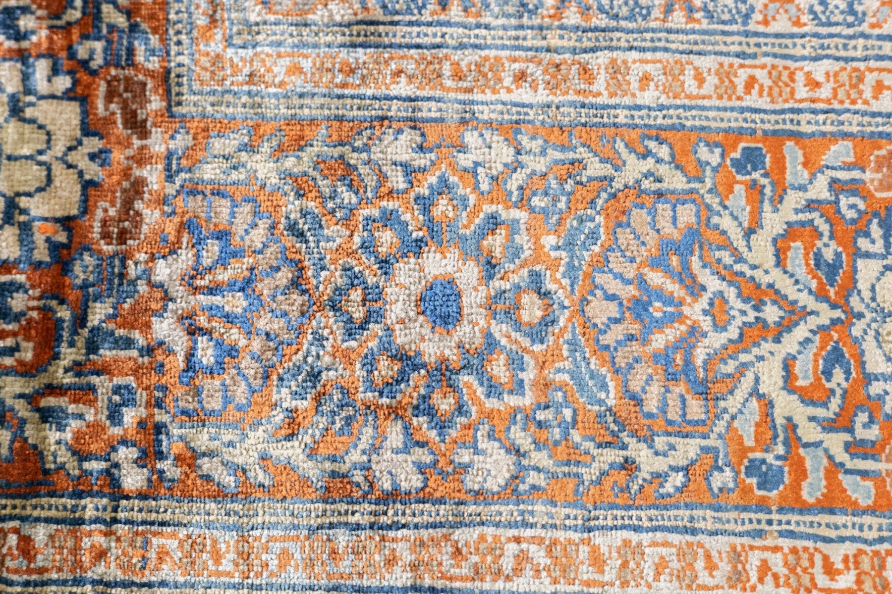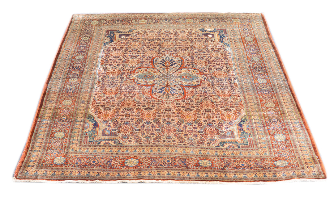 This very finely woven rustic silk pile scatter shows a strong four-fold ecru radiating palmette medallion against a pale straw Herati pattern Denim blue quarter medallion corners. Red main border with rosettes and profile palmettes. An attractive example of the best rustic silks of the 1870-90 period. Good condition.