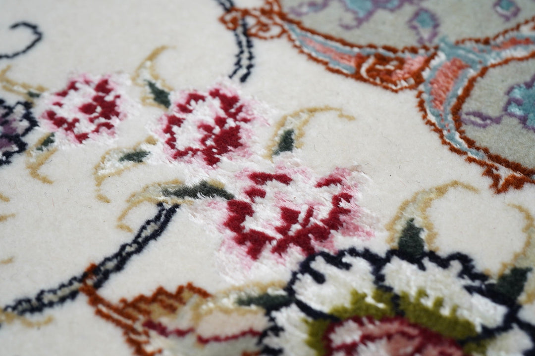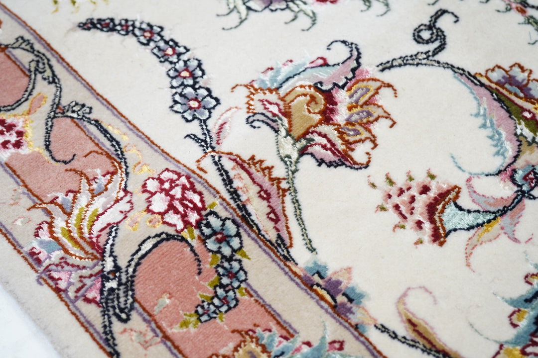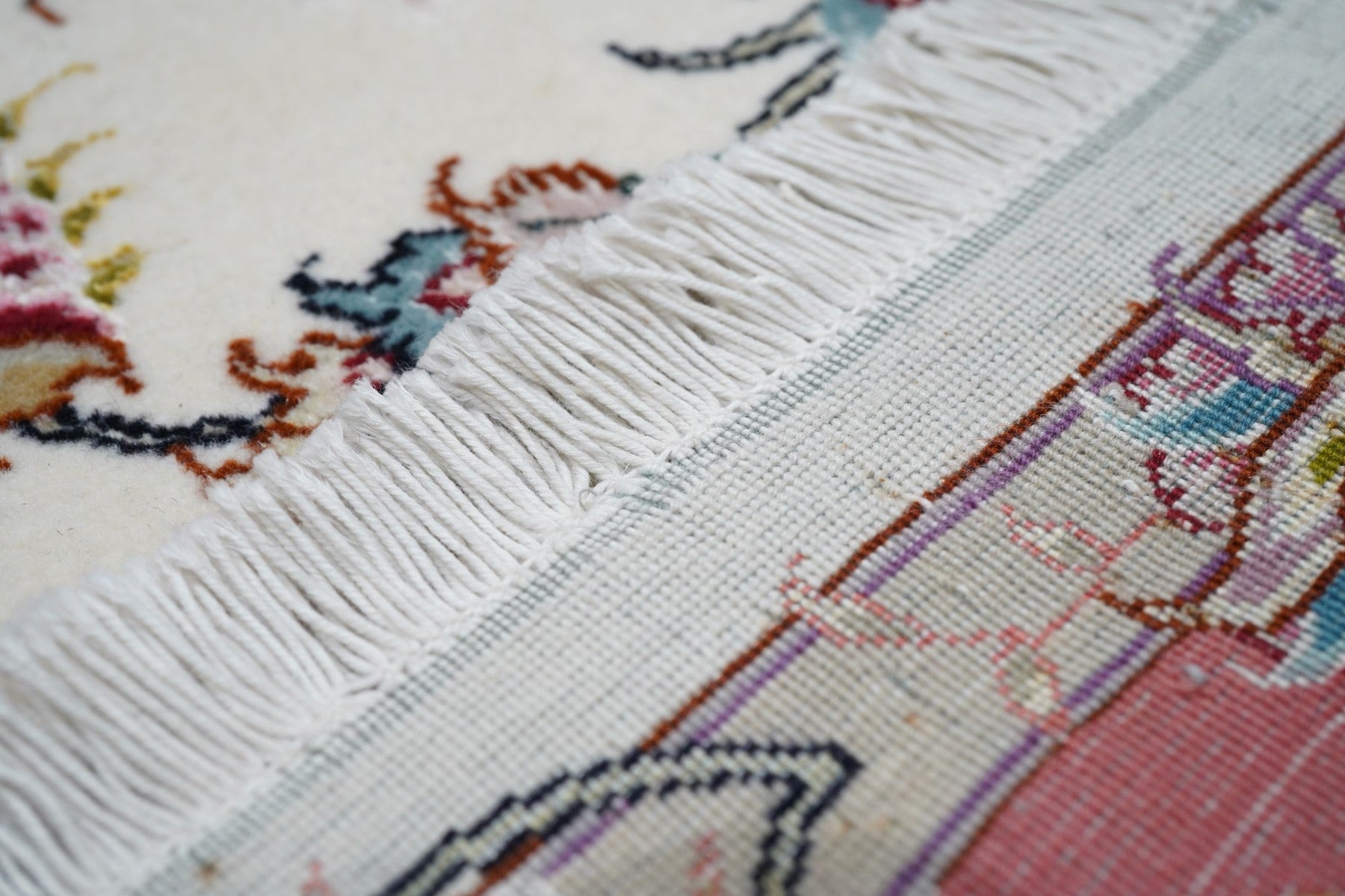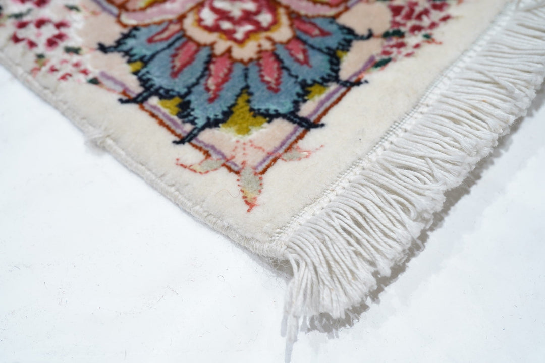 The wool pile is accented in silk. The off white field shows a small octilobe medallion organizing racemes, palmettes, coiling vinery and openwork palmettes. Beige broken border with racemes and palmettes. Cotton foundation, finely woven. Good condition. Short and crisp pile.