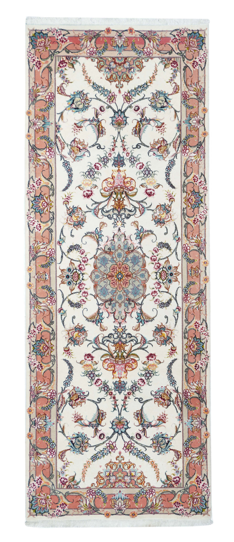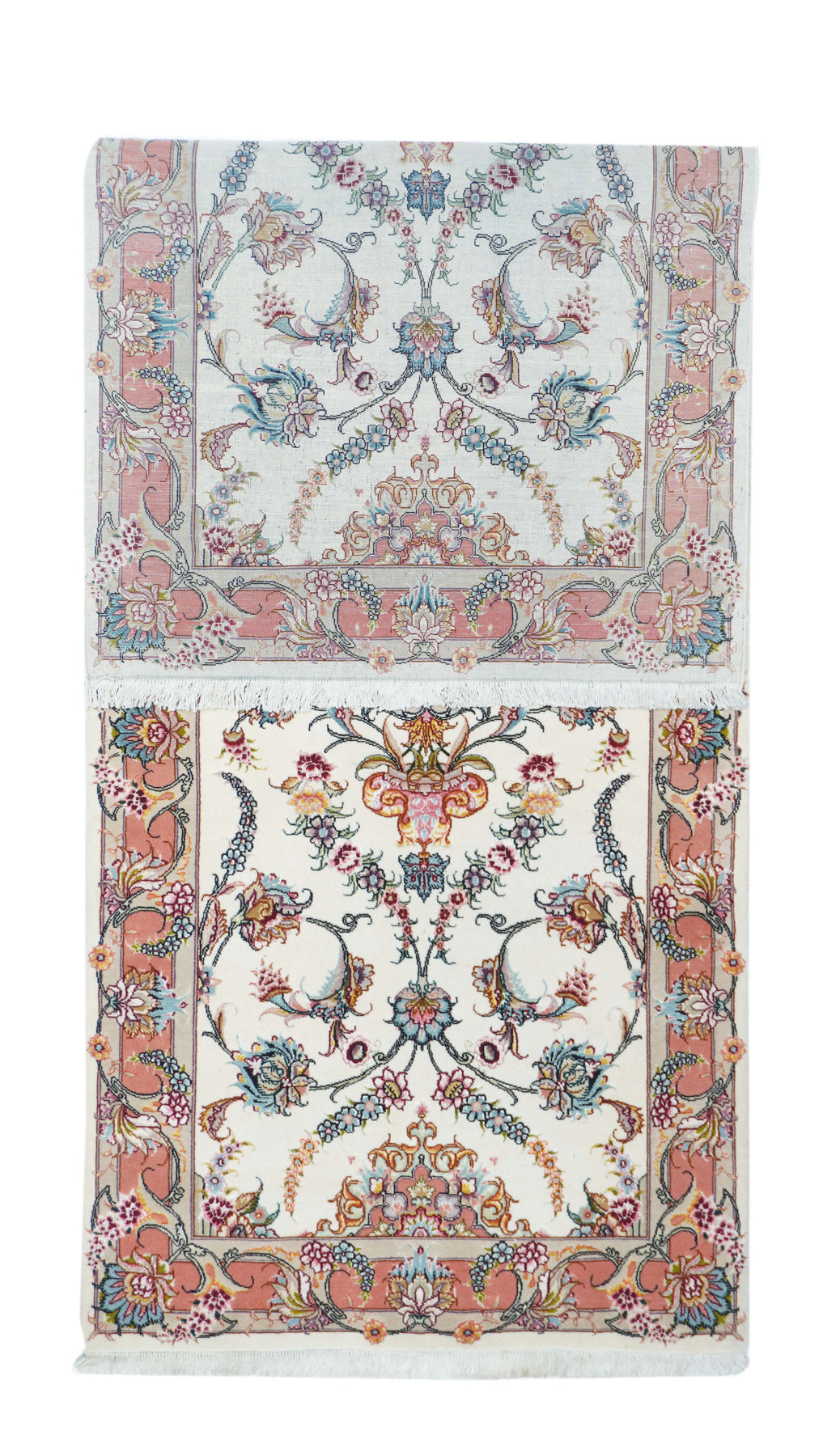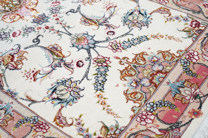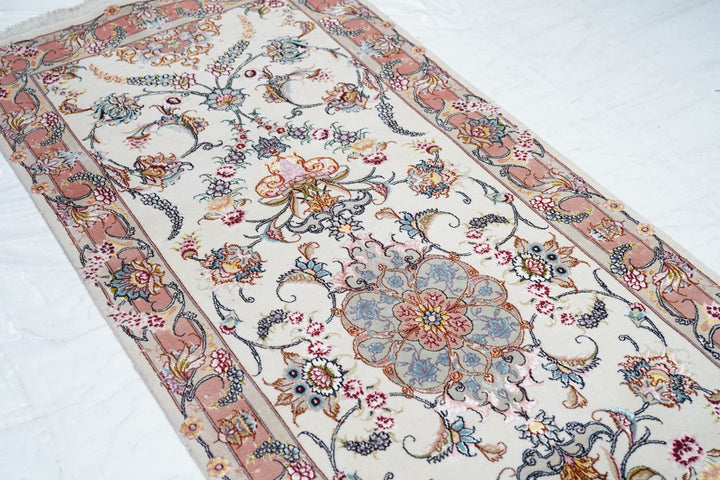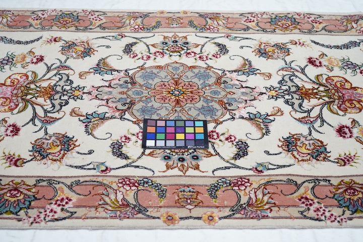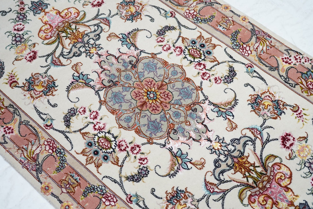 The wool pile is accented in silk. The off white field shows a small octilobe medallion organizing racemes, palmettes, coiling vinery and openwork palmettes. Beige broken border with racemes and palmettes. Cotton foundation, finely woven. Good condition. Short and crisp pile.