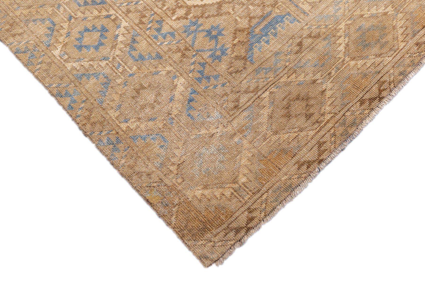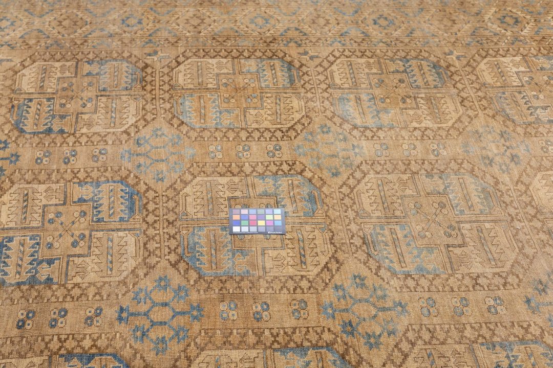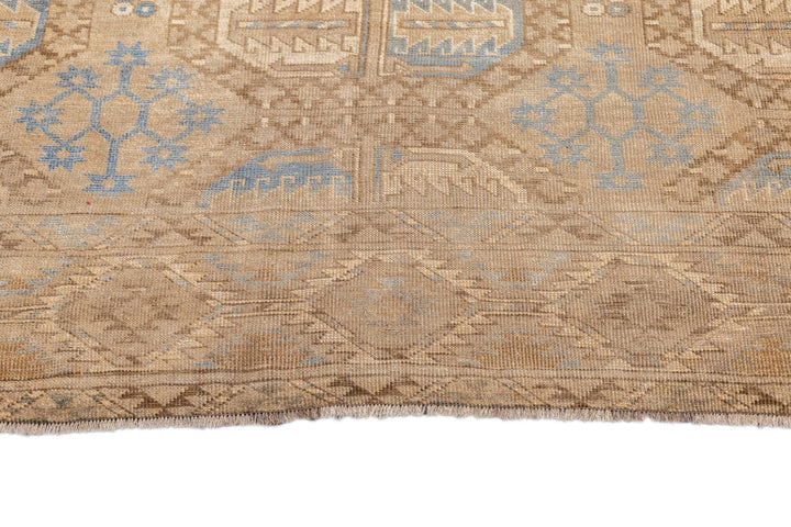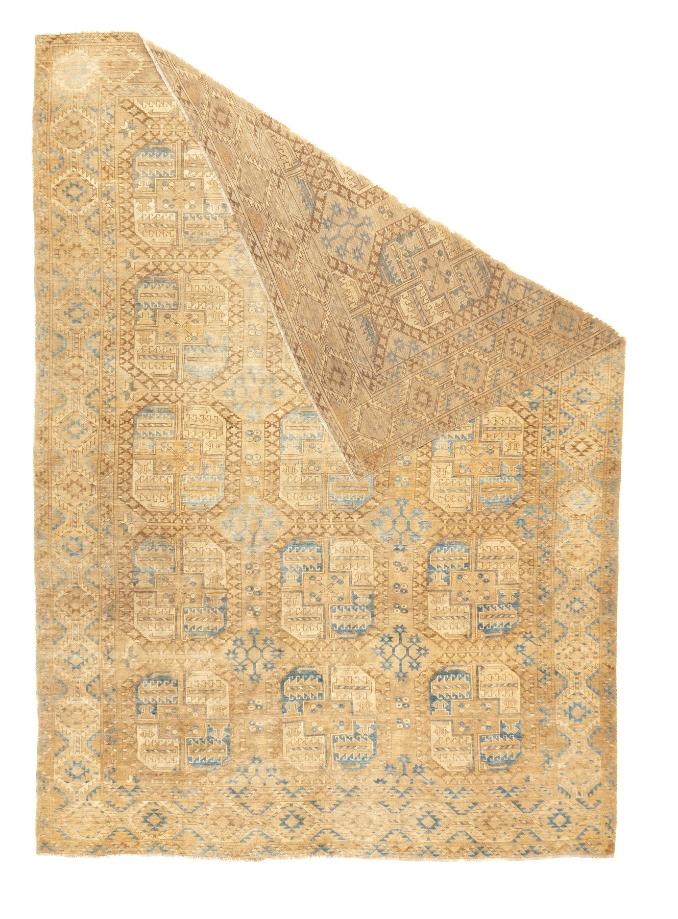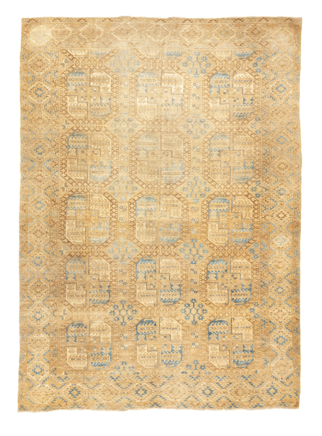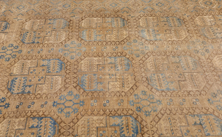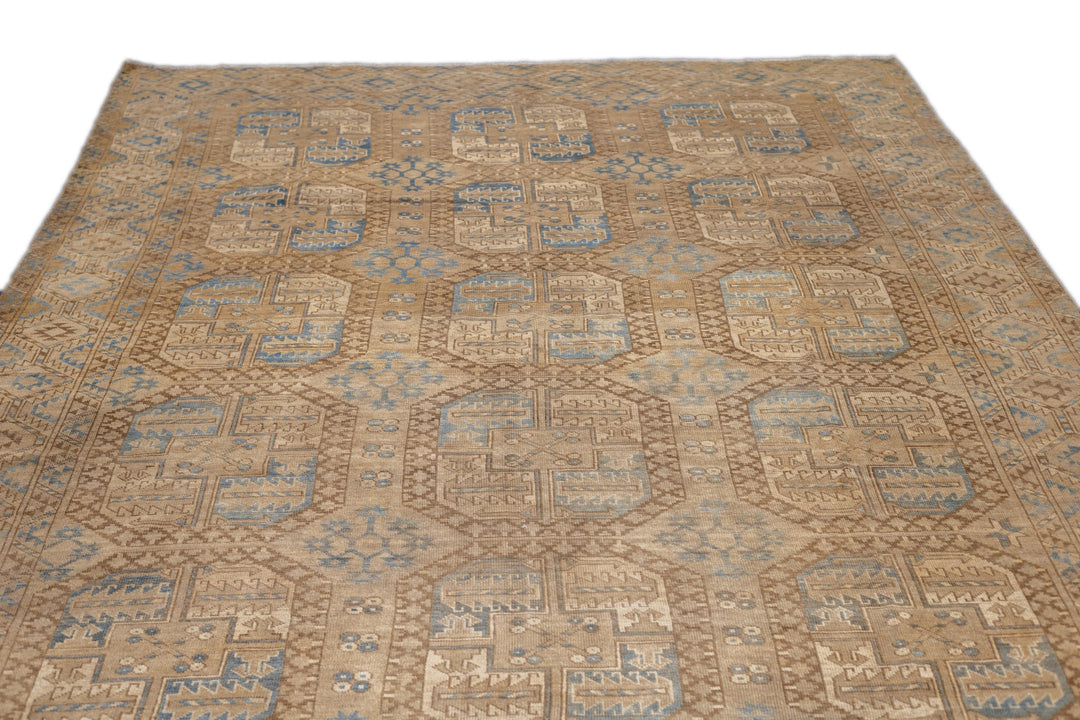 This rug features a three by five layout of beveled octagonal tribal guls, with stellar lattice "sagdak" minor guls between. Details in light blue. General tan and brown palette. Beige border of ashiks. All wool construction. Coarse weave. Good condition.