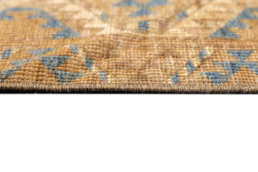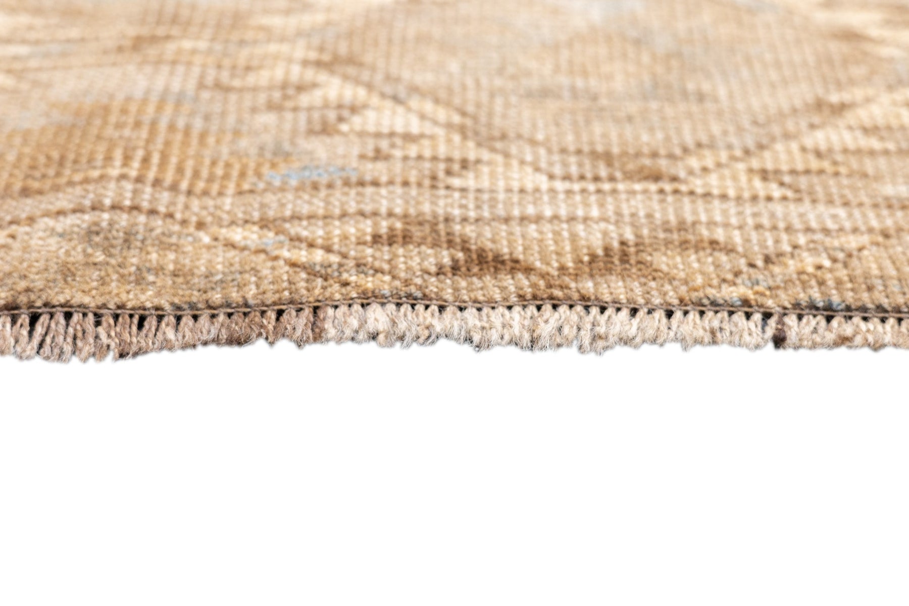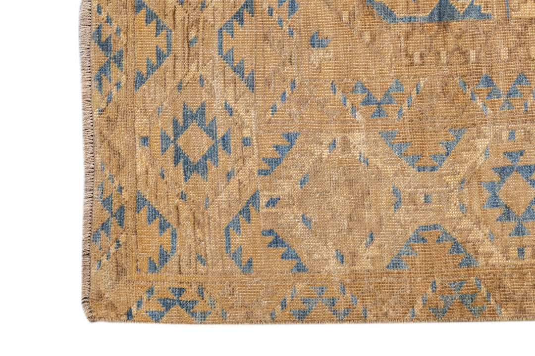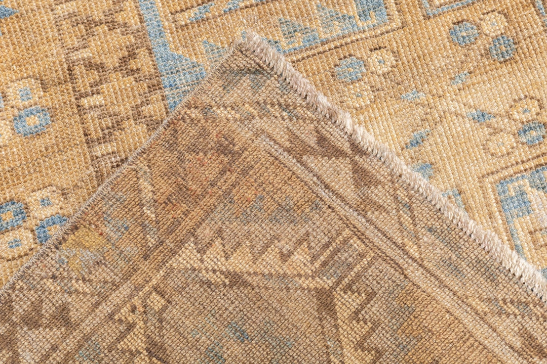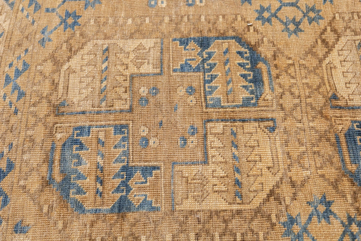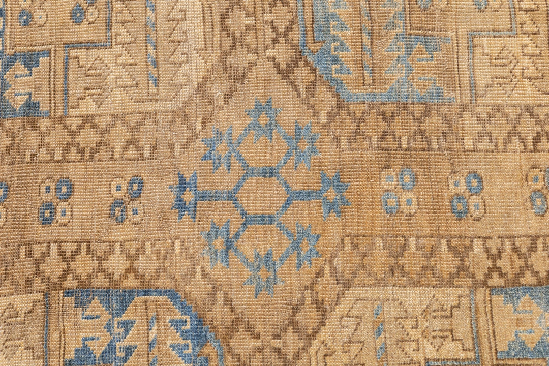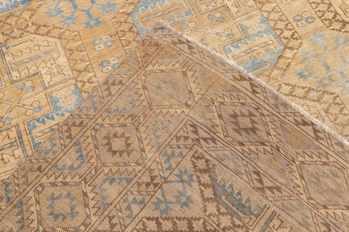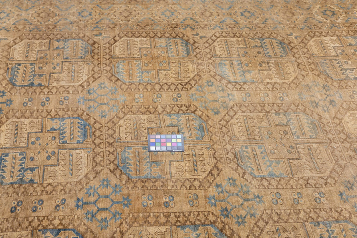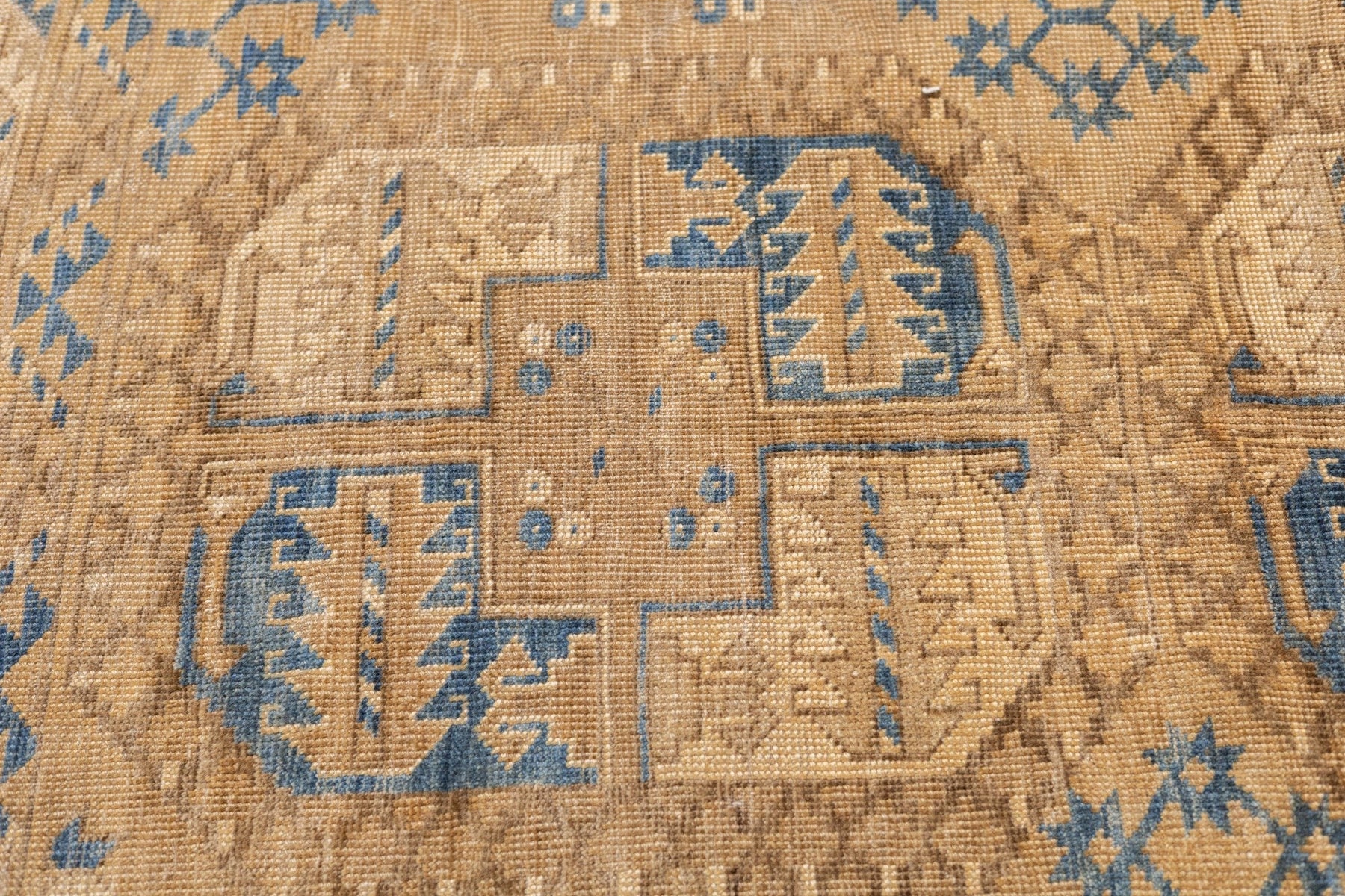 This rug features a three by five layout of beveled octagonal tribal guls, with stellar lattice "sagdak" minor guls between. Details in light blue. General tan and brown palette. Beige border of ashiks. All wool construction. Coarse weave. Good condition.