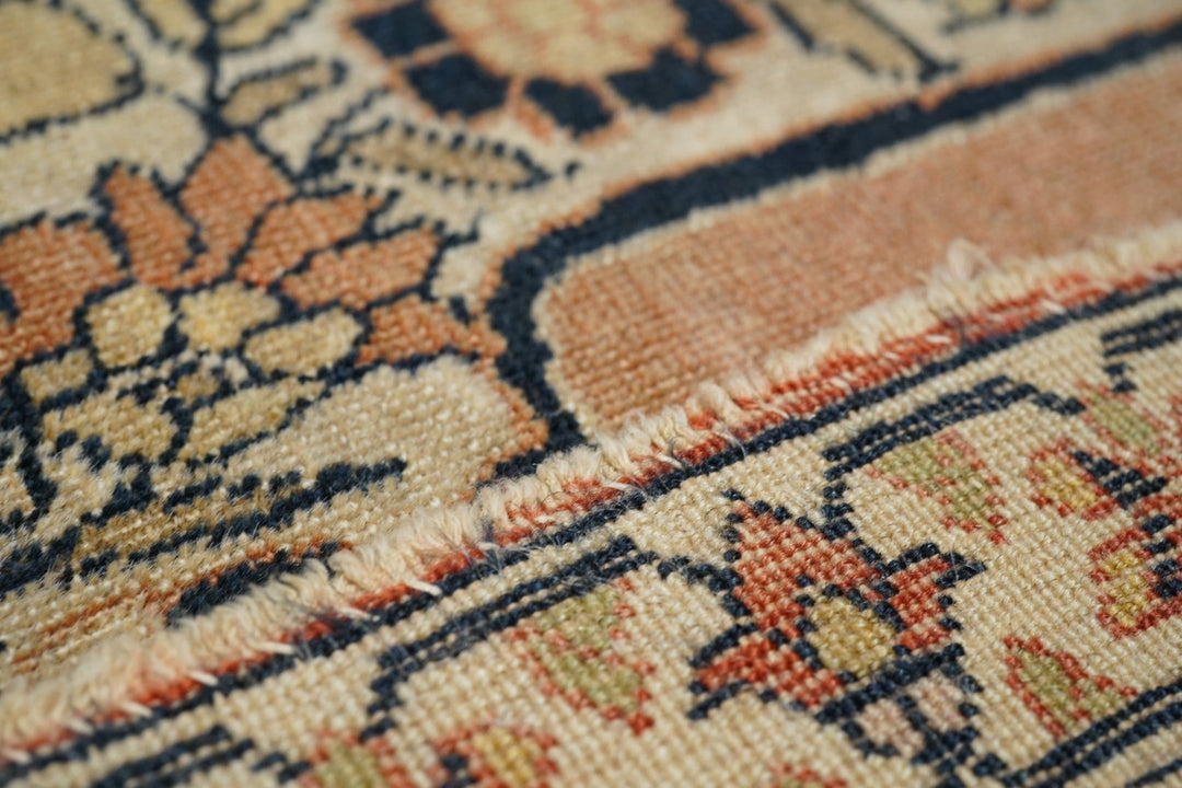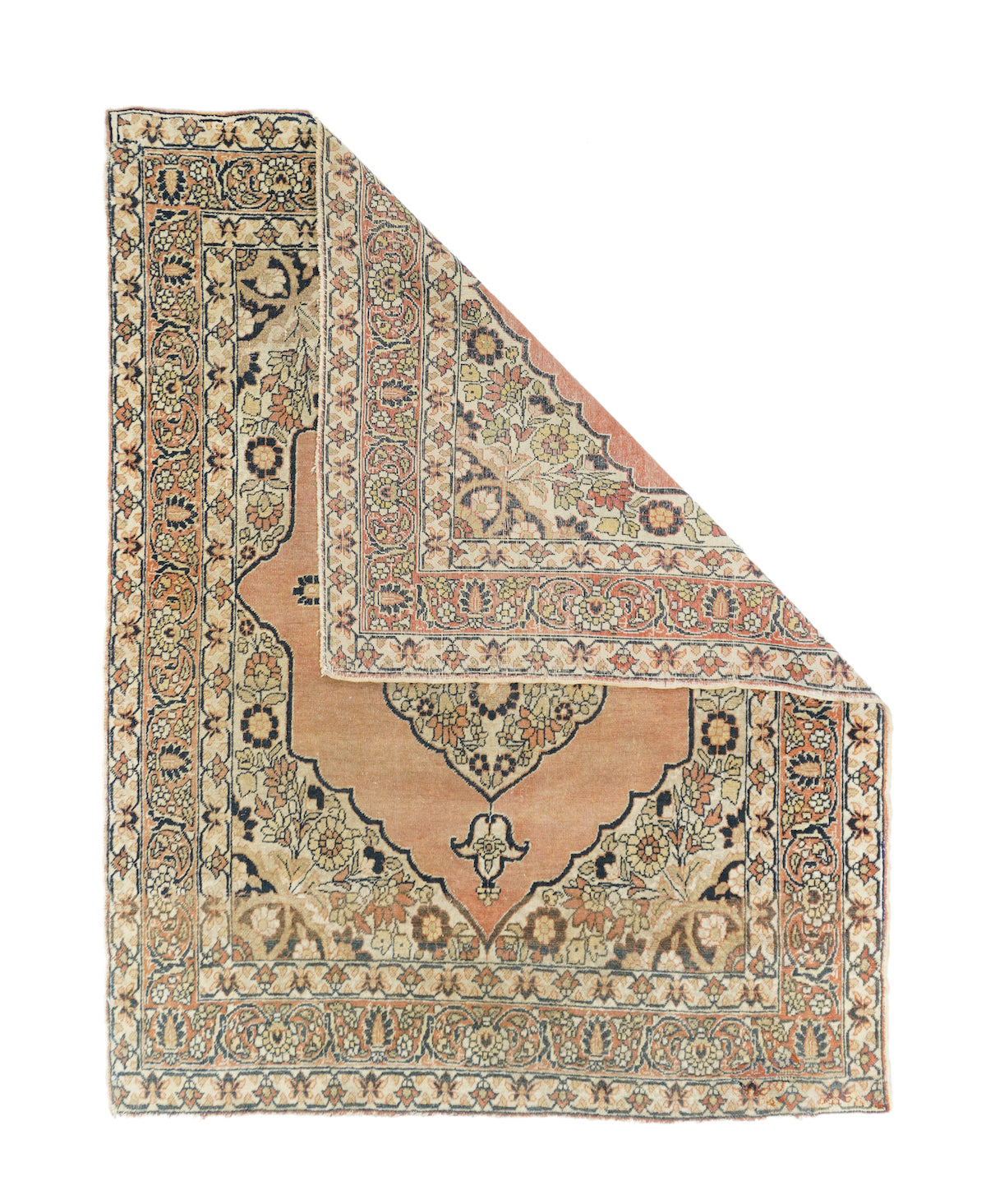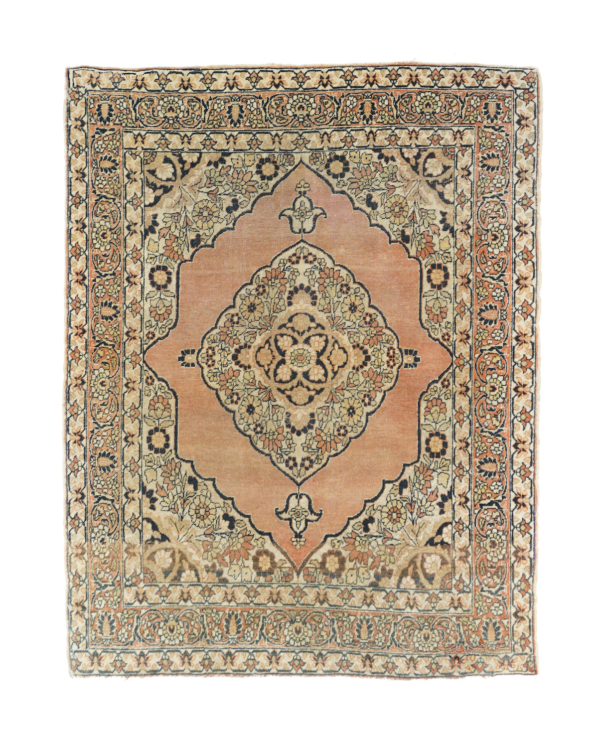 Ascribed to the famous "Hajji Jalili" workshop and definitely in its style, with an open salmon-rust sub-field supporting an ivory scalloped, four palmette pendant medallion. Ecru field with big sunflower-style rosettes. Coral-salmon strip-style border with fan and pinecone palmettes. "Bookcover" layout. Short, crisp, upright pile in a fine weave on cotton. Good condition. Right amount of color mellowing.