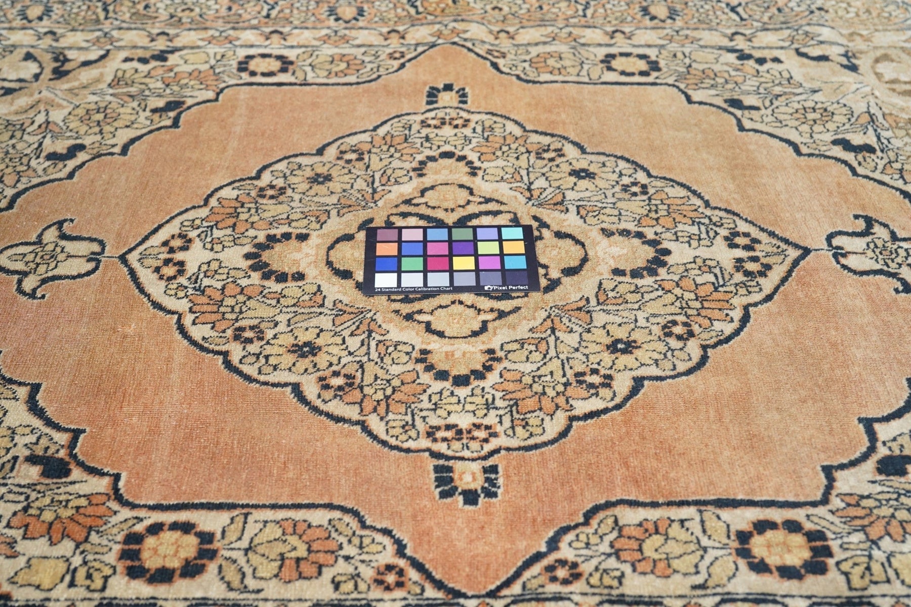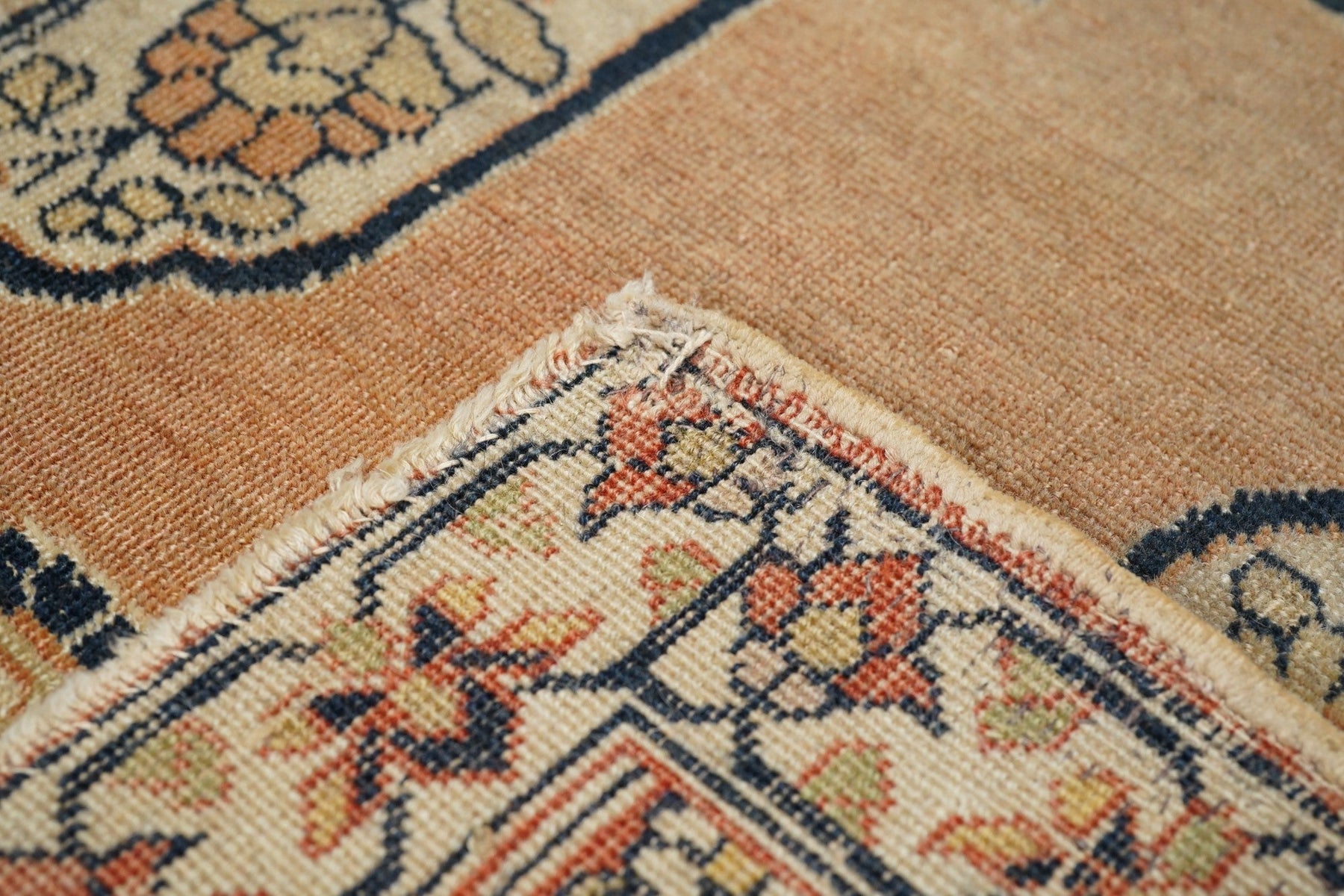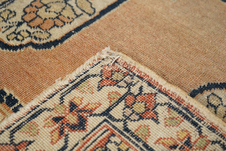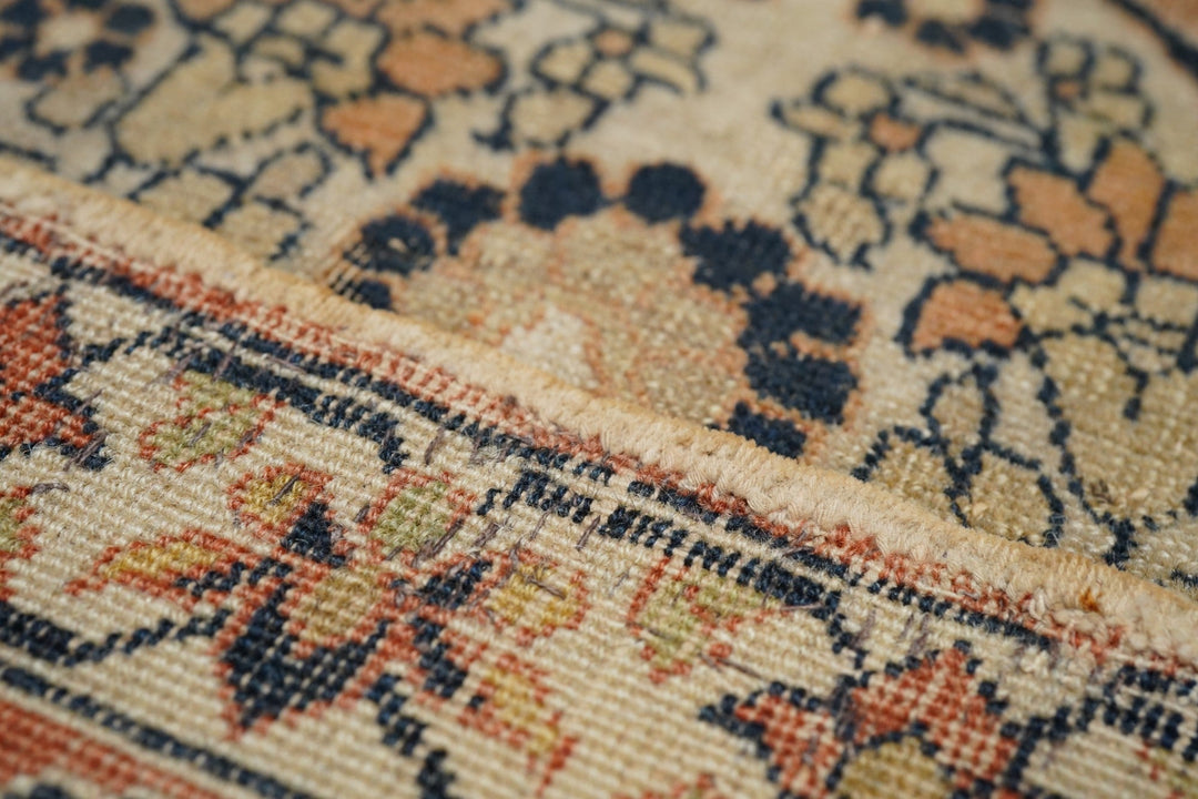 Ascribed to the famous "Hajji Jalili" workshop and definitely in its style, with an open salmon-rust sub-field supporting an ivory scalloped, four palmette pendant medallion. Ecru field with big sunflower-style rosettes. Coral-salmon strip-style border with fan and pinecone palmettes. "Bookcover" layout. Short, crisp, upright pile in a fine weave on cotton. Good condition. Right amount of color mellowing.