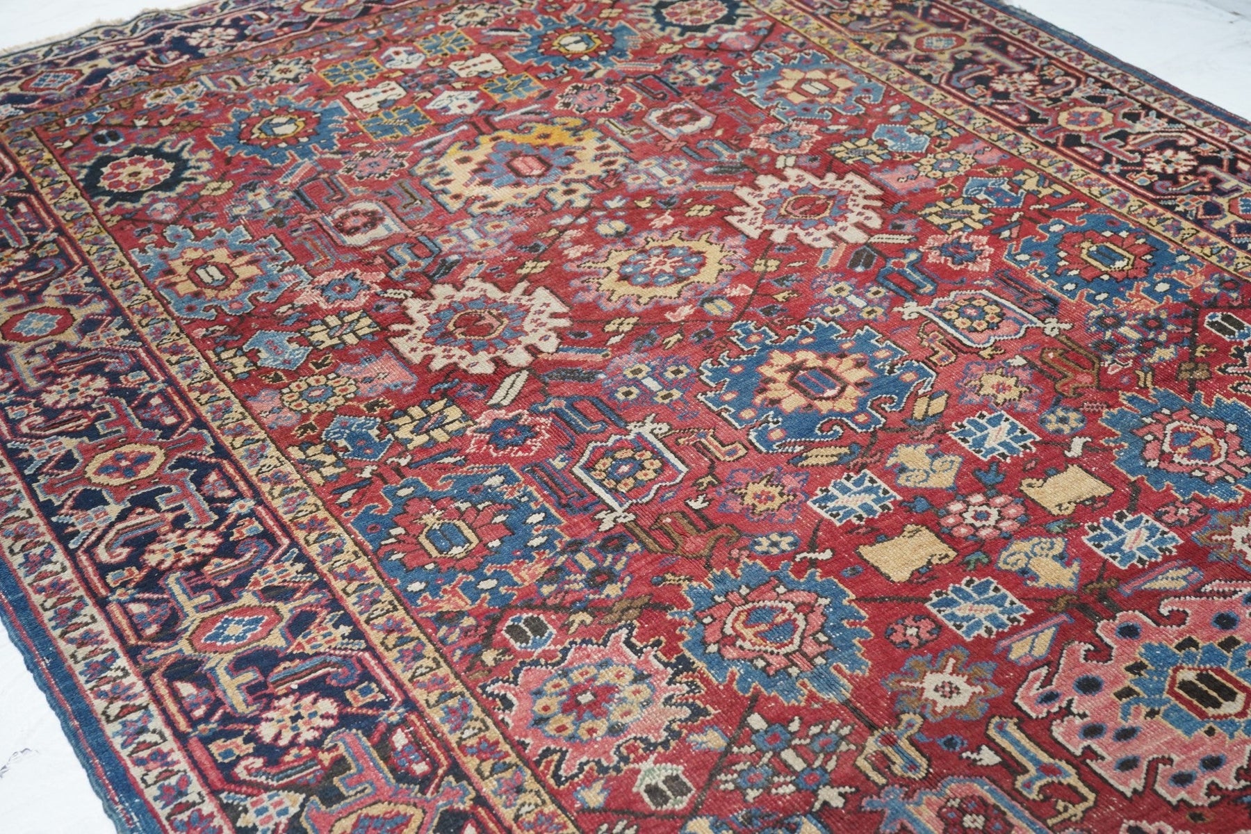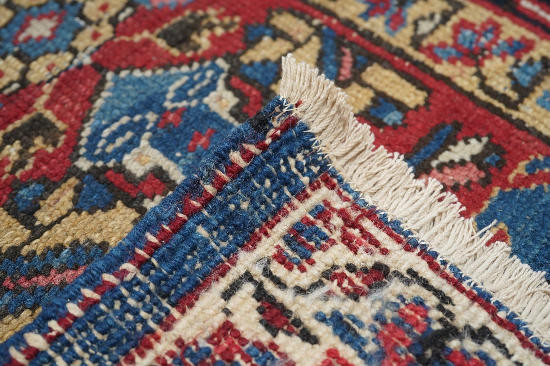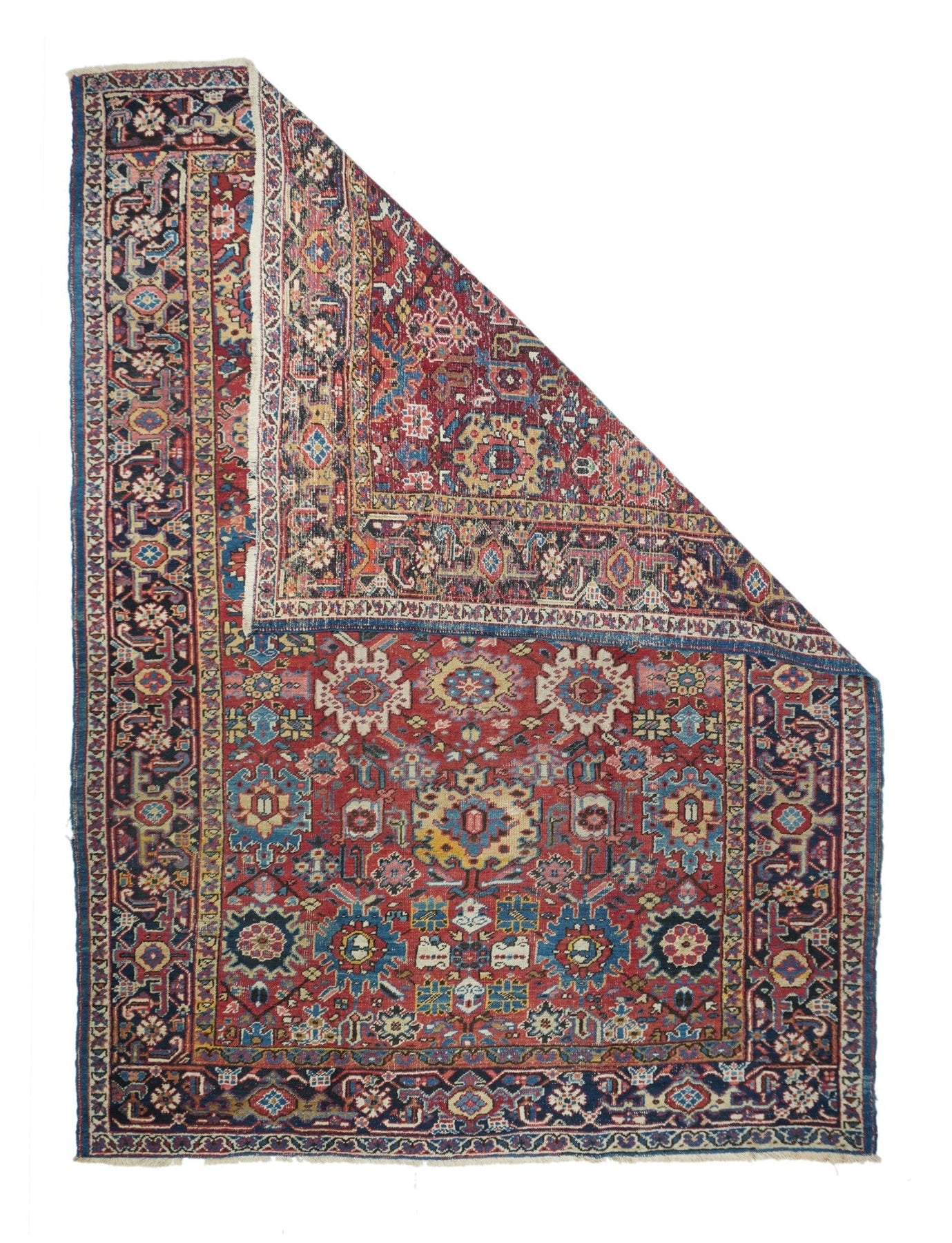 The coral field is dominated by eight giant bitonal fringed, bent and strongly hooked leaves. Teal, medium-dark blue, ecru and navy details. Light blue inner border. Navy strip style main border with reversing turtles in cream and blues/Areas of visible wear. Medium-coarse weave.
